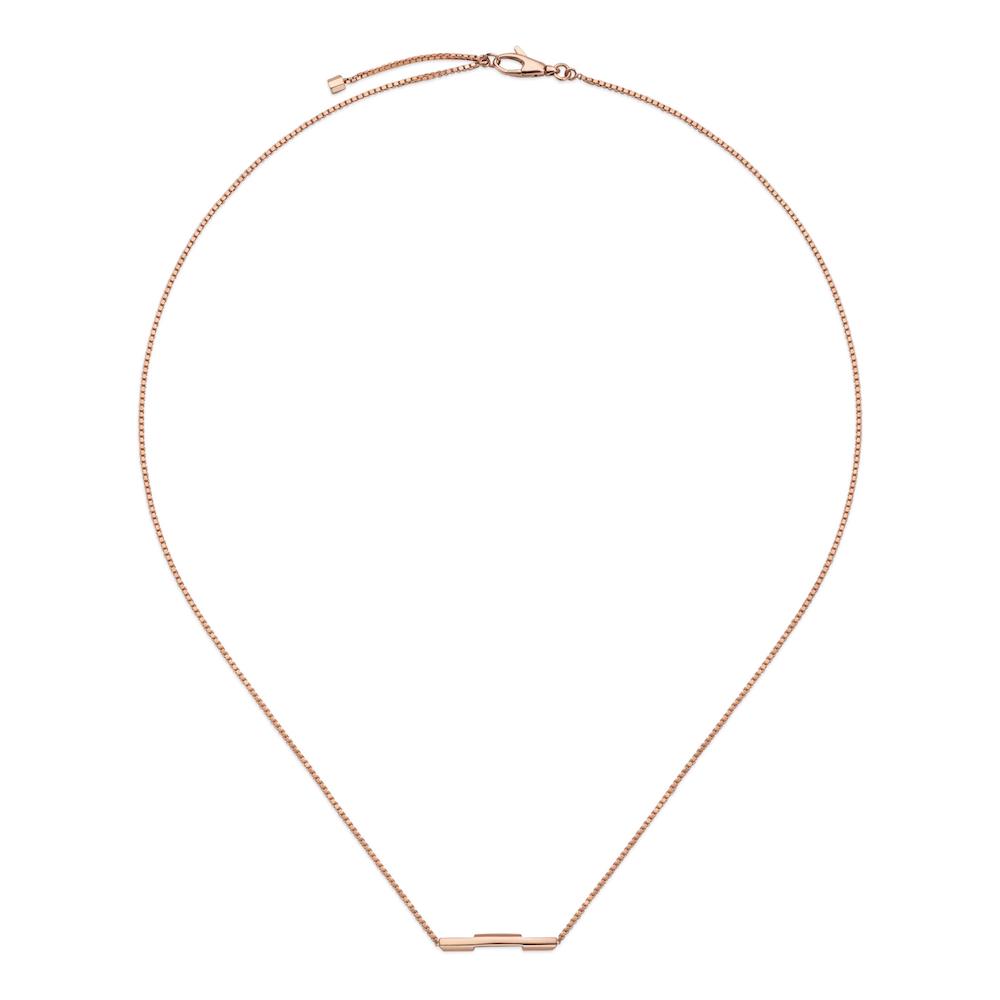 Ispirata al tema del romanticismo, la collezione Gucci Link to Love esplora i simboli dell’amore in chiave contemporanea. La collezione combina diverse tonalità di oro e un mix di finiture, sfumando i confini tra maschile e femminile. Grazie al loro design impilabile, ogni modello è creato per sperimentare nuovi modi d’indossarlo ed esprimere la propria individualità. Questa collana in oro rosa 18 carati ha un pendente a barretta con incisione ‘Gucci’.