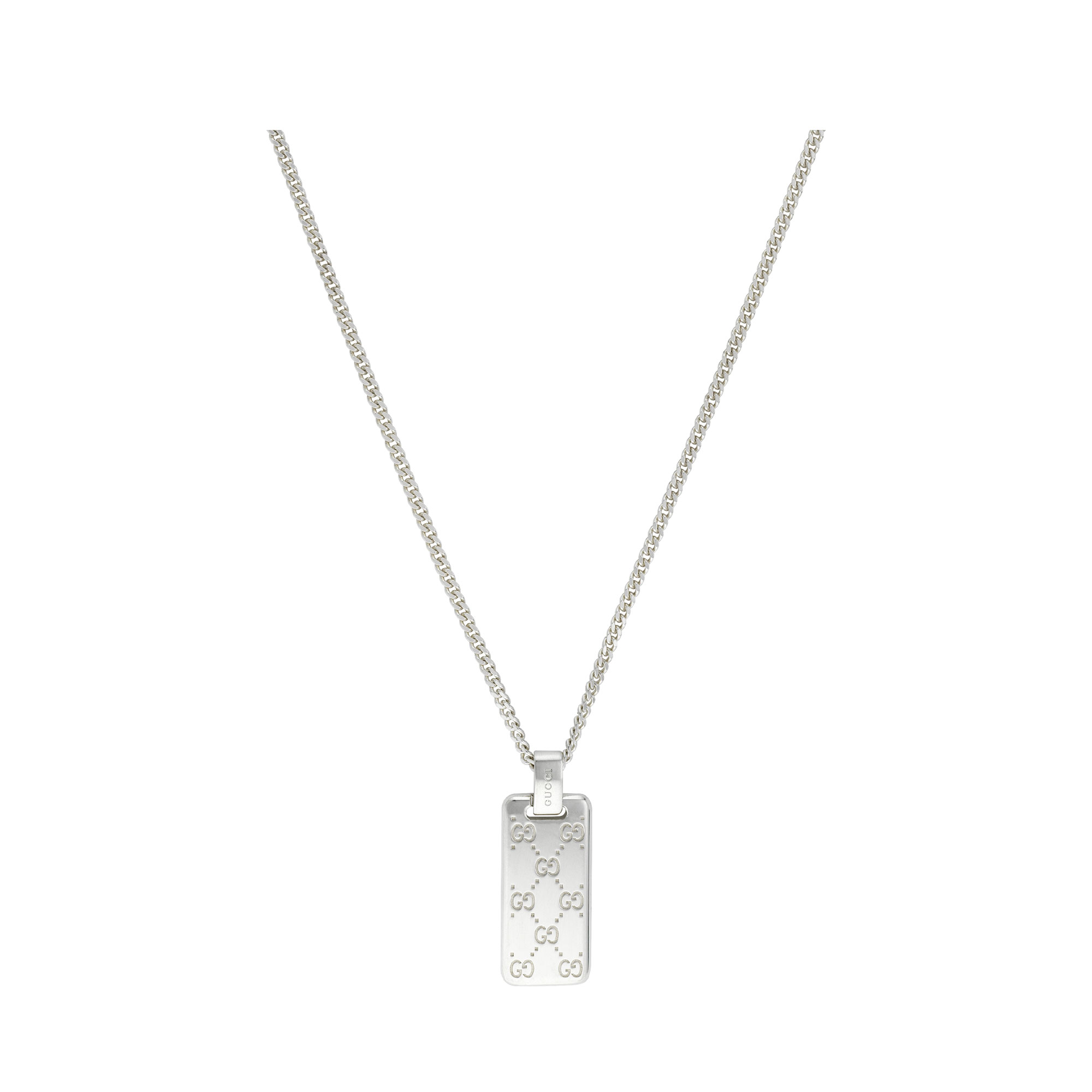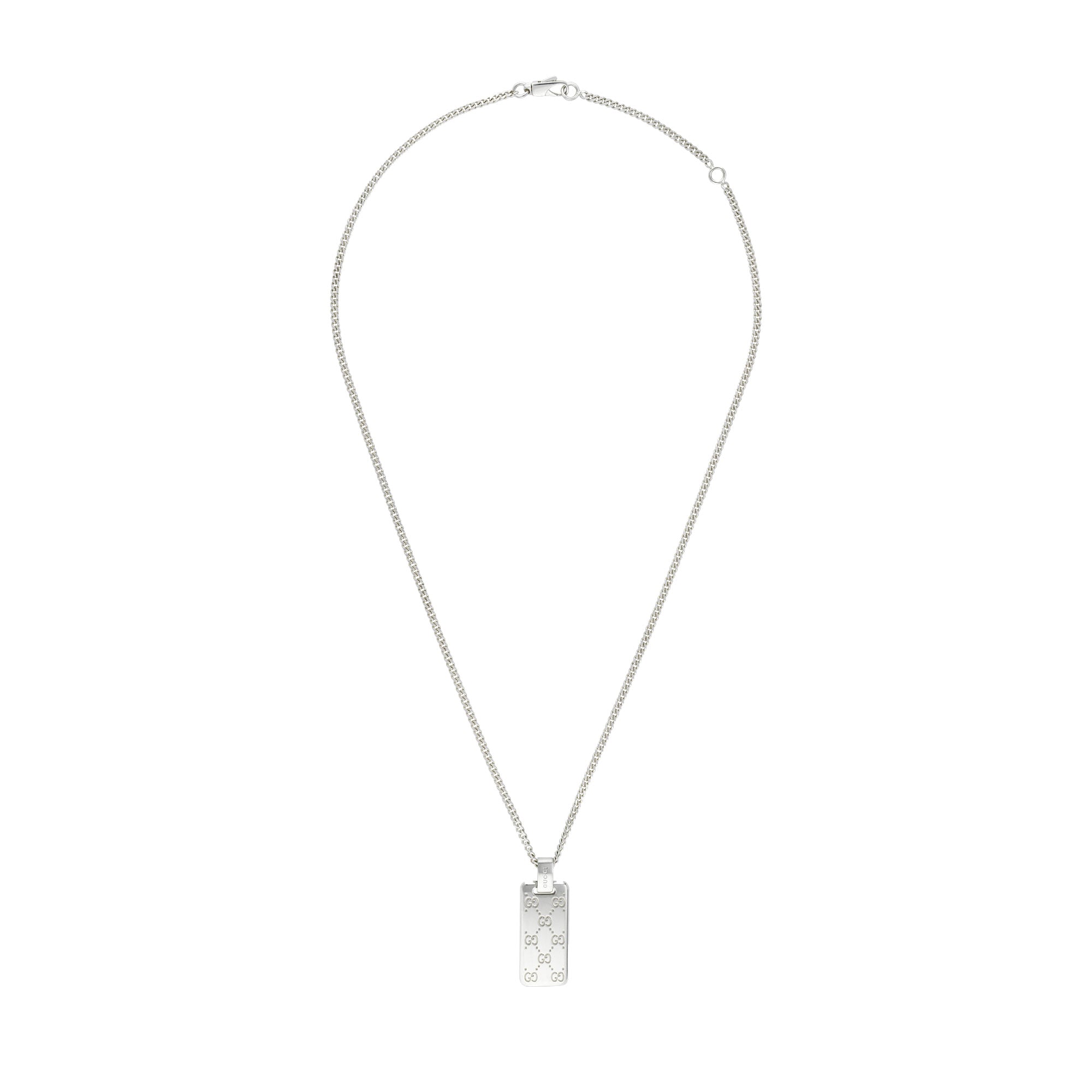 Il motivo GG ritorna e viene riproposto su una selezione di capi e accessori per tutti i giorni dal tocco contemporaneo e facili da indossare. L’incisione dell’emblematico design del logo con puntini decora la base in argento sterling lucido rivestito da una lamina che ne riduce l’ossidazione. Qui il motivo GG adorna e impreziosisce una collana a catena declinato come pendente a forma di targhetta.