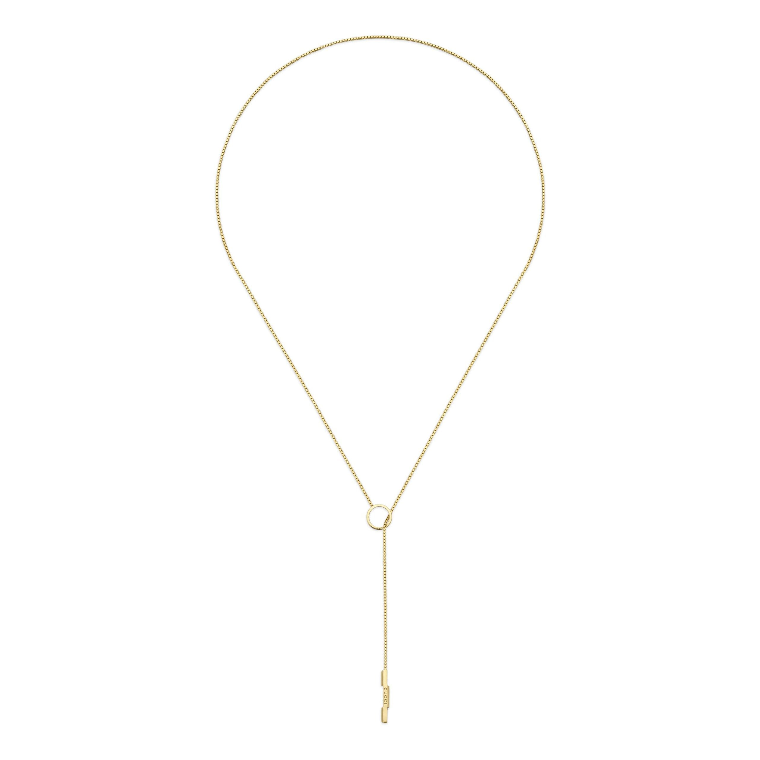 Ispirata al tema del romanticismo, la collezione Gucci Link to Love esplora i simboli dell’amore in chiave contemporanea. La collezione combina diverse tonalità di oro e un mix di finiture, sfumando i confini tra maschile e femminile. Grazie al loro design impilabile, ogni modello è creato per sperimentare nuovi modi d’indossarlo ed esprimere la propria individualità. Questa collana lariat in oro giallo 18 carati ha un pendente a barretta con incisione ‘Gucci’.