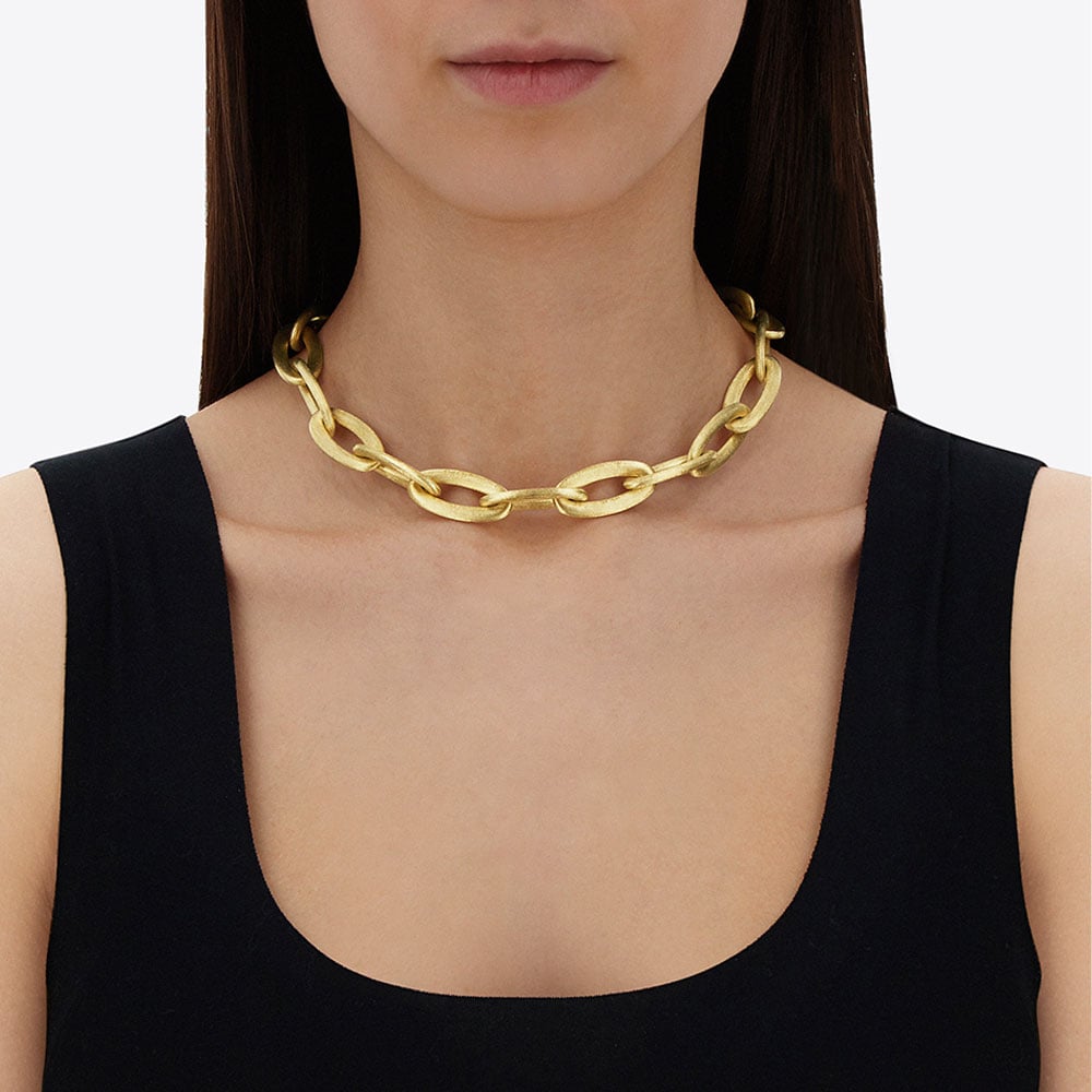Sensualità, contemporaneità e savoir faire raggiungono la loro massima espressione in questa collana in oro 18kt della collezione ICON. Un gioiello dalla linea inconfondibile, nel quale il design della catena, da sempre caro all’azienda, incontra la distintiva sinuosità e rotondità del tratto Nanis.