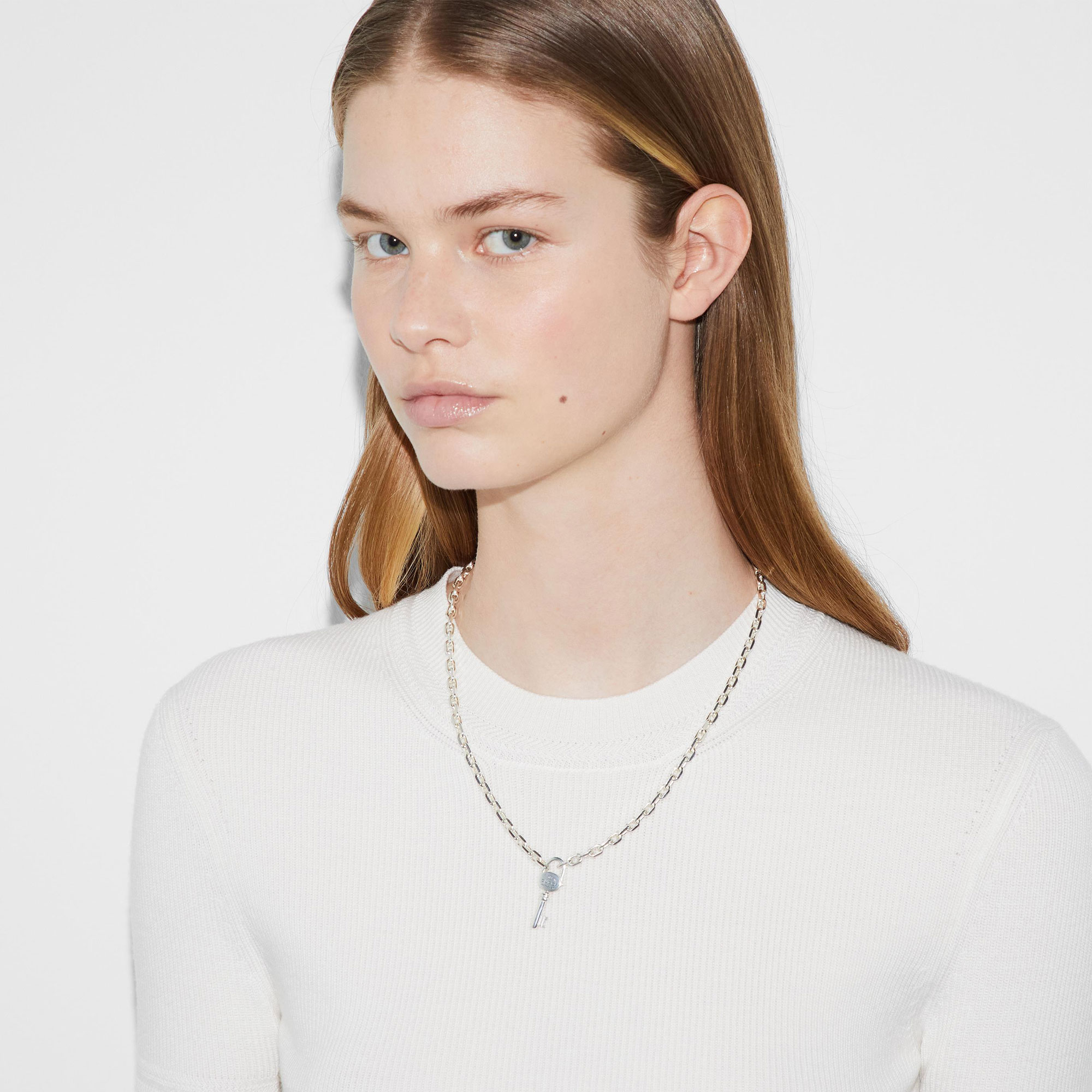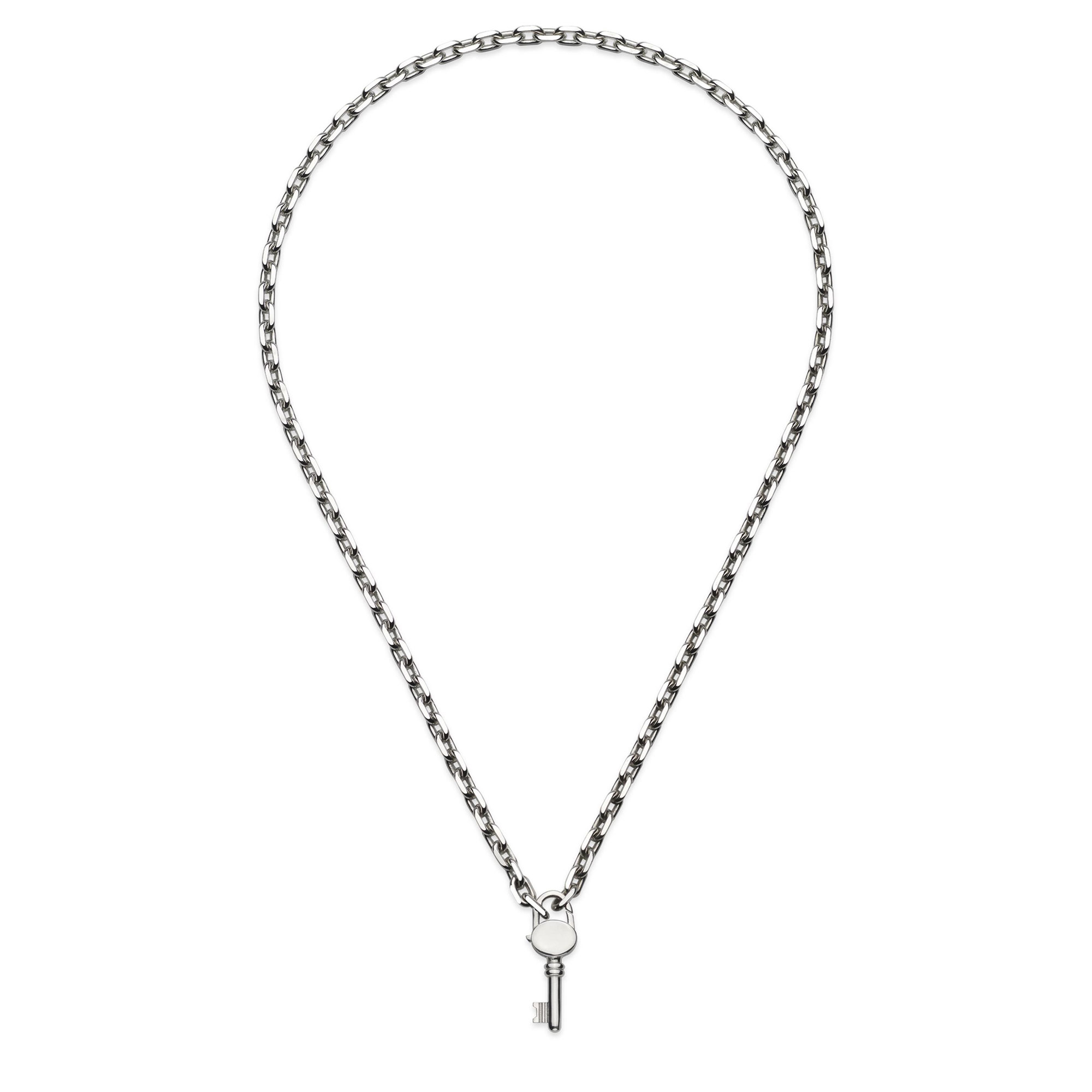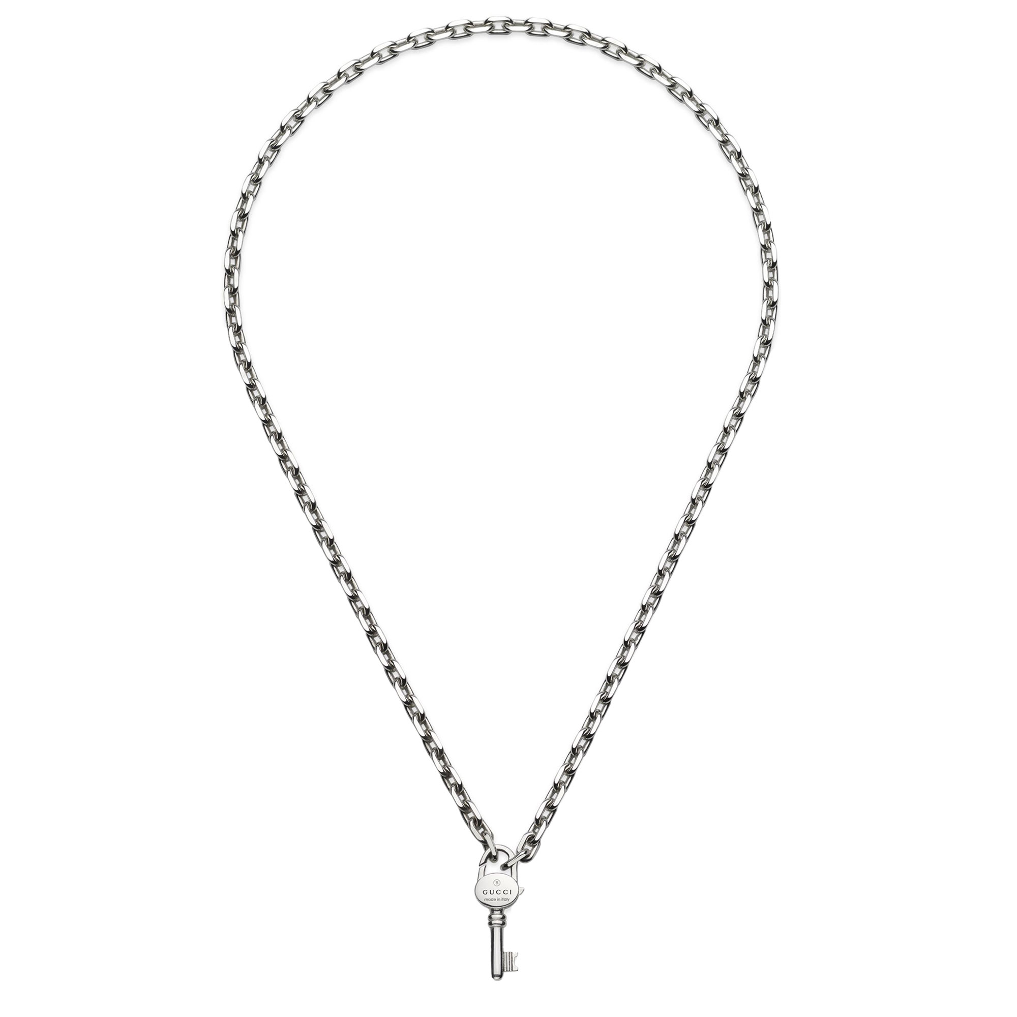 La linea Gucci Trademark unisce motivi e dettagli a bullone esagonali con il nome della Maison. Dal cuore cut-out al lucchetto, simboli divertenti continuano a caratterizzare una selezione di anelli, collane, bracciali e orecchini per la collezione Pre-Fall 2024. La chiave con incisione Gucci Trademark definisce questa collana a catena in argento sterling.