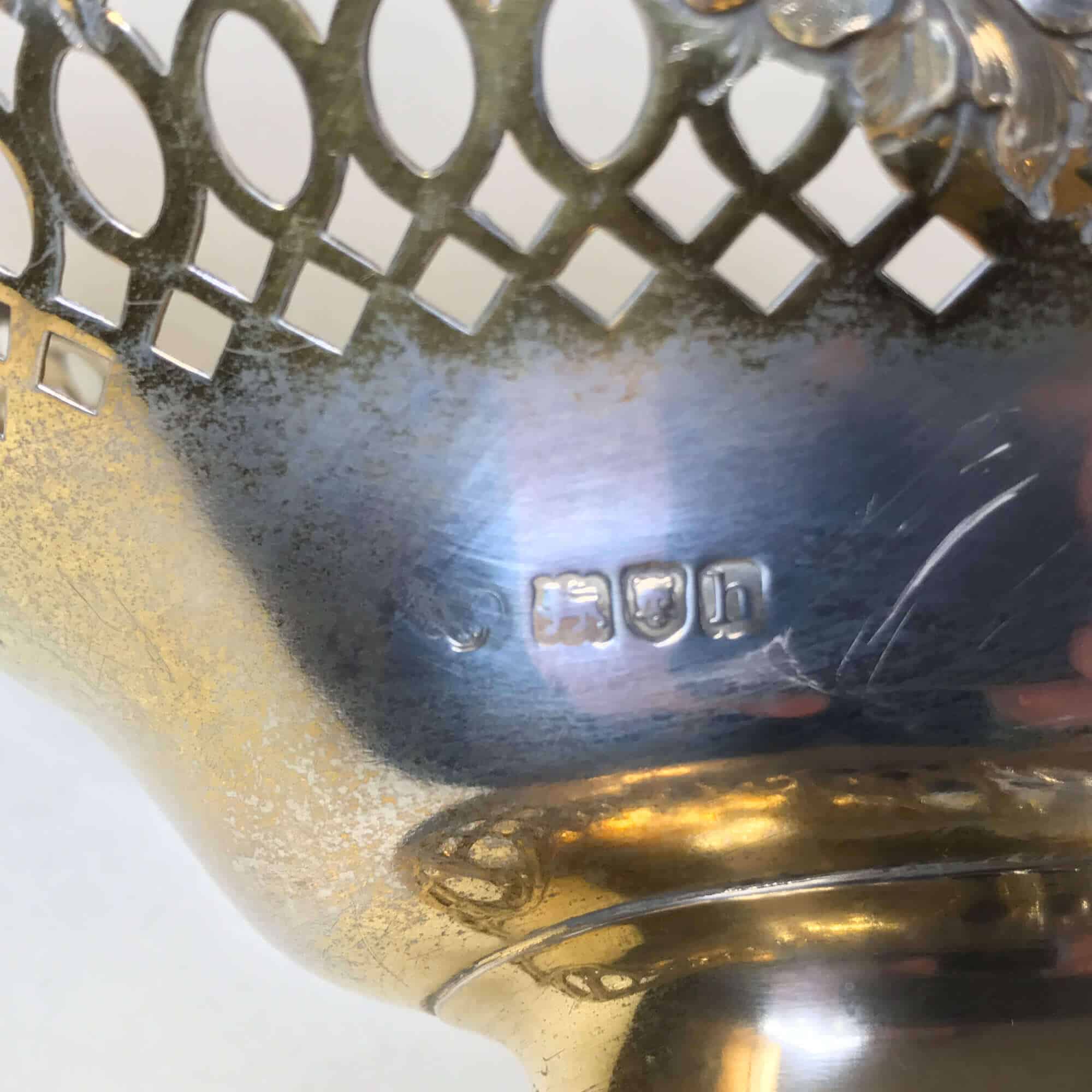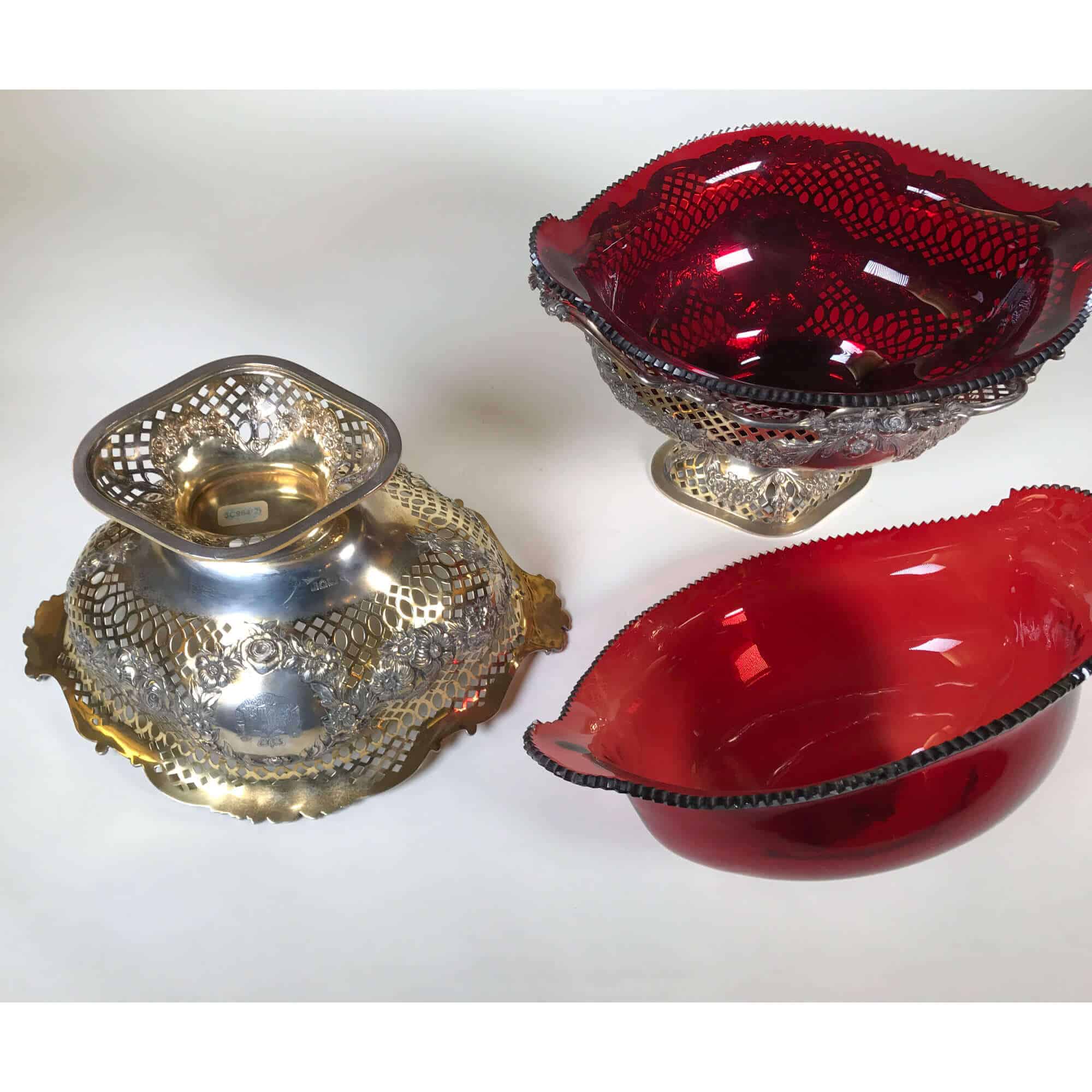 SKU: M1273Coppia di alzate in argento traforato vermeil con vetri originali. Inghilterra, città di Londra 1840. Peso gr.2.100 altezza cm.17