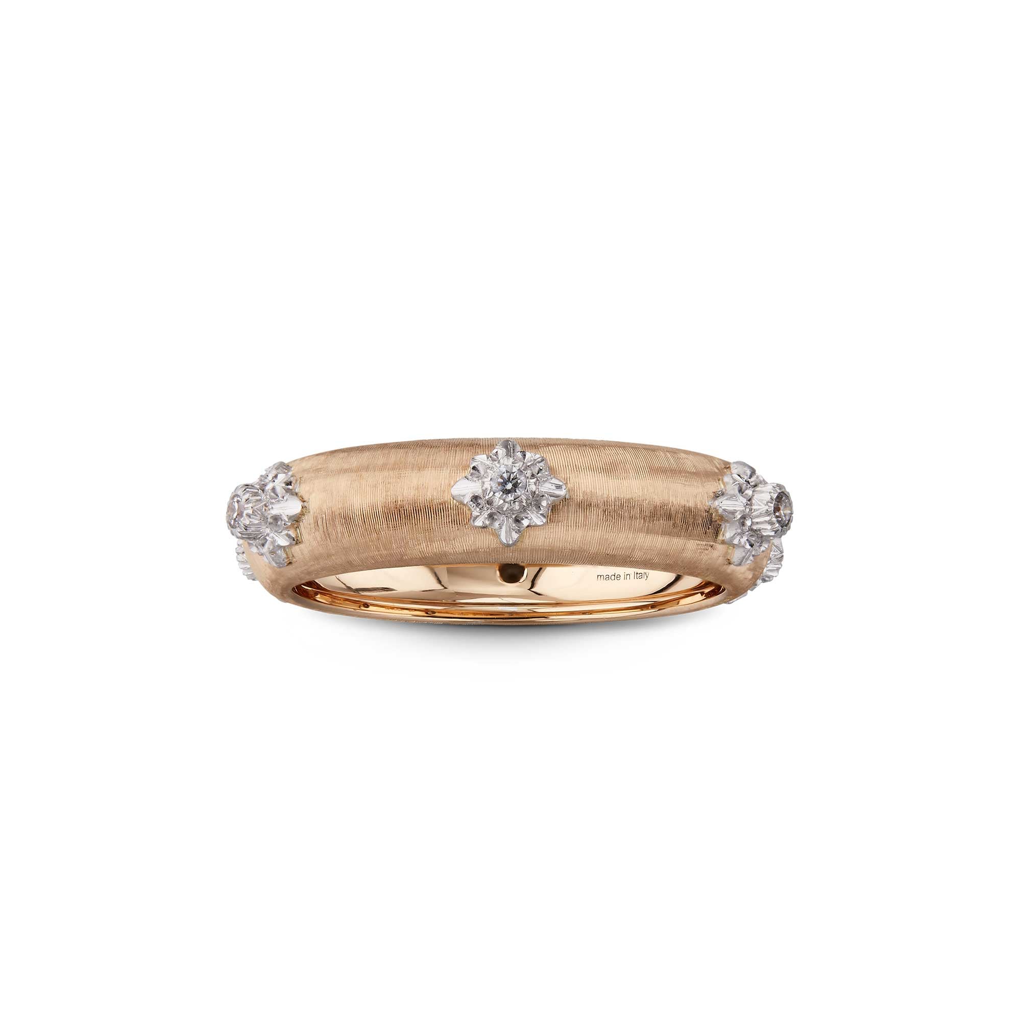 L’effetto rigato, ottenuto attraverso l’incisione a mano, raggiunge nella collezione Macri il suo massimo virtuosismo. La superficie è mossa e impreziosita dai brillanti incastonati in piccole rosette a stella. Luminose sferette d’oro lucido giocano con l’opacità della texture e con le luci dei diamanti.