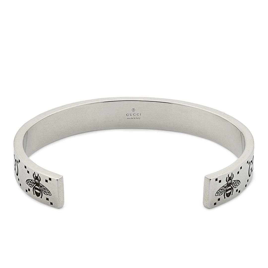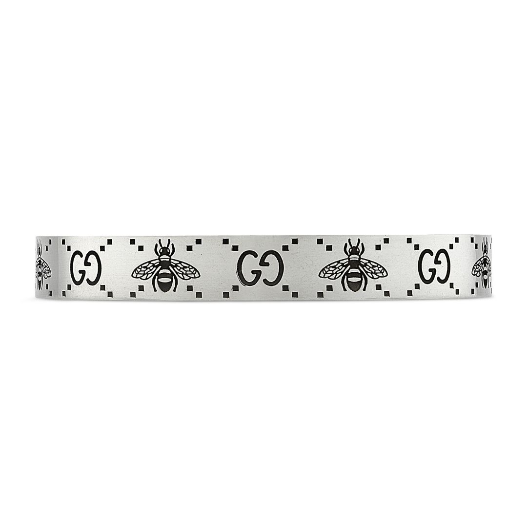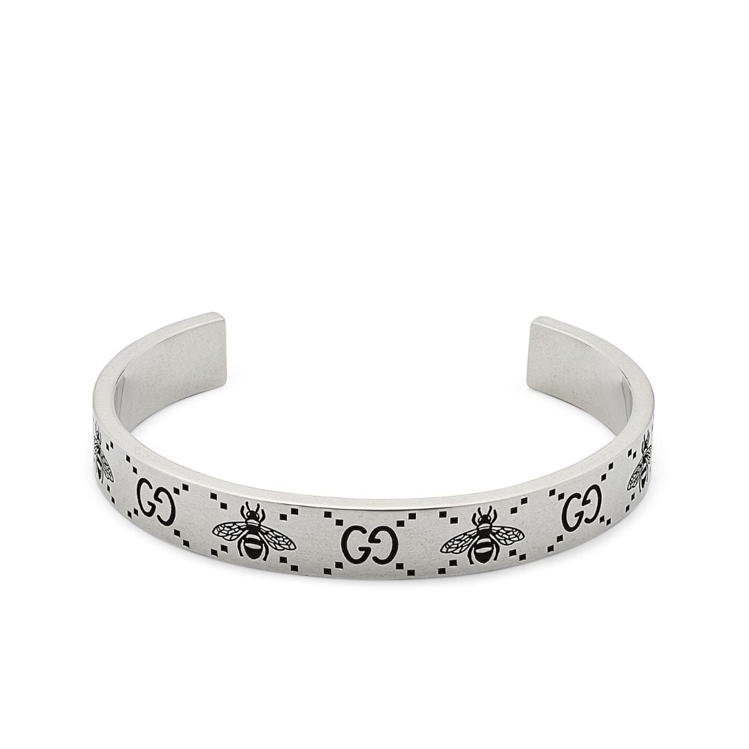 Lo storico motivo GG compare accanto a uno dei simboli preferiti della Maison, l’ape. Il tocco contemporaneo del design richiama l’approccio gender-fluid che si ritrova in tutta la collezione. I due emblemi incisi sono il dettaglio che definisce il design di questo bracciale in argento sterling.
