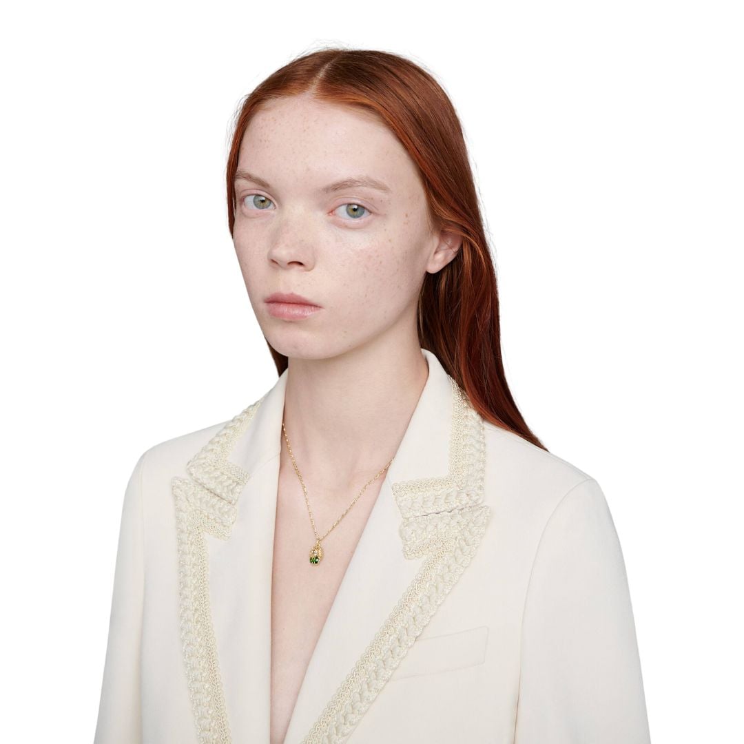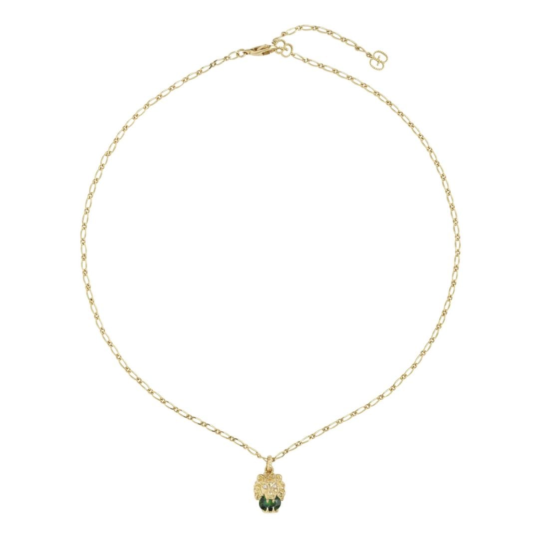 Tra i design essenziali della Maison, la collana con pendente a testa di leone è presentata in oro giallo 18 carati, con preziosi diamanti bianchi incastonati negli occhi. Parte dell’ispirazione al mondo della natura e degli animali selvaggi che pervade l’immaginario Gucci, il leone regge tra le fauci una pietra verde.