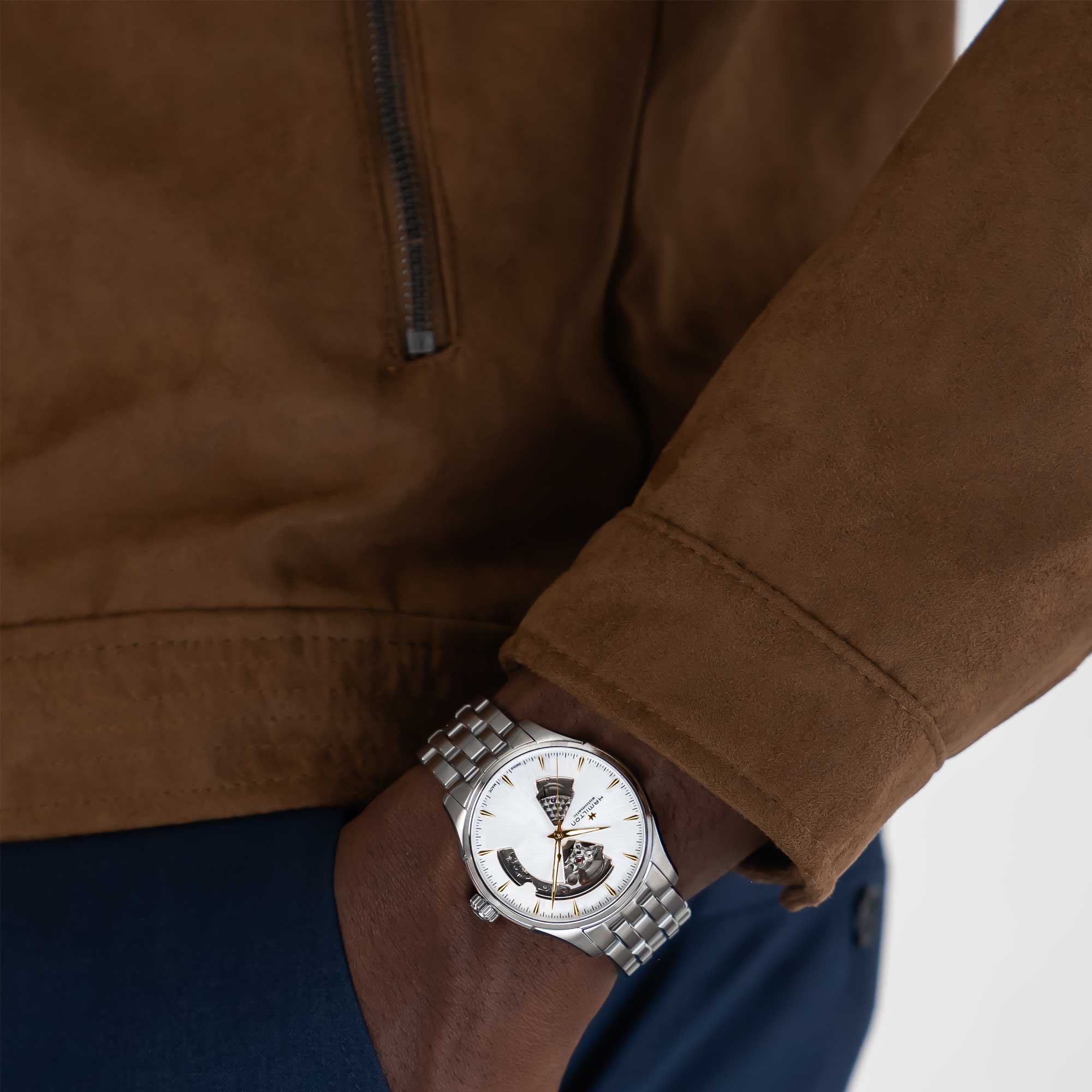 Il Jazzmaster Open Heart 40 mm, con il suo quadrante traforato bianco, punta tutto sulla precisione e rivela al contempo la raffinata bellezza del movimento meccanico al suo interno. Mettendo in risalto il movimento automatico H-10, con una riserva di carica di 80 ore e spirale in Nivachron™, il Jazzmaster Open Heart vanta un sofisticato bracciale in acciaio, che incarna il savoir-faire in continua evoluzione di Hamilton e l’attenzione ai dettagli.