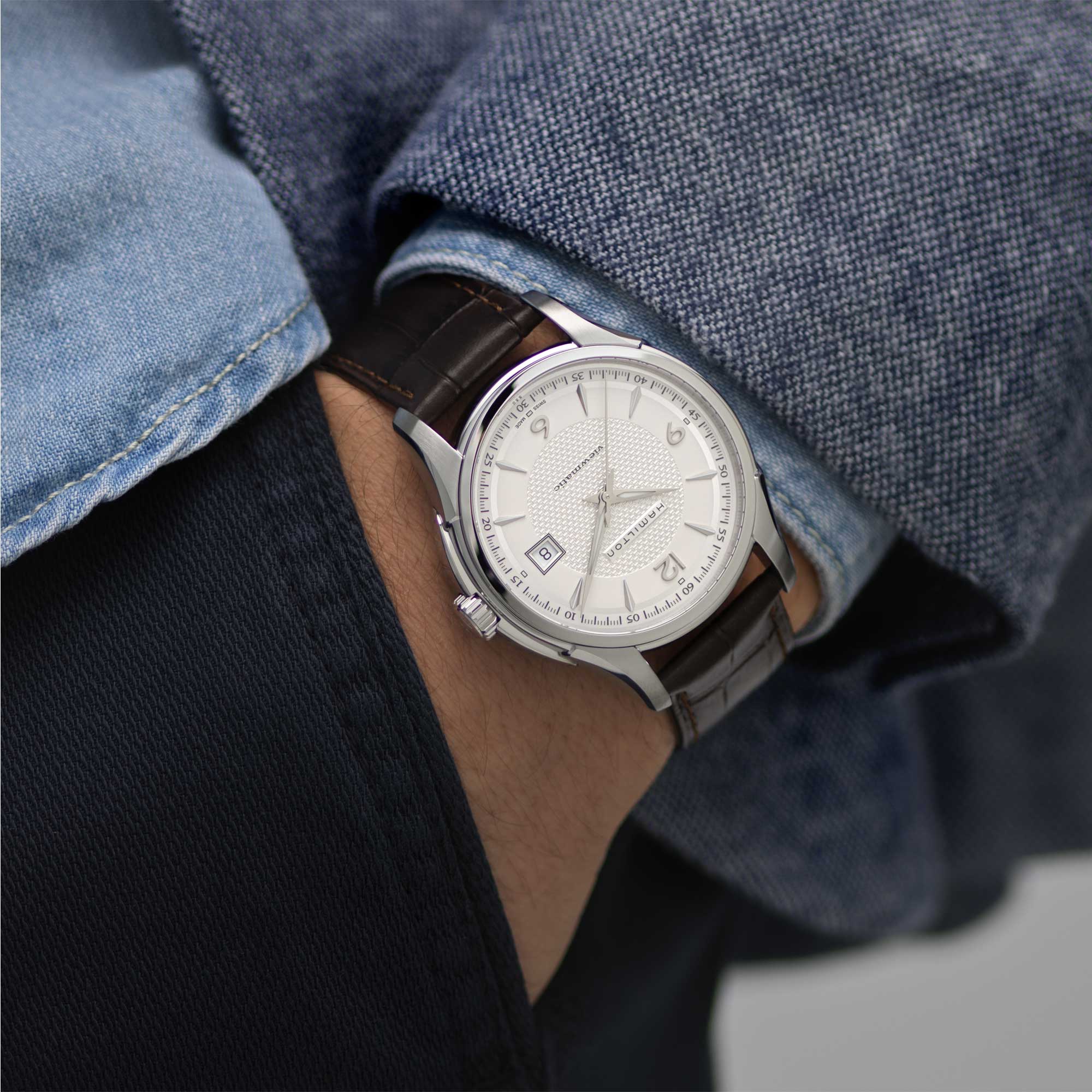 JAZZMASTER VIEWMATIC AUTO QUADRANTE ARGENTO CINTURINO IN PELLE 40 MM
