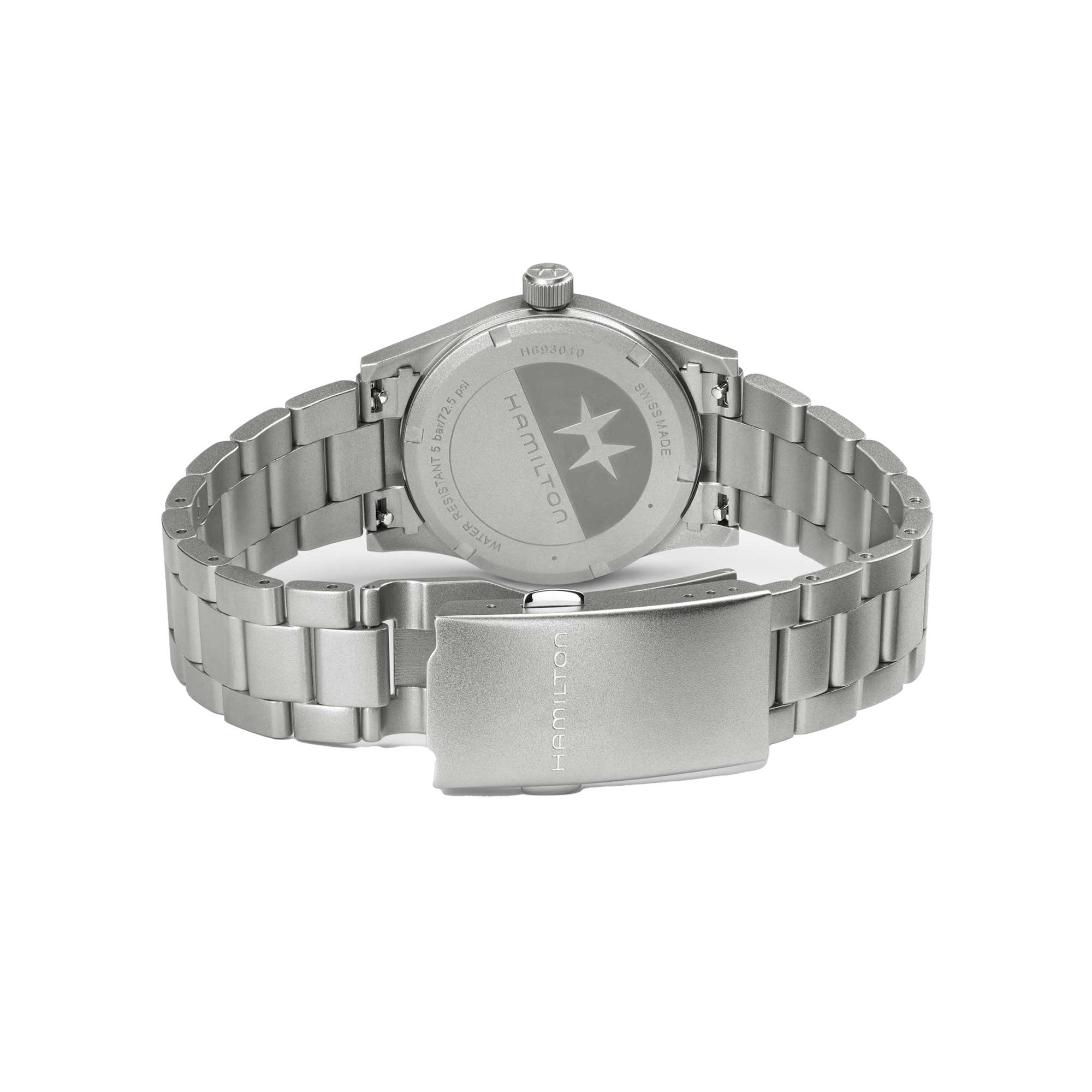 Perfetto per le tue avventure, il Khaki Field Quartz è un compagno affidabile e resistente, pronto per ogni esplorazione. Ispirato alla tradizione di precisione, innovazione e design funzionale di Hamilton, il Khaki Field Quartz combina un classico quadrante bianco da 38 mm con un moderno bracciale in metallo, offrendo uno stile intramontabile. Scopri la nostra collezione Khaki Field.