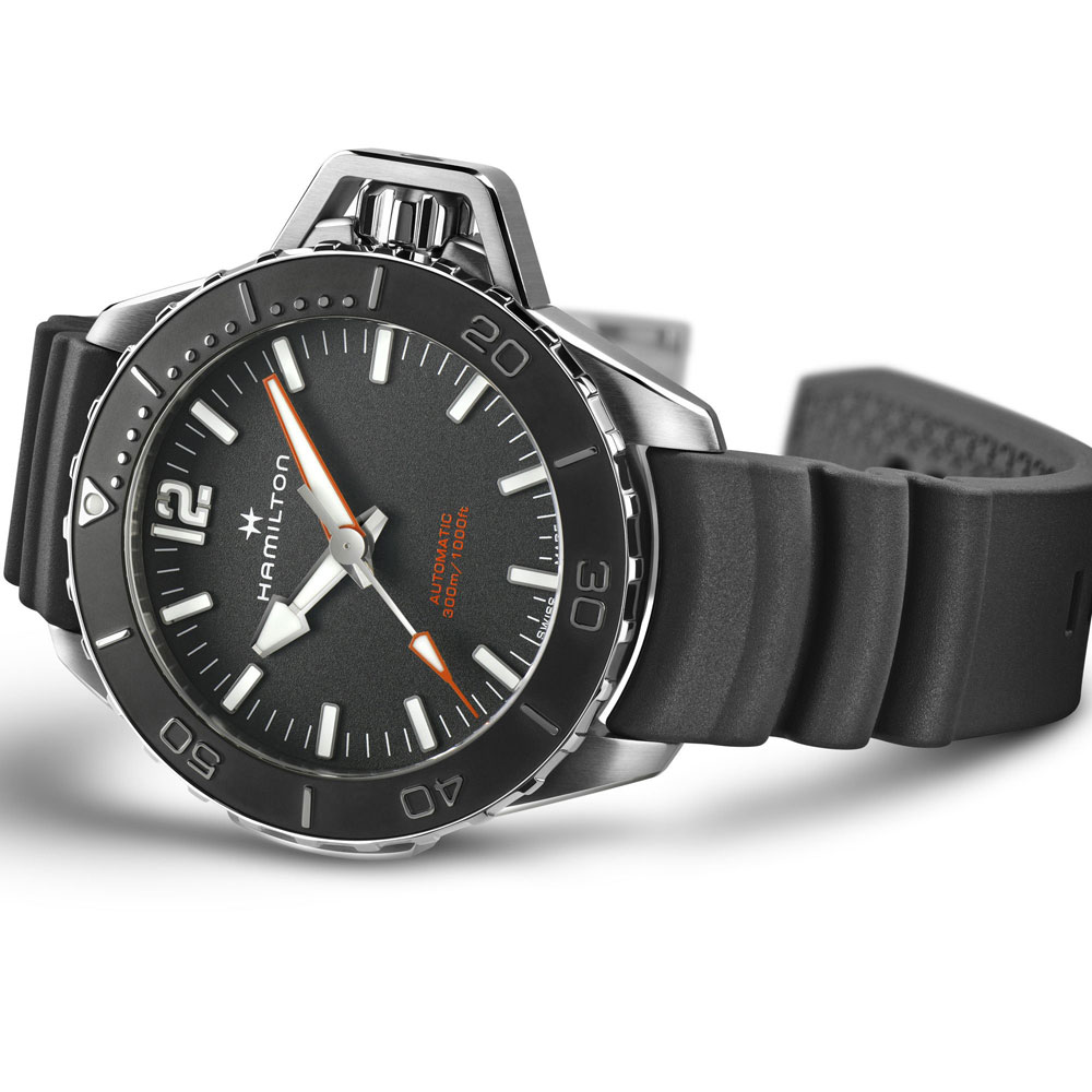 Con un nuovo look audace, il Khaki Navy Frogman Automatic è l’orologio Hamilton tecnicamente migliore per le avventure in mare. Progettato per garantire precisione, leggibilità e resistenza, porta l’insondabile potenza dell’oceano al polso. È inoltre dotato di una protezione della corona dalla forma unica, e di un cinturino in caucciù ondulato.