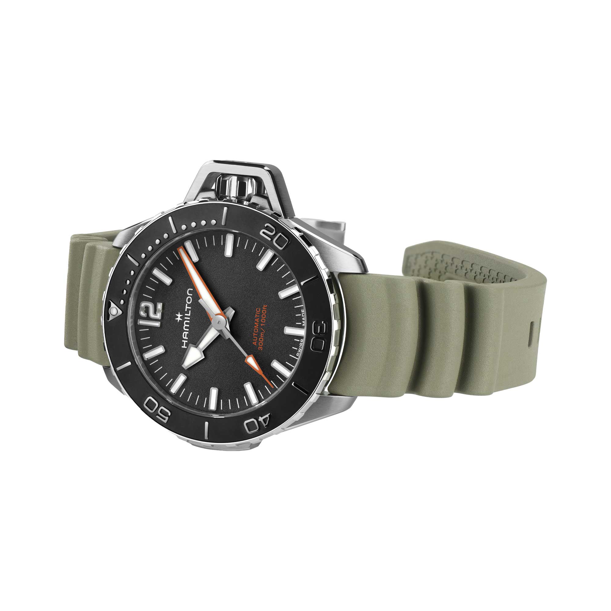Il Khaki Navy Frogman Automatic si distingue per le prestazioni tecniche e l’iconico design. La sua cassa in acciaio da 41 mm è dotata di una corona a vite protetta da un robusto copricorona a forma di ponte per garantire l’impermeabilità fino a 30 bar (300 m), un omaggio al design del Frogman originale.