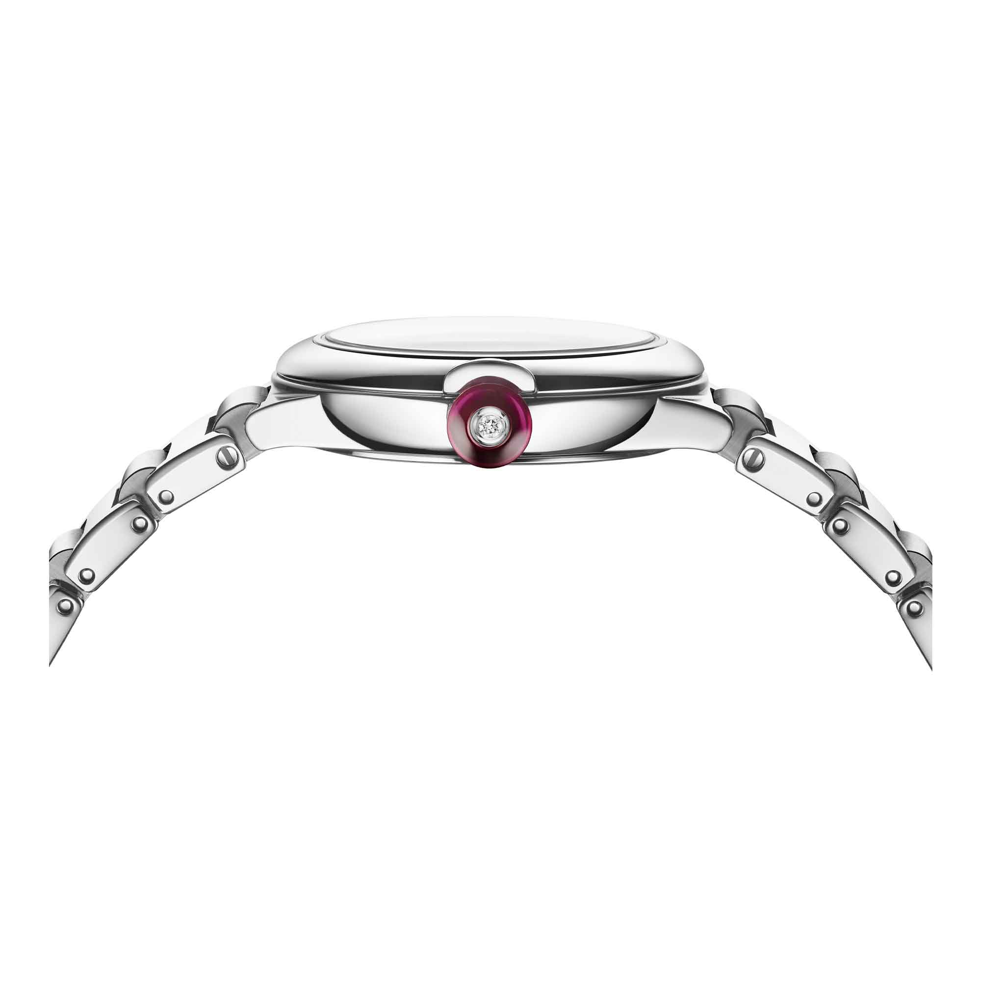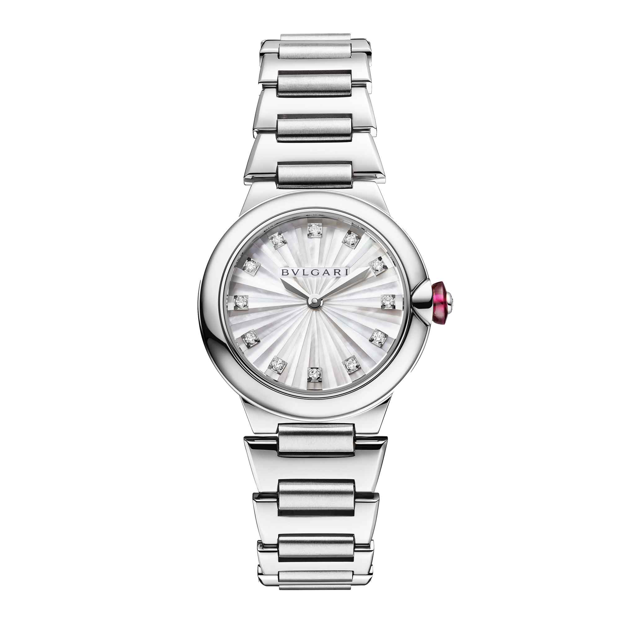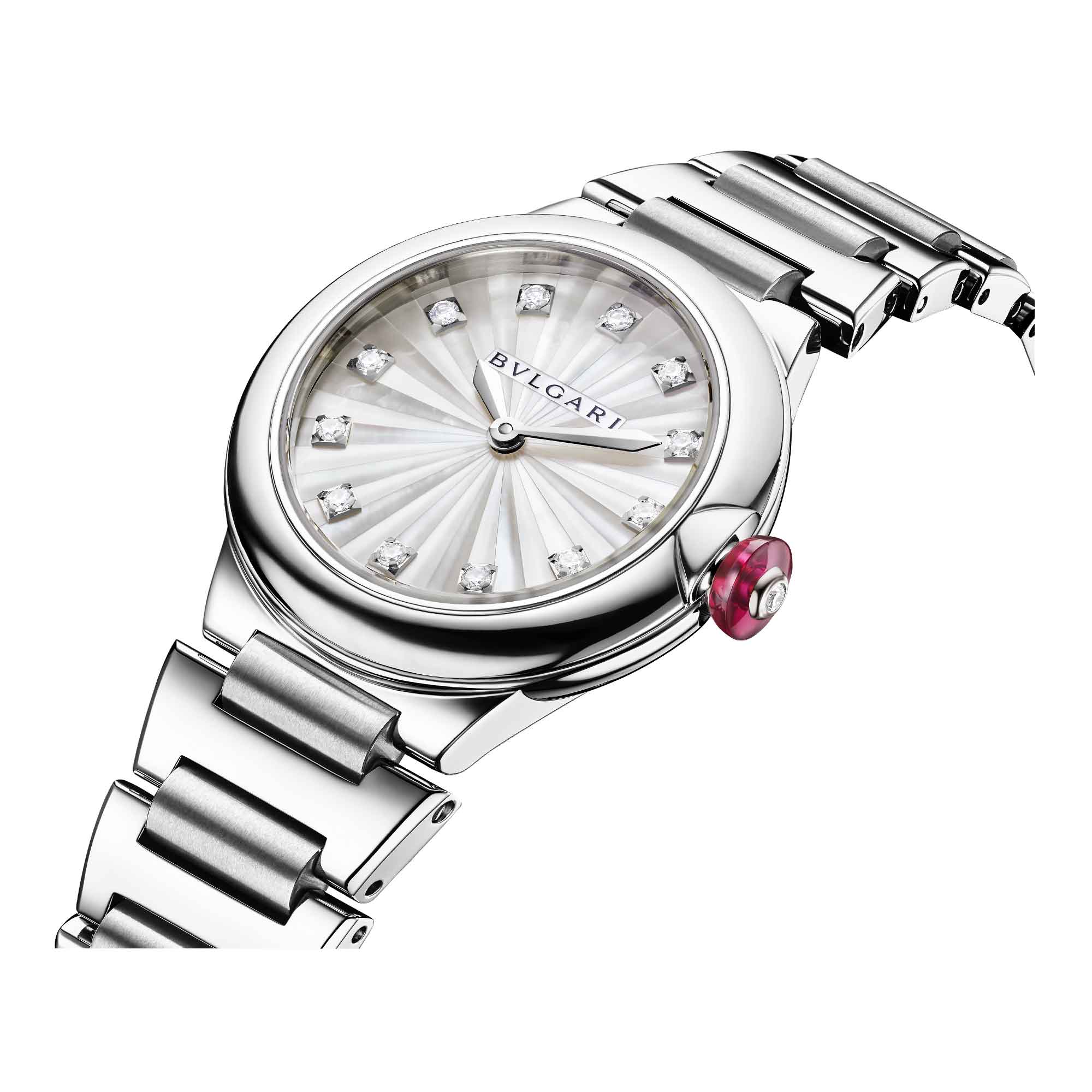 Simbolo di una femminilità moderna e radiosa, l’orologio Lvcea dona un tocco di glamour allo stile di ogni giorno. Infuso di eccezionale maestria artigianale, quest’orologio in acciaio inossidabile lucido e satinato-spazzolato è un emblema dell’eccellenza di Bvlgari nell’arte della gioielleria e dell’orologeria. Adornato da indici con diamanti, il quadrante tridimensionale si compone di elementi in madreperla bianca, singolarmente sfaccettati ed assemblati per evocare i raggi del sole. Una classica tecnica Métiers d’Art ispirata all’antica lavorazione ad intarsio.