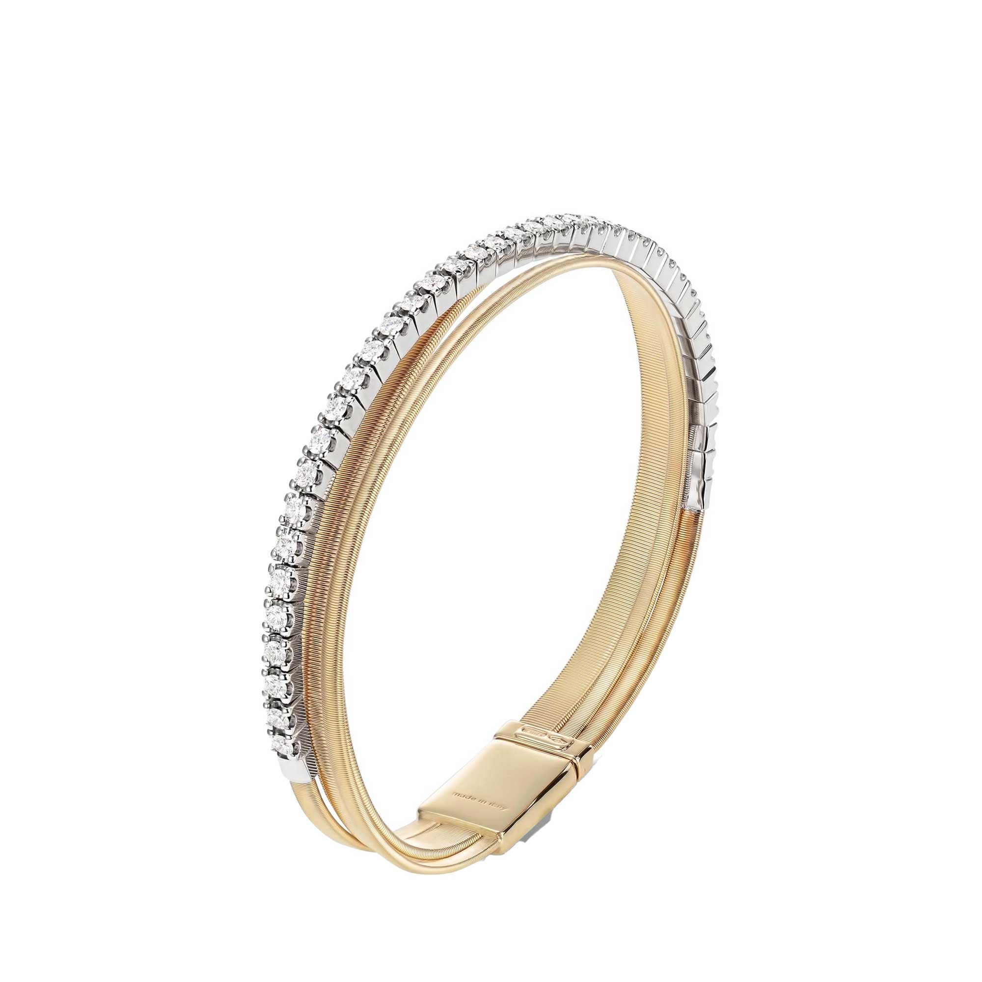 Dal design raffinato, questo bracciale a tre fili di spirale piatta, realizzata grazie all’esclusiva lavorazione artigianale del coil, è impreziosito da un elegante tennis di diamanti taglio brillante. In oro giallo 18kt, è una vera icona senza tempo, rivisitata in chiave moderna.