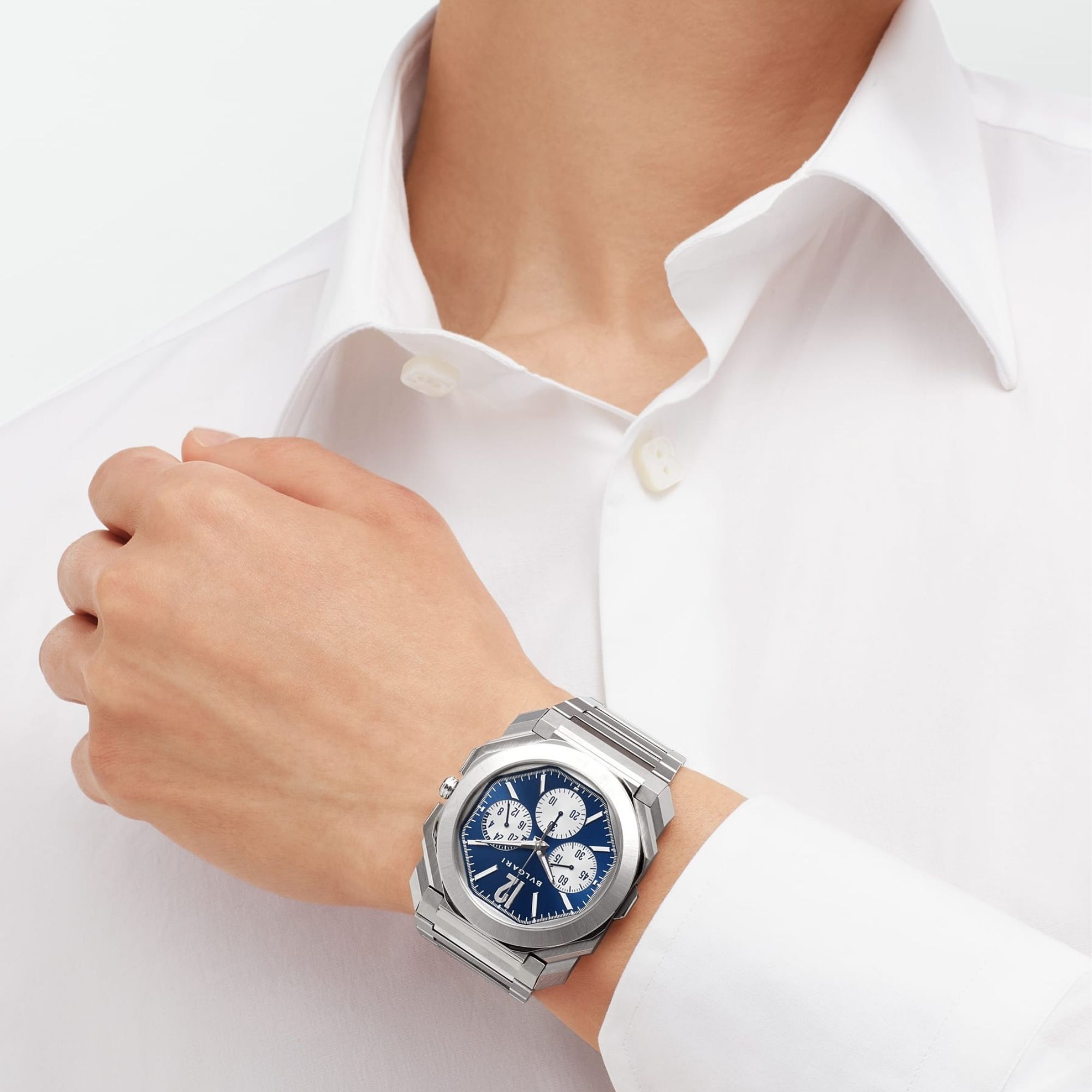 Orologio Octo Finissimo Chronograph GMT con movimento meccanico di manifattura a carica automatica, cronografo GMT 24h, ore, minuti, piccoli secondi, secondo fuso orario, calibro BVL 318 (spessore 3,30 mm), riserva di carica di 55 ore, 28.800 VpH (4Hz). Cassa di 43 mm in acciaio inossidabile (spessore 8,75 mm), corona in acciaio inossidabile con inserto in ceramica, fondello a vista, quadrante blu con finiture lucide-satinate (circolari e verticali) e contatori argento, bracciale in acciaio lucido-satinato con fibbia déployante a tre lame. Impermeabile fino a 100 metri.