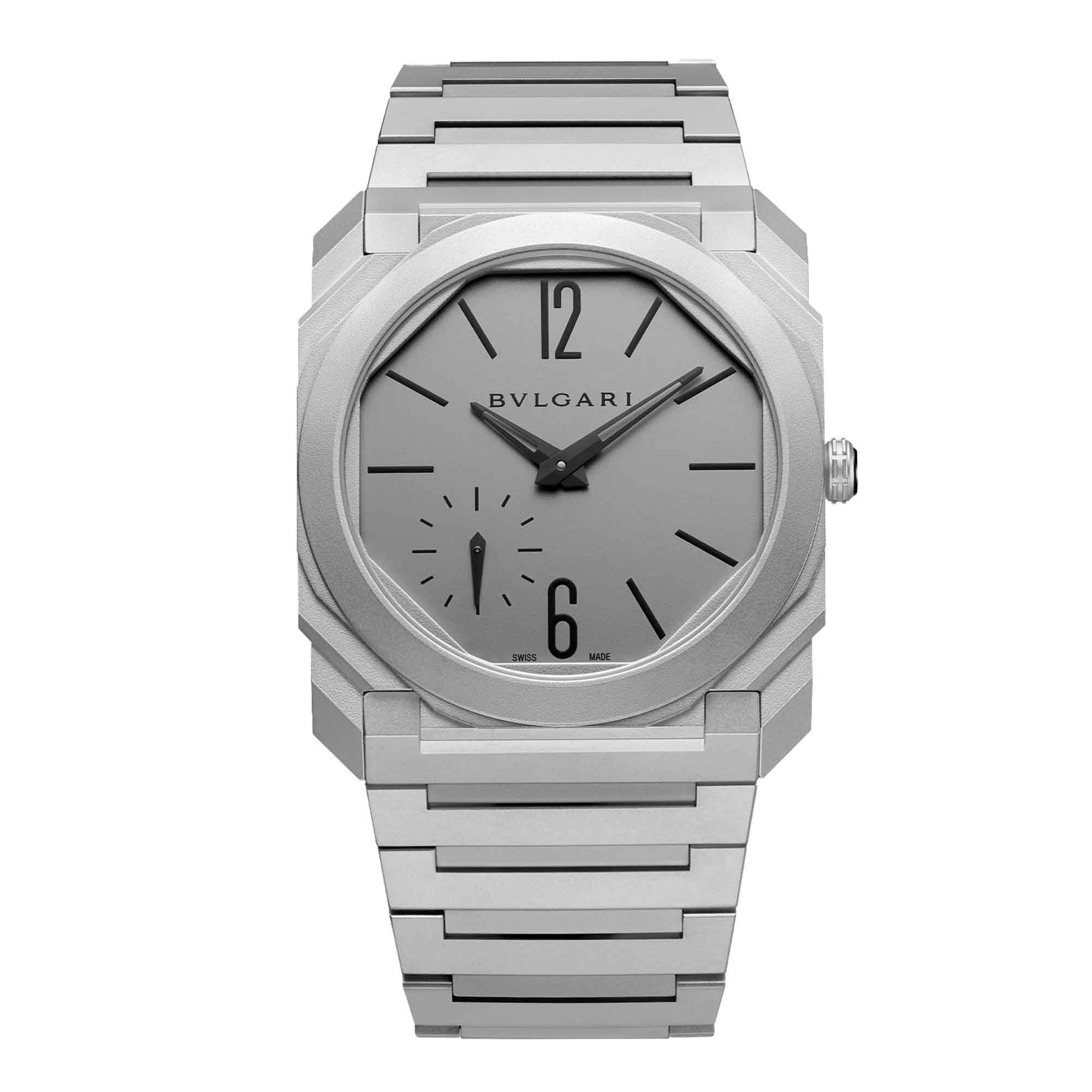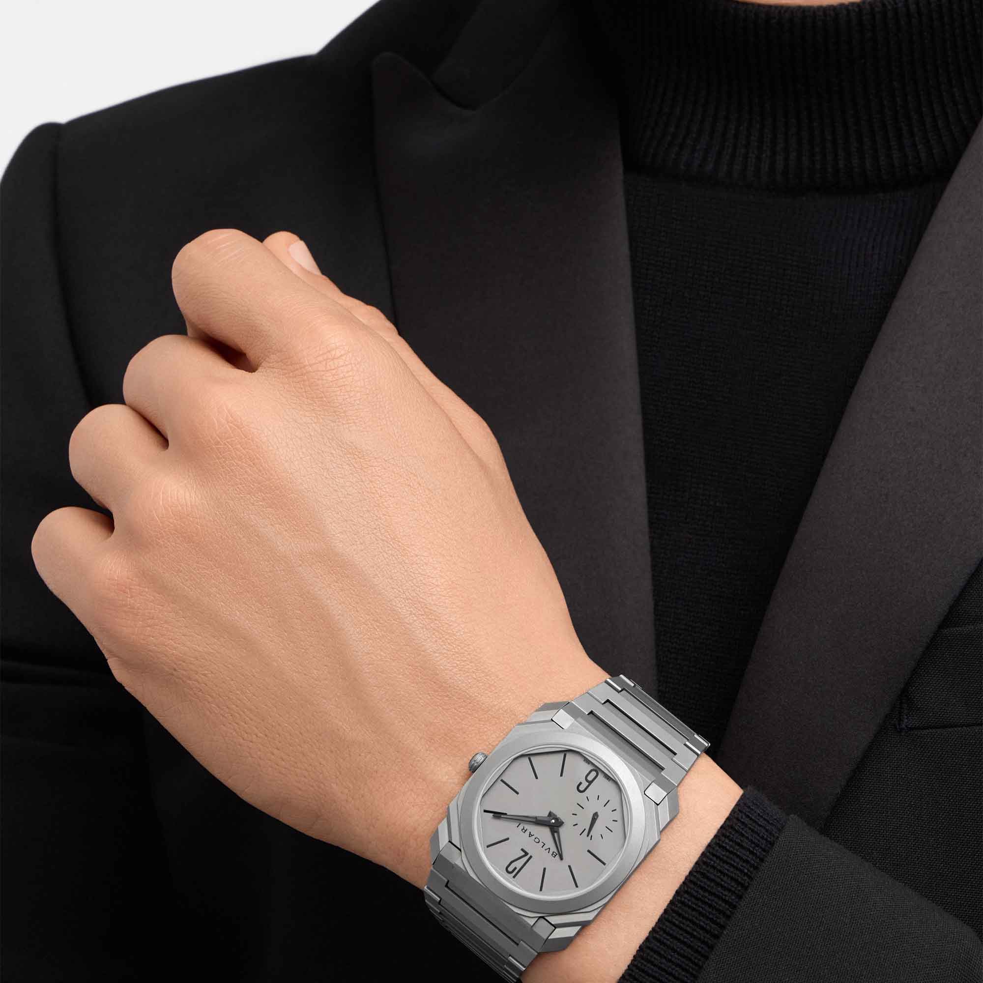 Orologio Octo Finissimo Automatique con movimento meccanico di manifattura ultrapiatto a carica automatica, piccoli secondi, cassa e bracciale in titanio, quadrante in titanio.