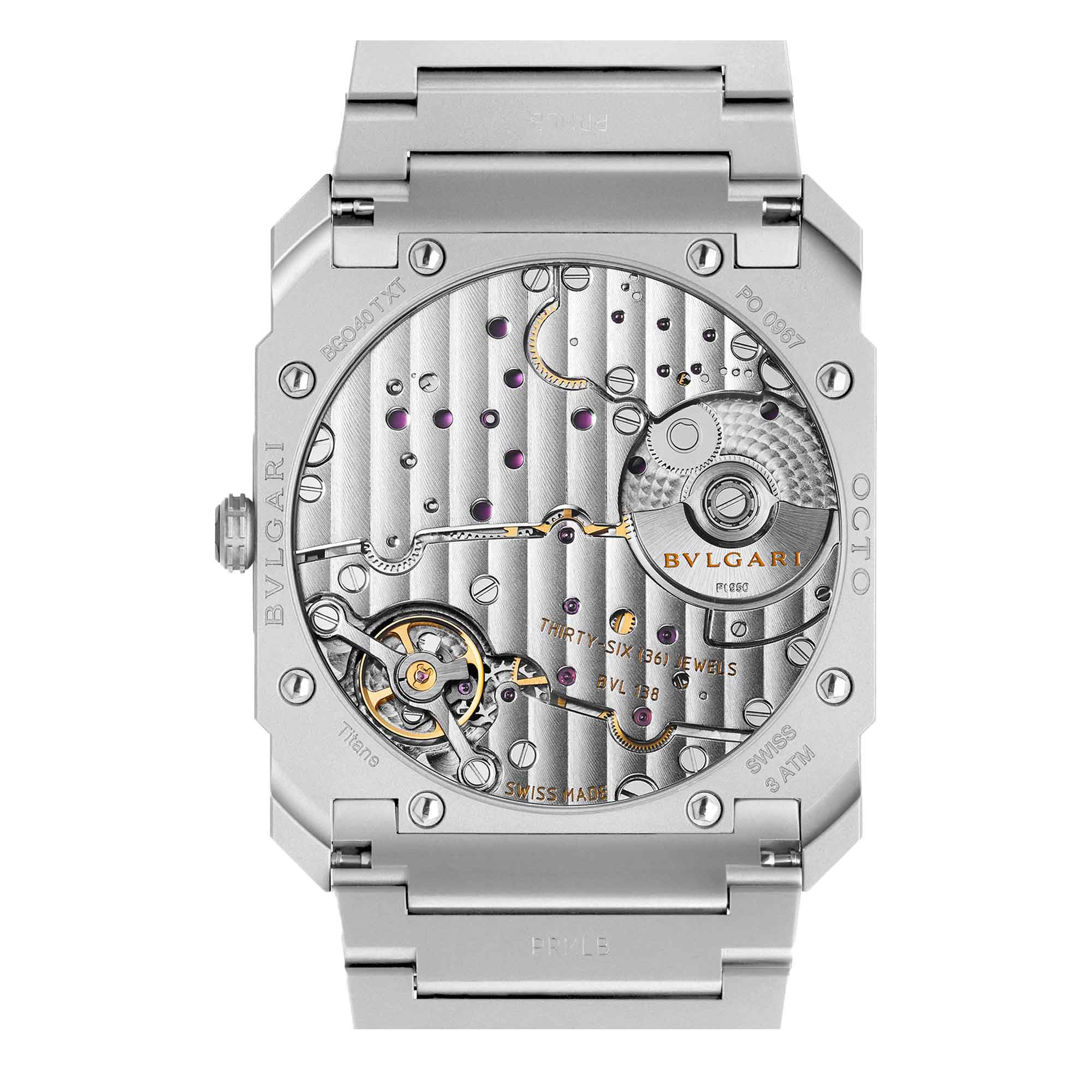 Orologio Octo Finissimo Automatique con movimento meccanico di manifattura ultrapiatto a carica automatica (spessore 2,23 mm), microrotore in platino e piccoli secondi, calibro BVL 138 – Finissimo decorato a mano con finiture côtes de Genève, anglage e perlage, riserva di carica di 60 ore. Cassa ultrapiatta di 40 mm in titanio (spessore 5,15 mm) con fondello a vista, corona in titanio con inserto in ceramica, quadrante in titanio, bracciale in titanio con fibbia déployante in acciaio inossidabile. Impermeabile fino a 30 metri.