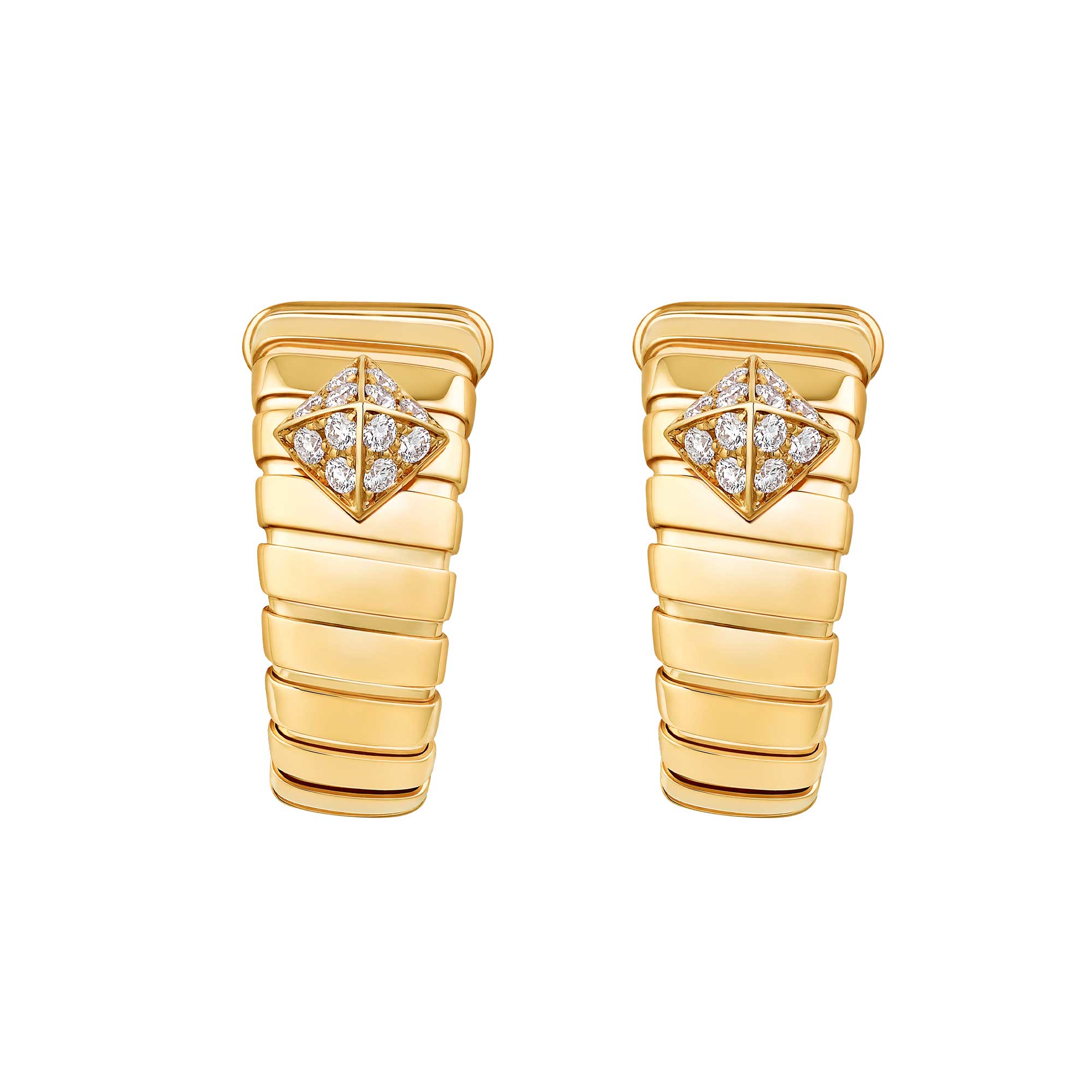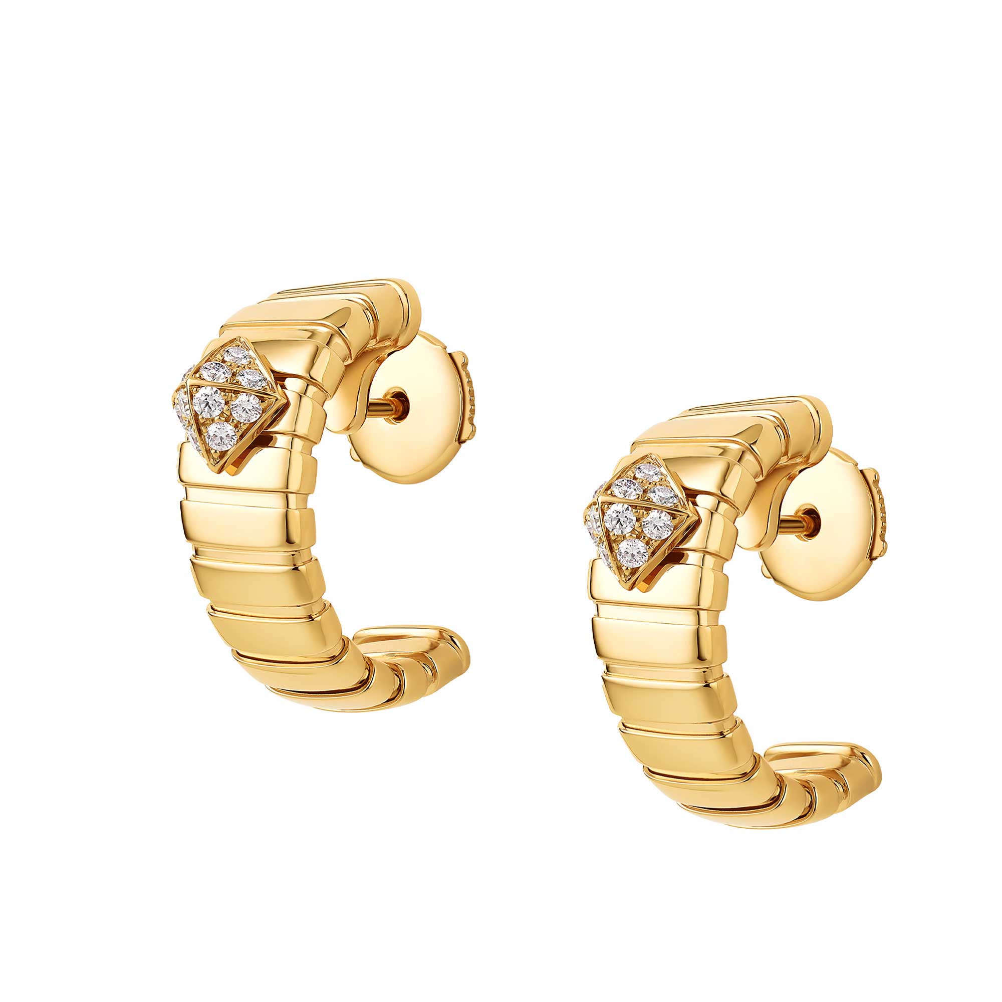Frutto di un perfetto connubio tra design industriale e maestria artigianale, gli orecchini a cerchio Bvlgari Tubogas in oro giallo 18 kt sono adornati da borchie con diamanti. Un design dallo stile distintivo e dal fascino eternamente contemporaneo.