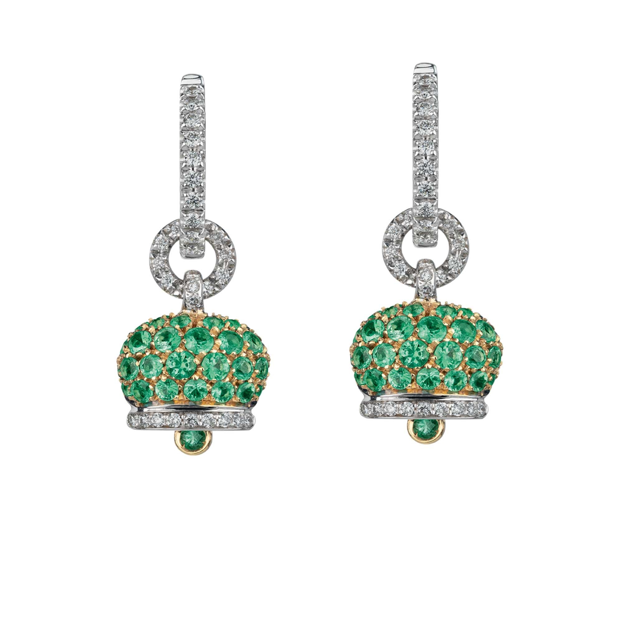 ORECCHINI CAMPANELLA PICCOLI ORO GIALLO E BIANCO DIAMANTI E PAVÉ SMERALDI