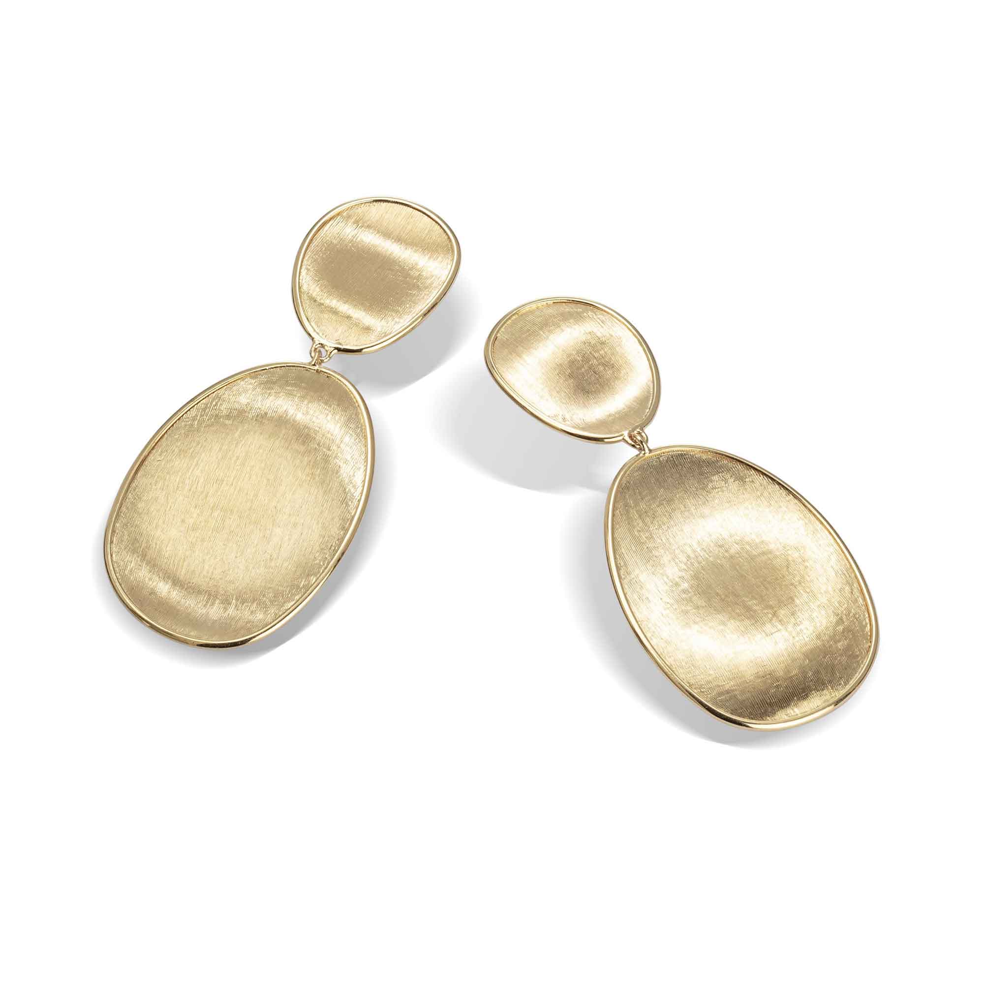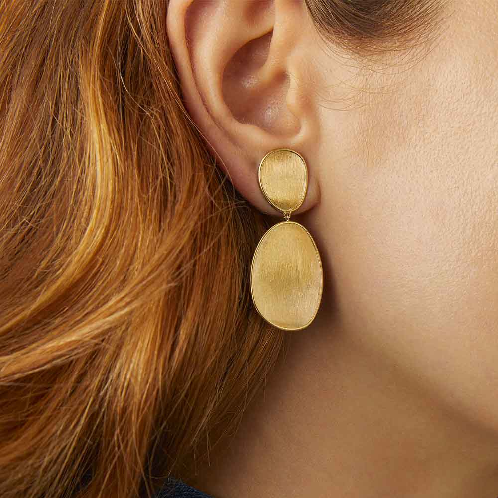 Questo orecchino chandelier è il perfetto connubio tra volumi che si fanno notare e una vestibilità quotidiana. È realizzato in foglie d’oro giallo 18kt, finemente incise a mano con l’antica tecnica del bulino millerighe. Perfetto per dare brio e luce a qualsiasi outfit.