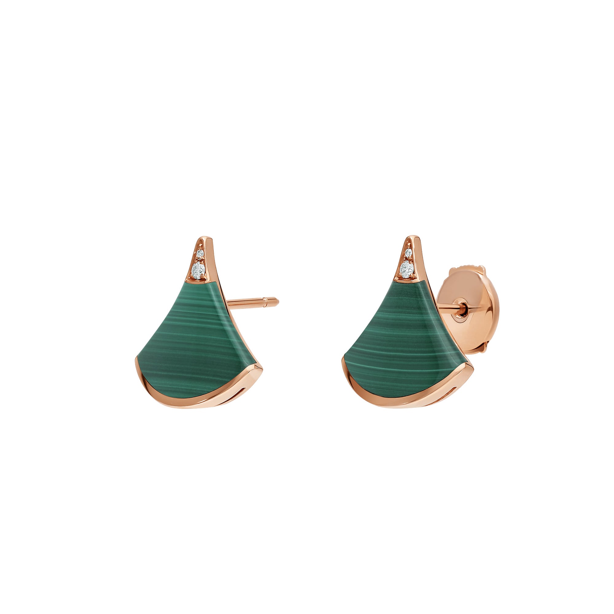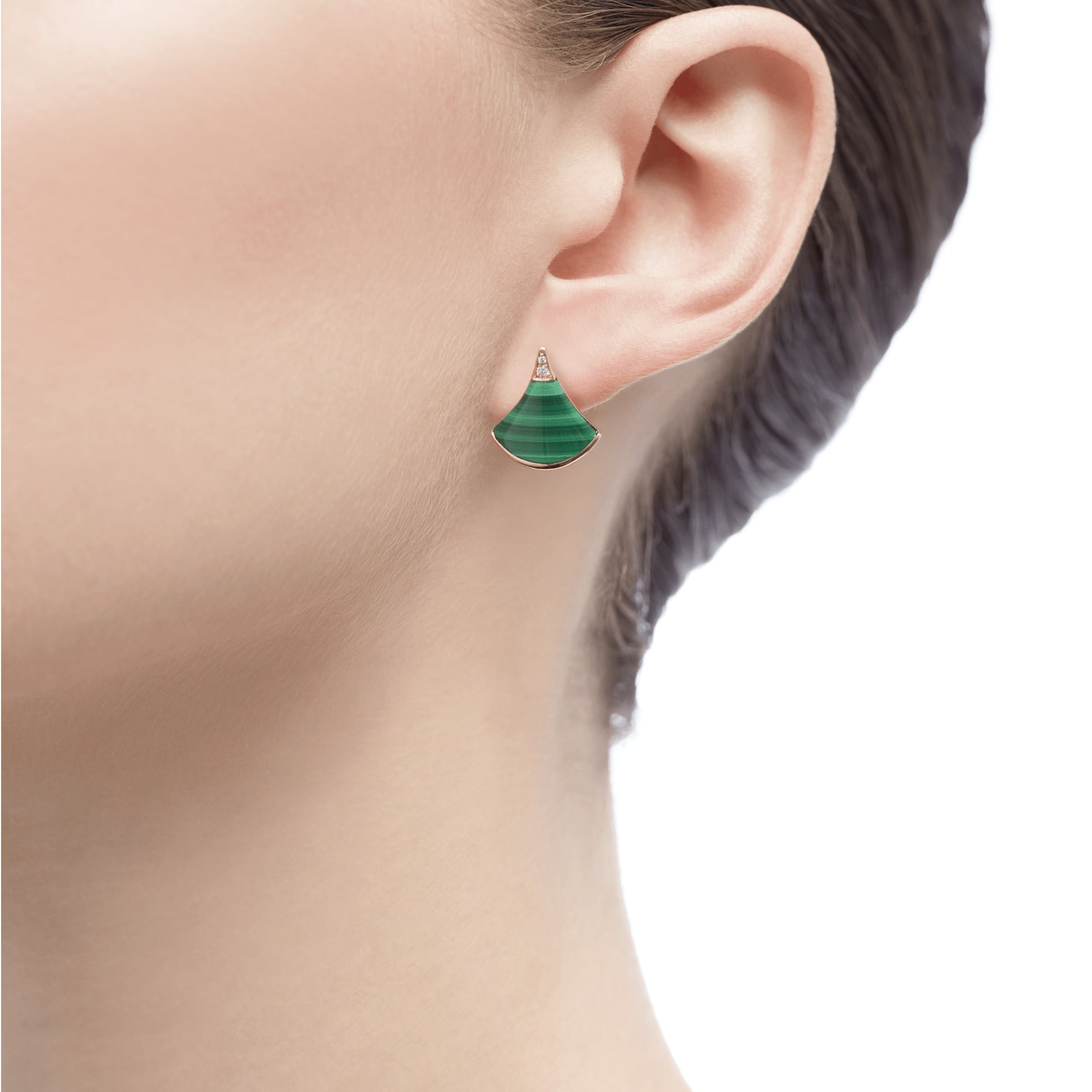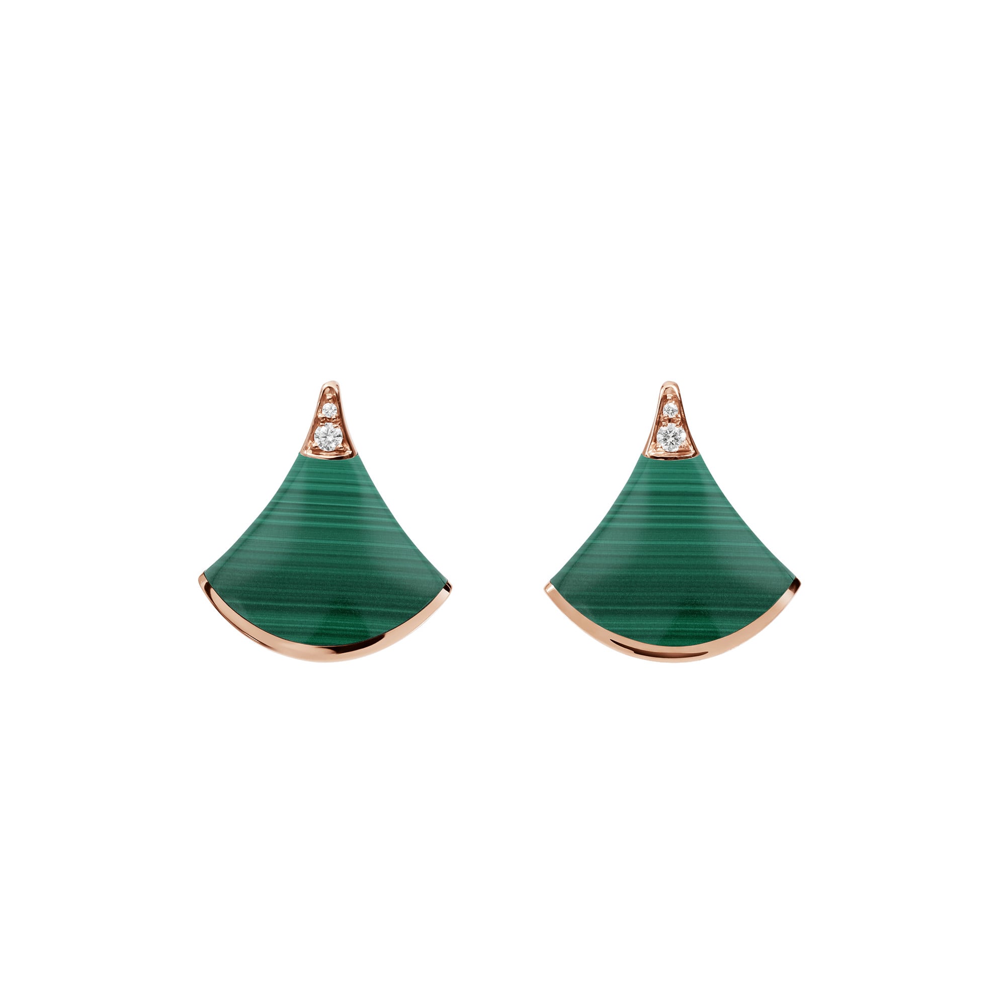 Emblema di stile ed eleganza italiana, gli orecchini DIVAS’ DREAM evocano il mito della Diva e il suo fascino misterioso e accattivante. Con il loro iconico motivo a ventaglio, ispirato ai magnifici mosaici romani delle Terme di Caracalla, gli orecchini incarnano la quintessenza della femminilità e della bellezza italiana, celebrando l’indissolubile legame tra Bvlgari e la Città Eterna. Orecchini DIVAS’ DREAM in oro rosa 18 kt con inserti in malachite e pavé di diamanti.