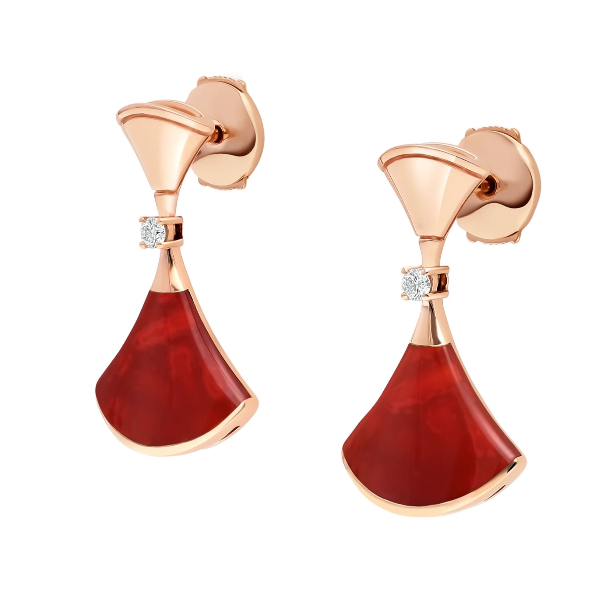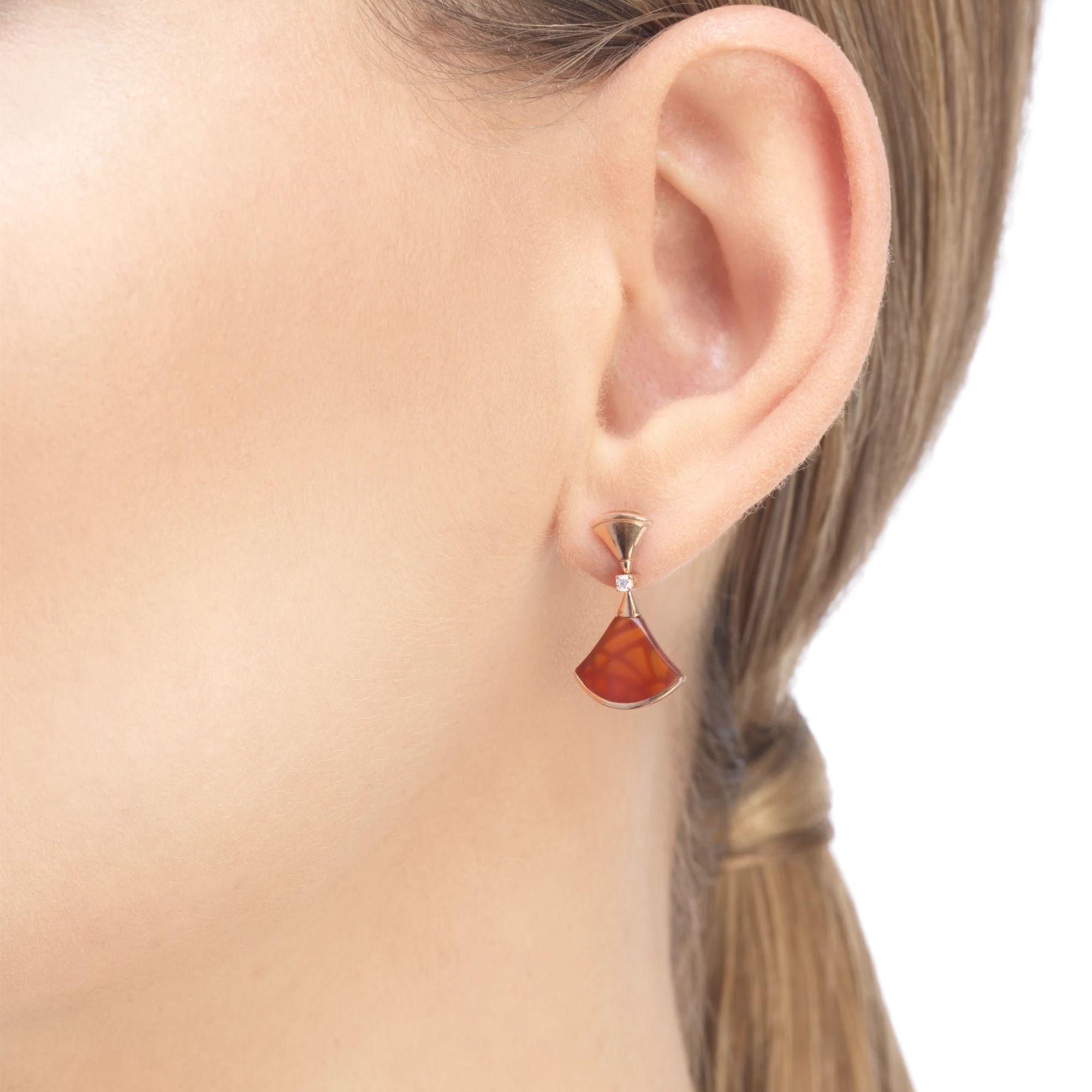 Emblema di stile ed eleganza italiana, gli orecchini DIVAS’ DREAM evocano il mito della Diva e il suo fascino misterioso e accattivante. Con il loro iconico motivo a ventaglio, ispirato ai magnifici mosaici romani delle Terme di Caracalla, gli orecchini incarnano la quintessenza della femminilità e della bellezza italiana, celebrando l’indissolubile legame tra Bvlgari e la Città Eterna. Una creazione dal design contemporaneo, impreziosita da una sofisticata composizione di gemme. Orecchini DIVAS’ DREAM in oro rosa 18 kt con inserti in corniola e diamanti tondi taglio brillante.