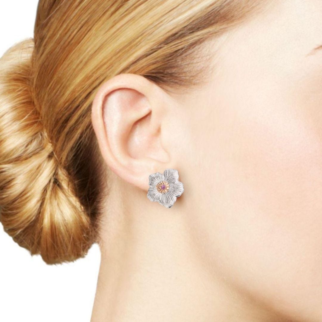 Gli Orecchini Gardenia piccoli Buccellati zaffiri rosa fanno parte della collezione in argento della storica maison milanese. Buccellati è Alta gioielleria, orologi di lusso, anelli nuziali, anelli di fidanzamento e argenteria dalla rinomata casa di alta gioielleria di Milano, dal 1919.