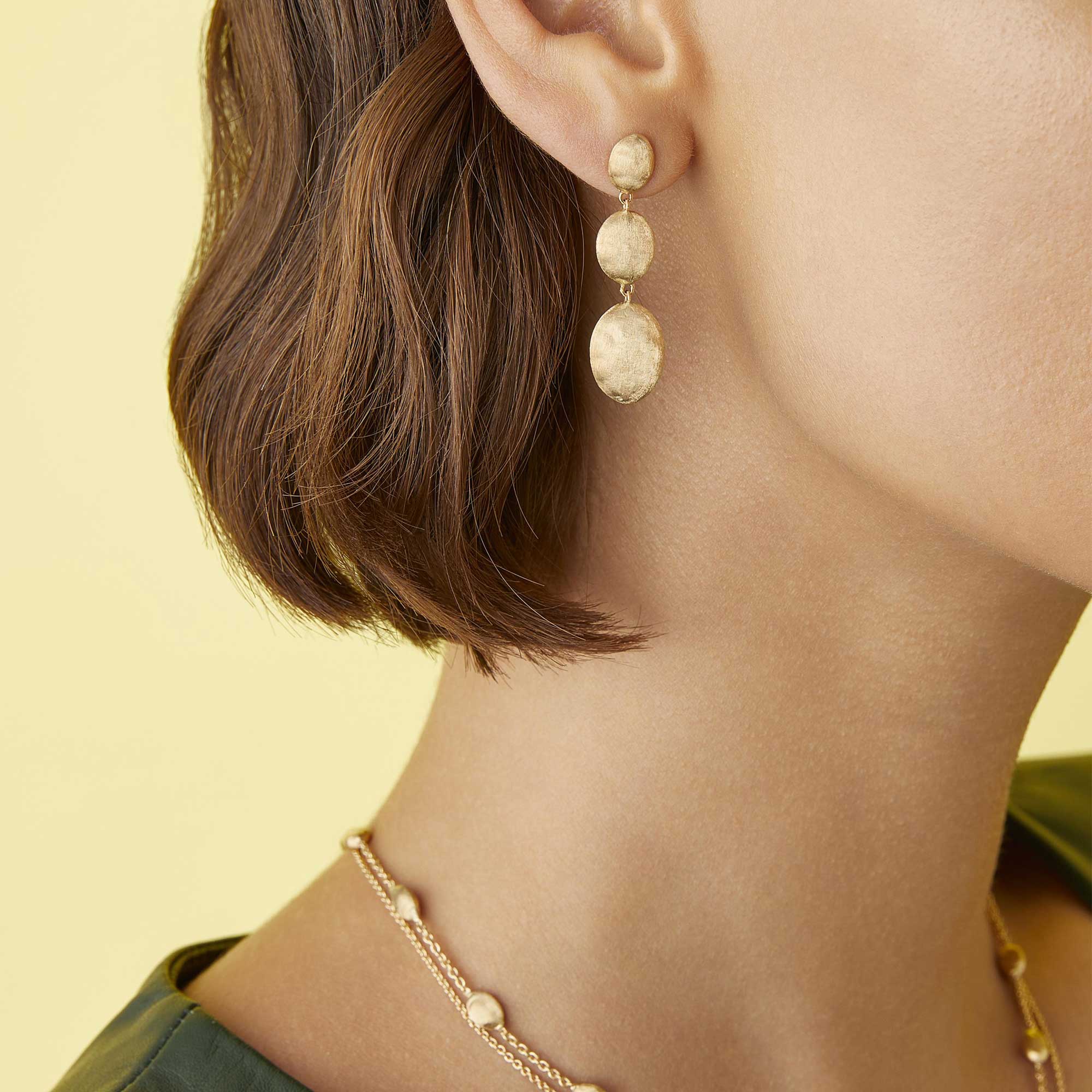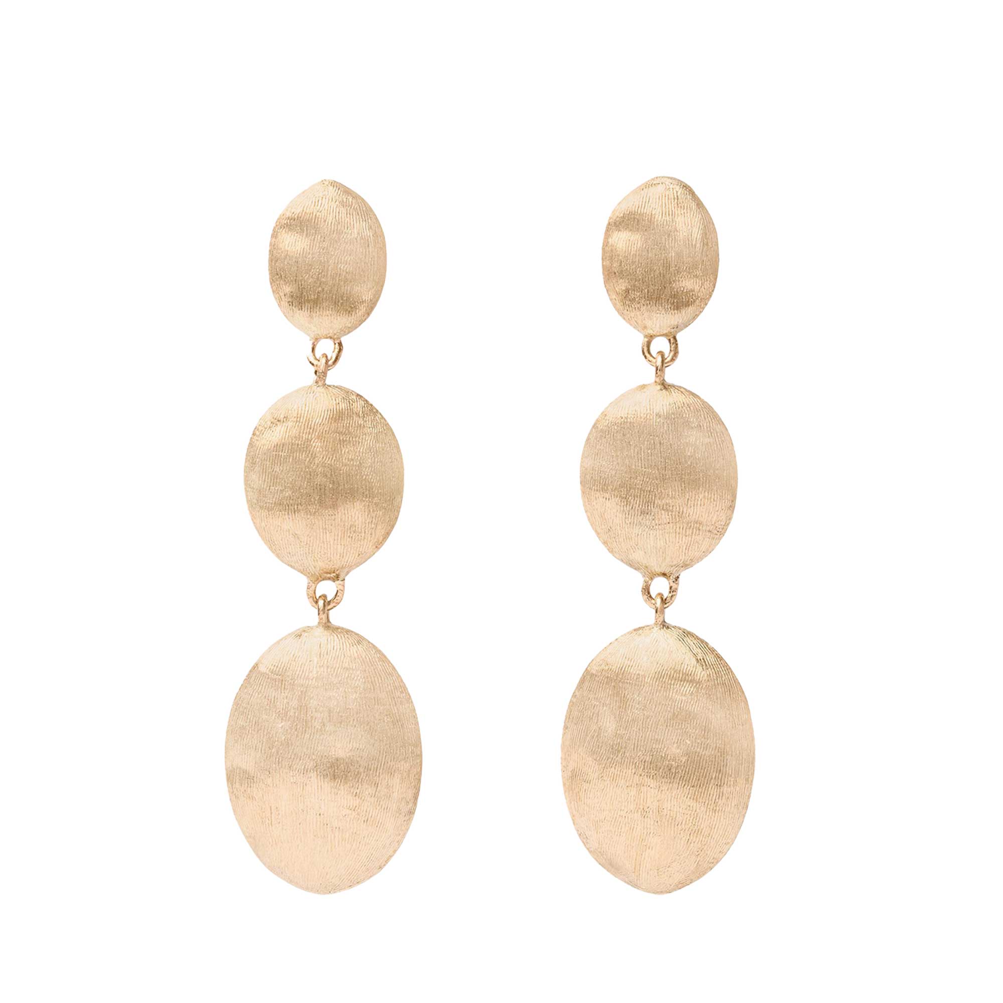 Un orecchino in oro giallo 18kt dal design sofisticato che si distingue per un elegante degradé di ovaline dalla superficie irregolare, finemente incise a mano con l’antica tecnica del bulino millerighe.