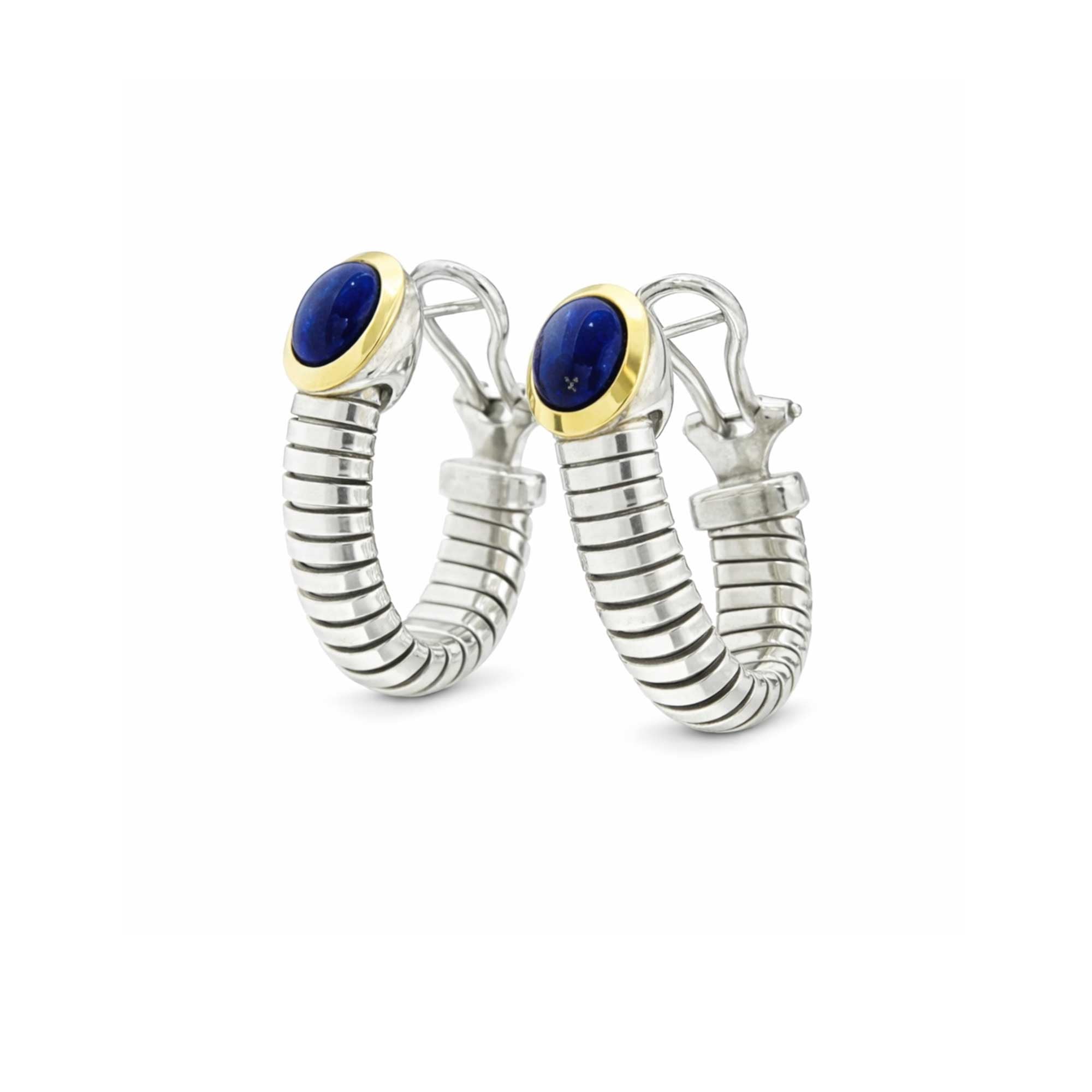 Orecchini Tubogas Argento, oro e lapislazzulo afferiscono all’età romana, quando un filo intrecciato su se stesso ha dato vita a una maglia che oggi è nota al mondo come tubogas. I patrizi romani indossavano braccialetti flessibili che potevano salire fino all’apice del braccio come se fossero avvolti nelle spire di un rettile splendente.