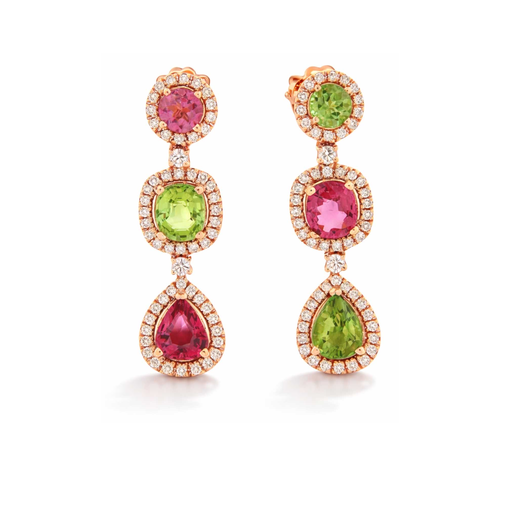 SKU: UNI_OR_01Orecchini in oro rosa con tormaline e peridot rosa.
