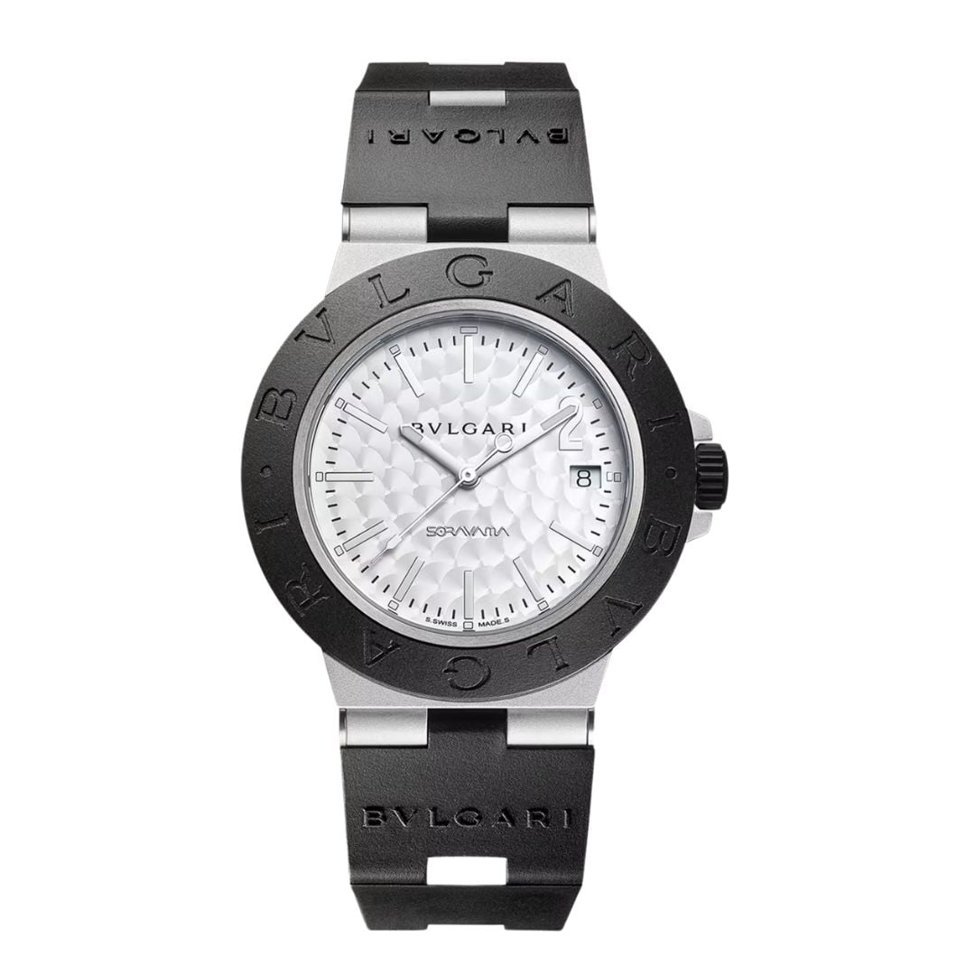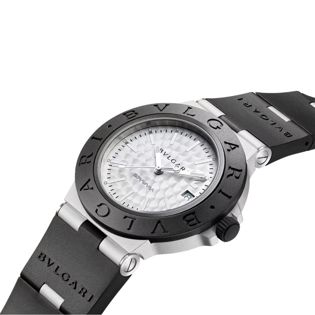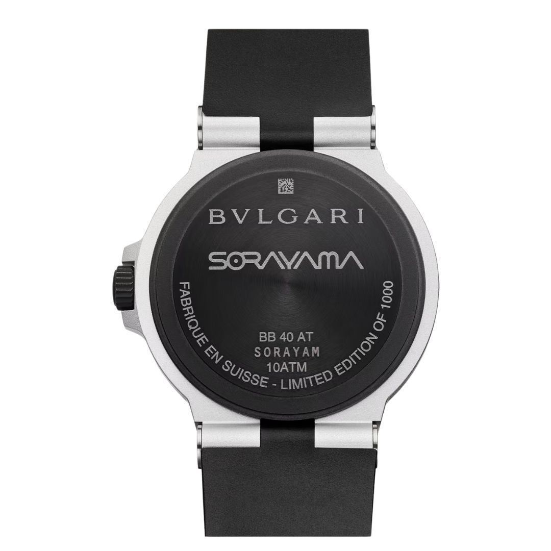 Orologio Bulgari Aluminium Sorayama Special Edition con movimento meccanico di manifattura a carica automatica, funzioni ore, minuti, secondi e data, cassa di 40 mm in alluminio con trattamento DLC, lunetta in caucciù nero con logo BVLGARI BVLGARI, quadrante argentato con motivo perlage e cinturino in caucciù nero. Impermeabile fino a 100 metri. Edizione speciale da 1.000 pezzi.