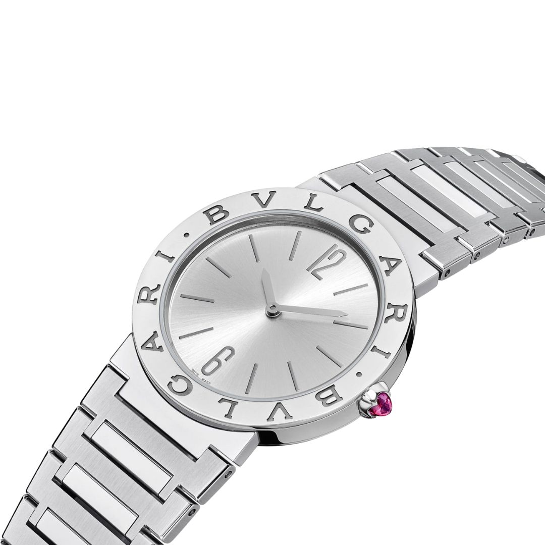 Orologio bvlgari bvlgari lady con movimento al quarzo, cassa di 33 mm in acciaio inossidabile, lunetta in acciaio inossidabile con doppio logo, quadrante argentato soleil, corona in acciaio inossidabile con rubellite rosa taglio cabochon e bracciale in acciaio inossidabile. Impermeabile fino a 30 metri.