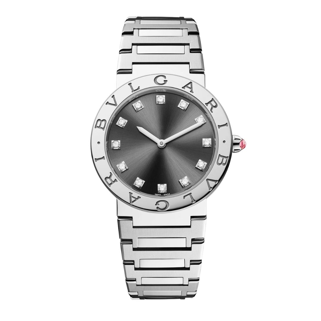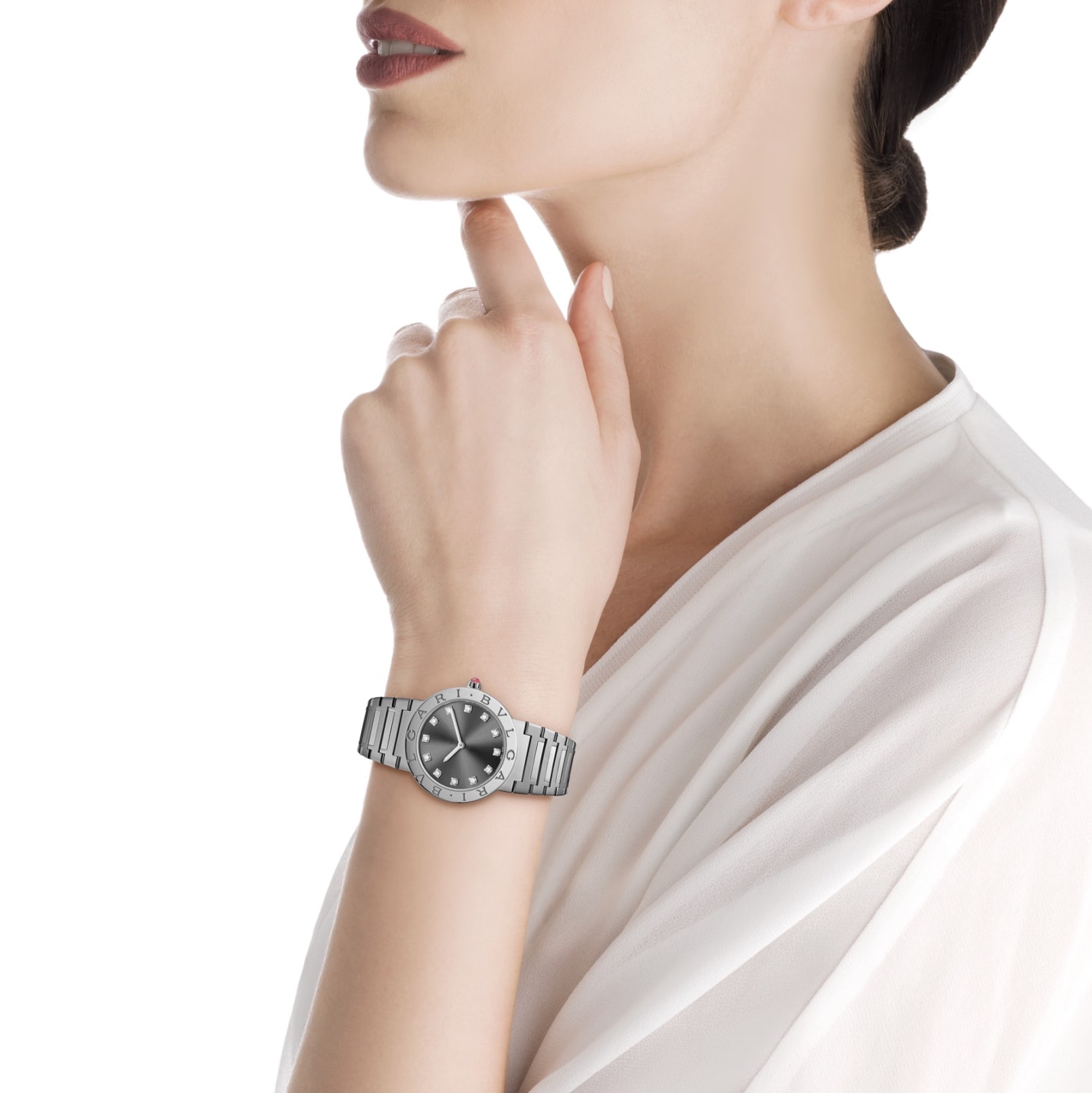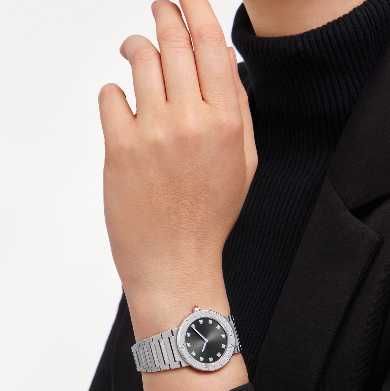 Orologio BVLGARI BVLGARI LADY con movimento al quarzo, cassa di 33 mm in acciaio inossidabile, lunetta in acciaio inossidabile con logo, corona in acciaio inossidabile con rubellite sintetica taglio cabochon, quadrante laccato antracite con finiture satiné soleil, indici con diamanti e bracciale in acciaio inossidabile.