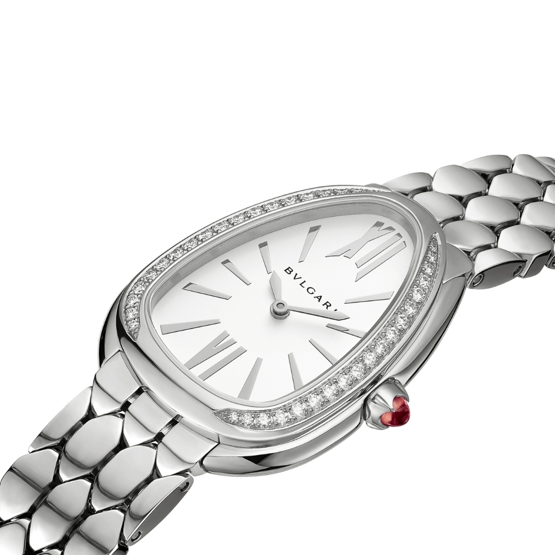 “Con il suo splendore e la sua radiosa eleganza, l’orologio Serpenti Seduttori rende il tempo ancor più prezioso. Rivisitando l’emblema di seduzione Bvlgari per eccellenza attraverso un nuovo straordinario design, l’orologio unisce all’iconica cassa a forma di testa di serpente, dallo spessore ancor più sottile, un flessuoso bracciale adornato da preziose squame esagonali. Un design accattivante, ispirato alle creazioni di Alta Gioielleria della Maison, per un orologio dall’irresistibile potere seduttivo. Orologio Serpenti Seduttori con movimento al quarzo, cassa di 33 mm in acciaio inossidabile, lunetta in acciaio inossidabile con diamanti, corona in acciaio inossidabile con rubellite rosa taglio cabochon, quadrante opalino argento e bracciale in acciaio inossidabile. Impermeabile fino a 30 metri.”