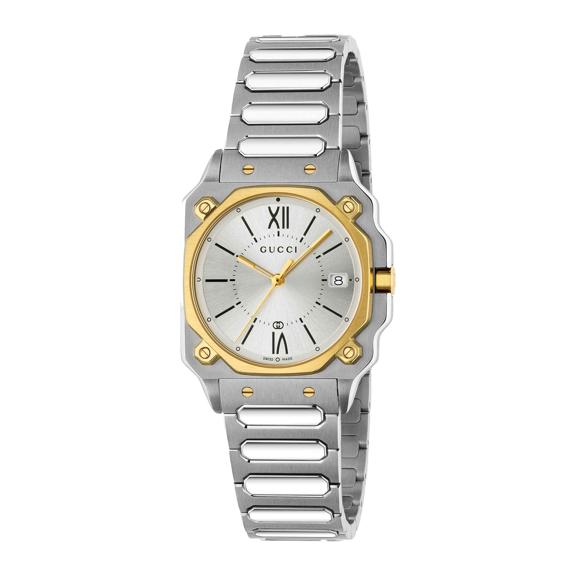 Introdotto per la prima volta negli anni ’70, l’orologio G-Flat rende omaggio ai modelli storici della Maison rivisitandoli con un tocco moderno. Caratterizzato da una silhouette sfaccettata e da una cassa ottagonale con angoli ben definiti, il modello richiama l’estetica architettonica di quell’epoca. Questo orologio è realizzato in acciaio inossidabile e presenta un quadrante argento galvanizzato con numeri romani.