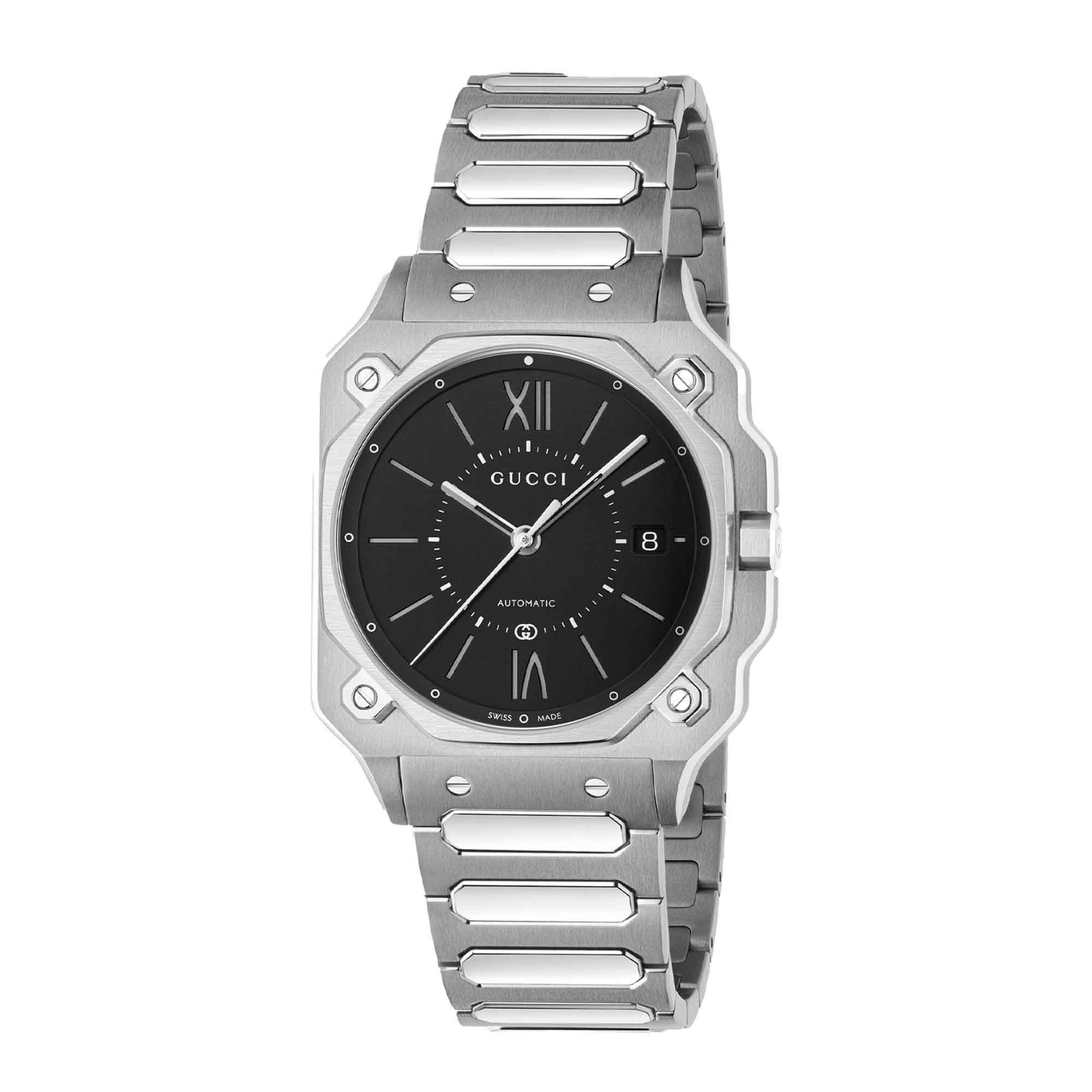 Introdotto per la prima volta negli anni ’70, lcorologio G-Flat rende omaggio ai modelli storici della Maison rivisitandoli con un tocco moderno. Caratterizzato da una silhouette sfaccettata e da una cassa ottagonale con angoli ben definiti, il modello richiama l’estetica architettonica di quell’epoca. Questo orologio è realizzato in acciaio inossidabile e presenta unCquadrante nero opalino con numeri romani e finestra della data.