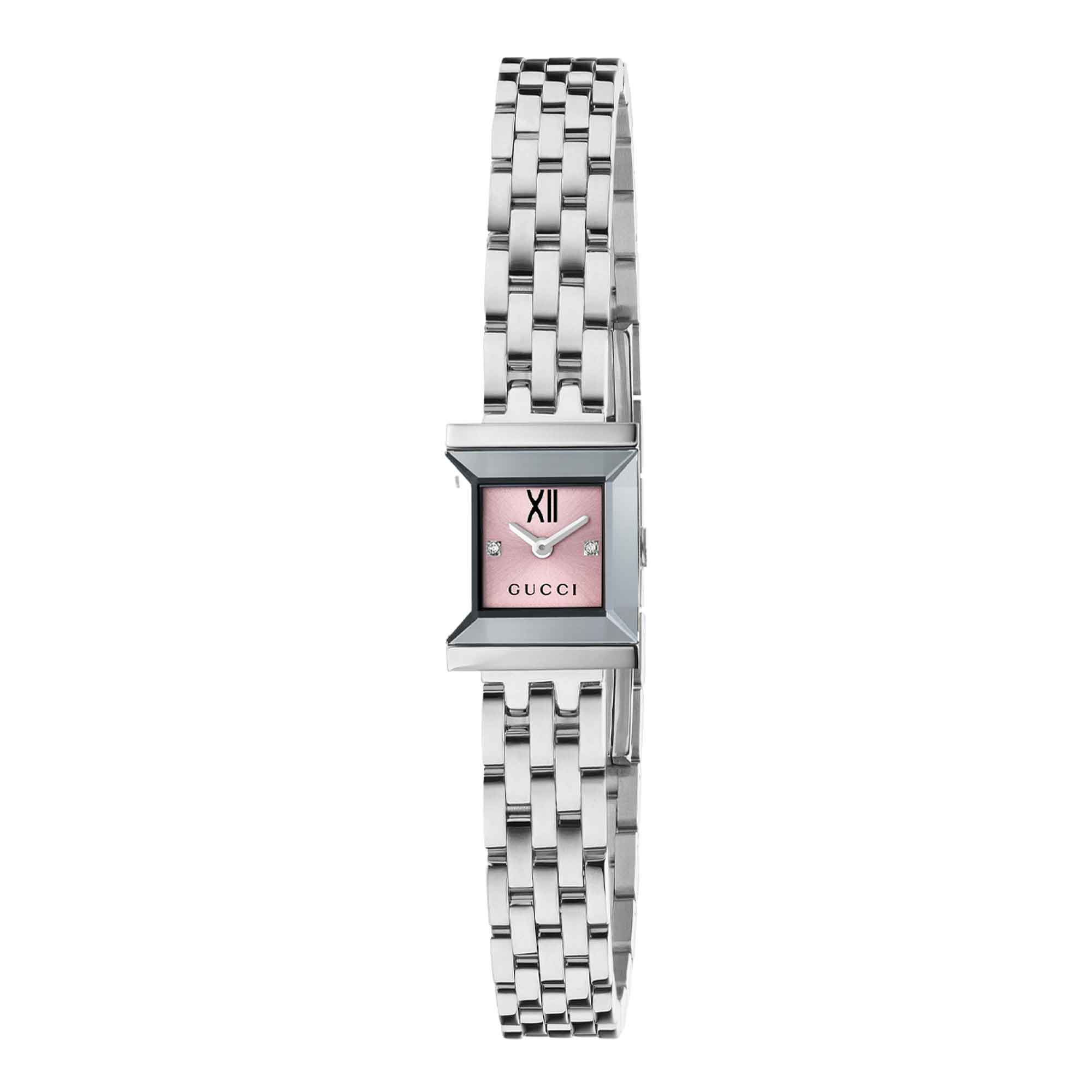 La collezione G-Frame unisce dettagli della tradizione con un’estetica contemporanea, come questo orologio caratterizzato da un’elegante cassa di forma quadrata. Dotato di cassa e bracciale in acciaio inossidabile, questo accessorio è ulteriormente impreziosito da un quadrante rosa con diamanti.