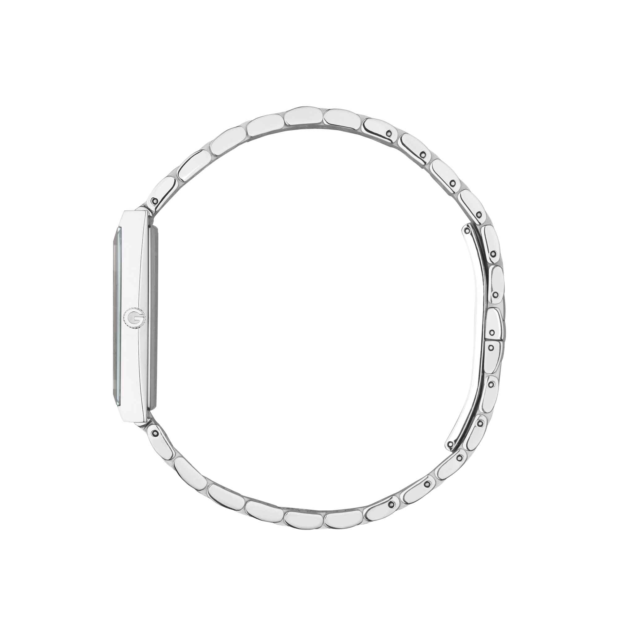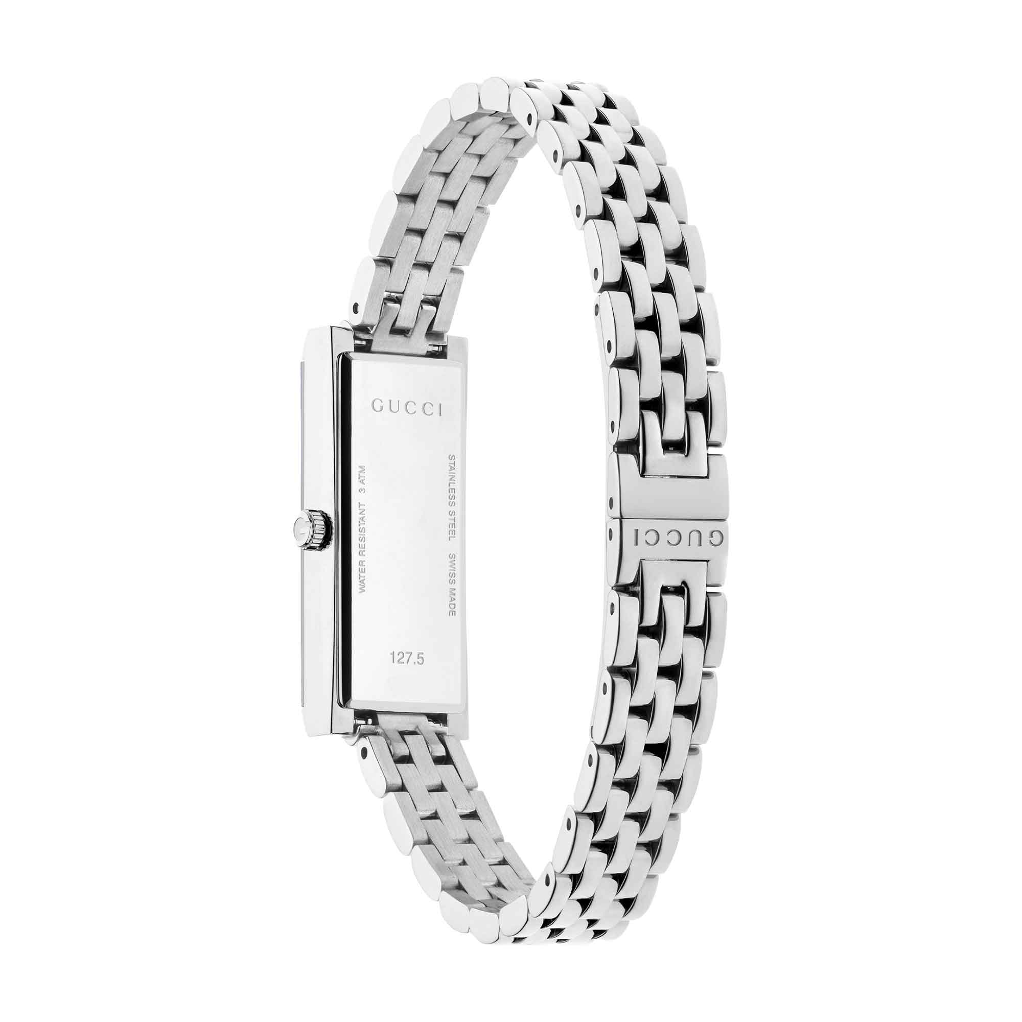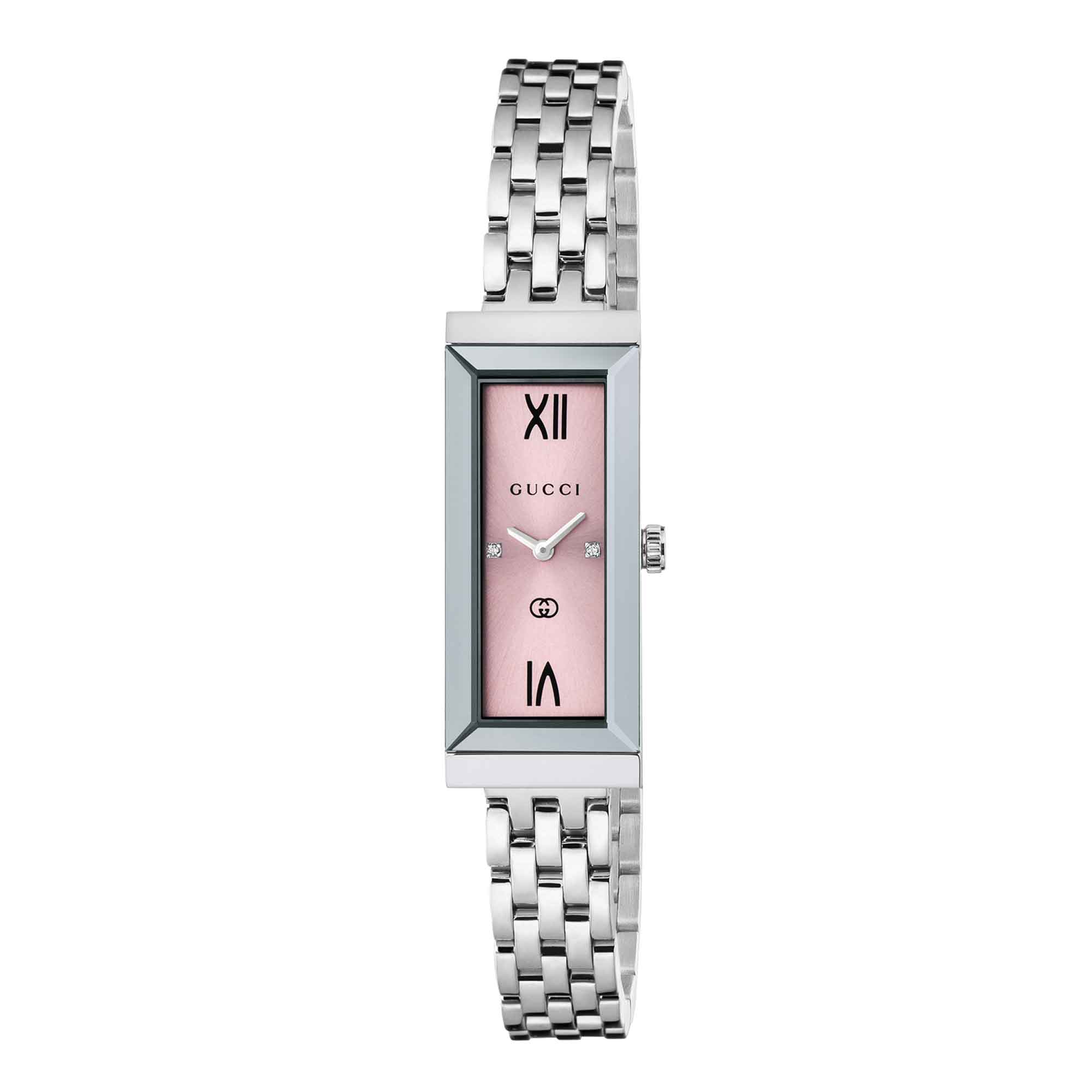 La collezione G-Frame unisce dettagli della tradizione con un’estetica contemporanea, come questo orologio caratterizzato da un’elegante cassa di forma rettangolare. Dotato di cassa in acciaio inossidabile, questo accessorio è ulteriormente impreziosito da un quadrante rosa con diamanti.