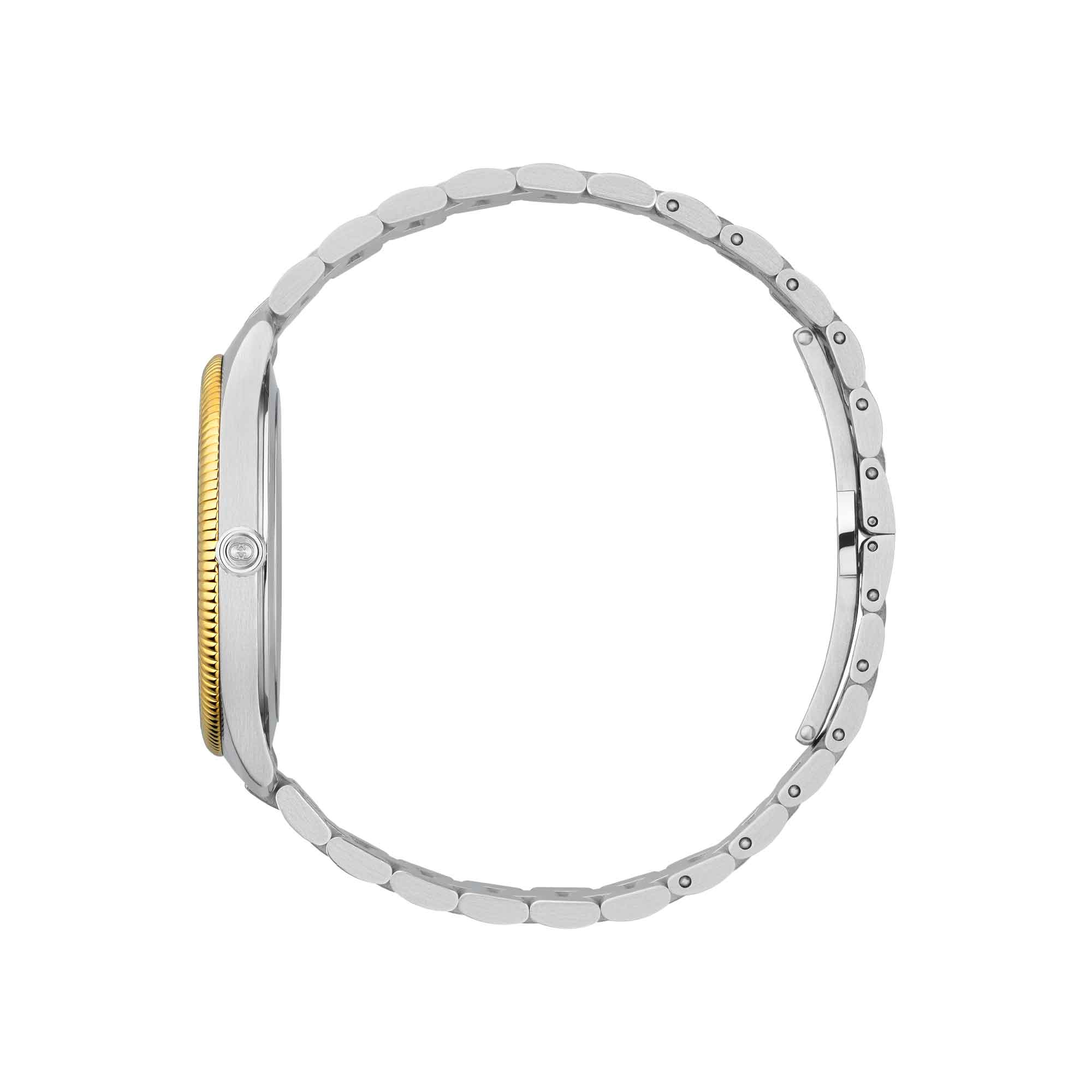 Cassa in acciaio inox da 38 mm con lunetta placcata in oro giallo, quadrante tonalità argento con Incrocio GG, data a ore 3 e cinturino in acciaio inox