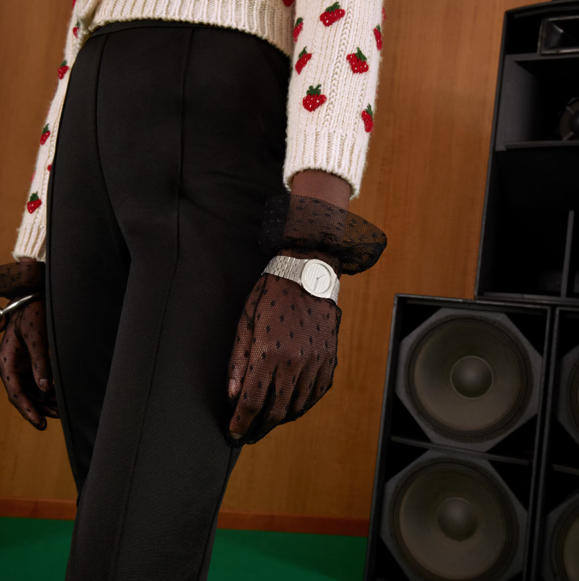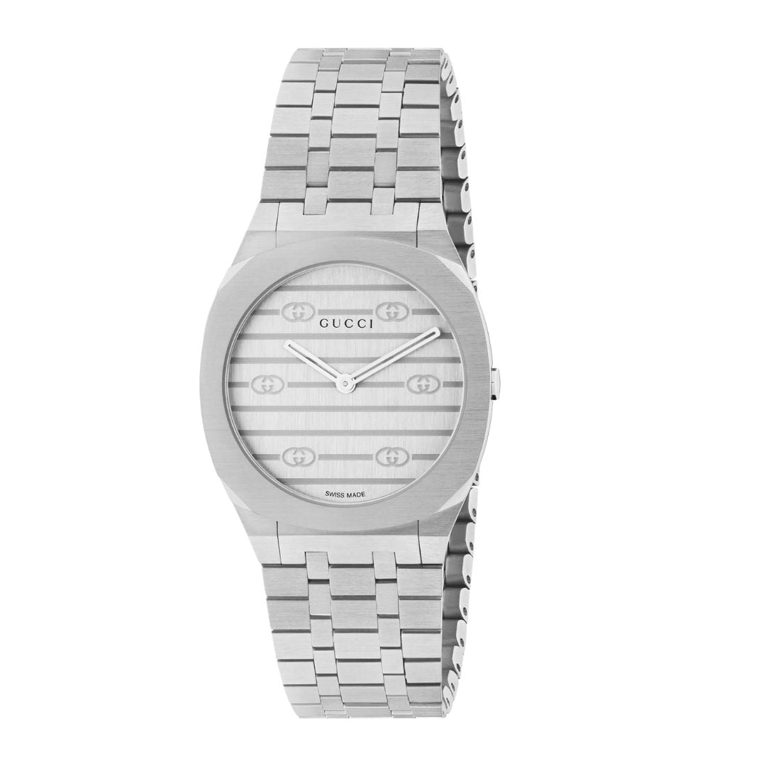 Con le sue linee eleganti, GUCCI 25H è ispirato dalle forme sinuose dell’architettura contemporanea. L’orologio presenta una cassa sfaccettata di 30 mm in acciaio inossidabile, quadrante in ottone color argento con motivo GG, cinturino in acciaio inossidabile a cinque maglie. Il nome contiene il numero 25, caro ad Alessandro Michele e spesso ricorrente nelle sue creazioni.