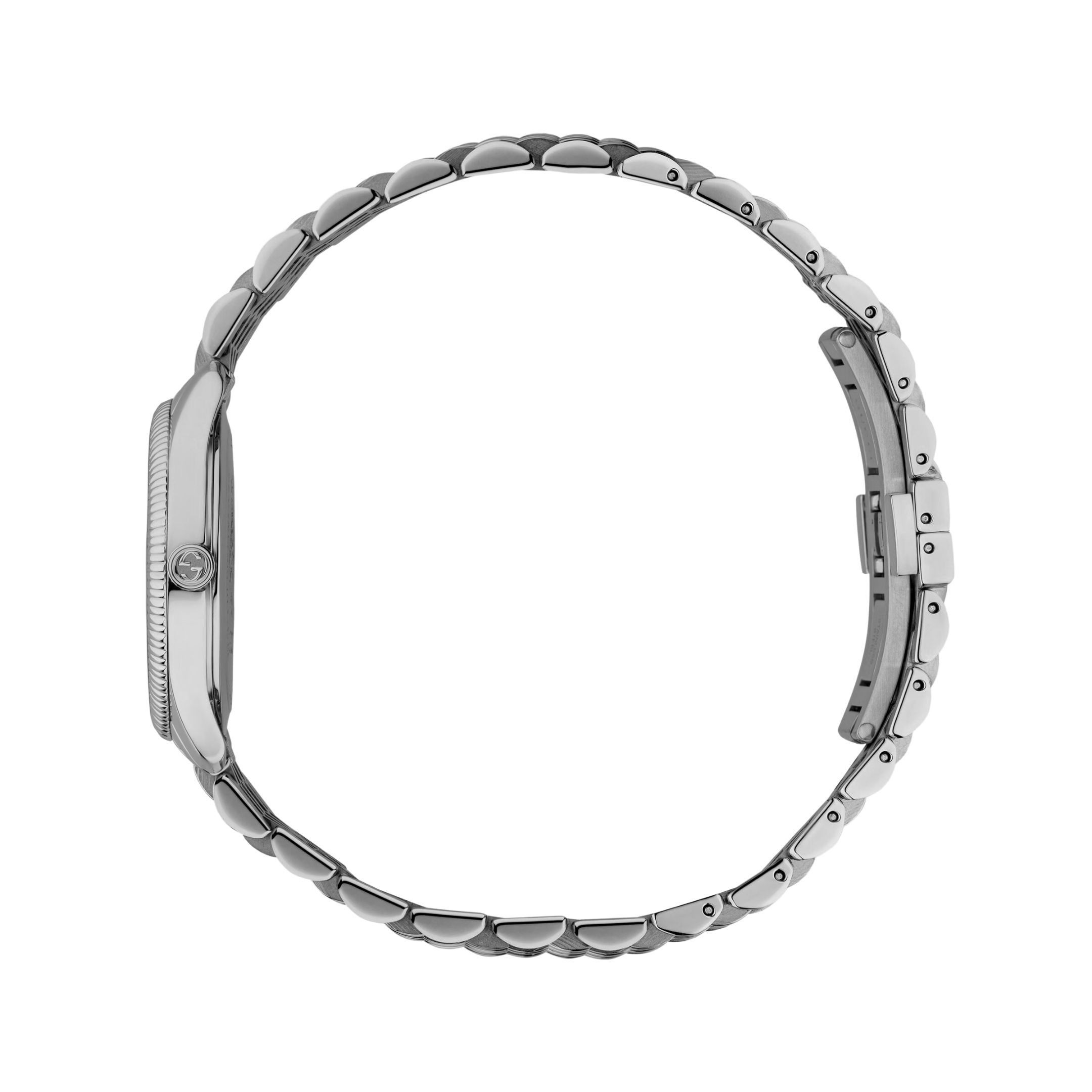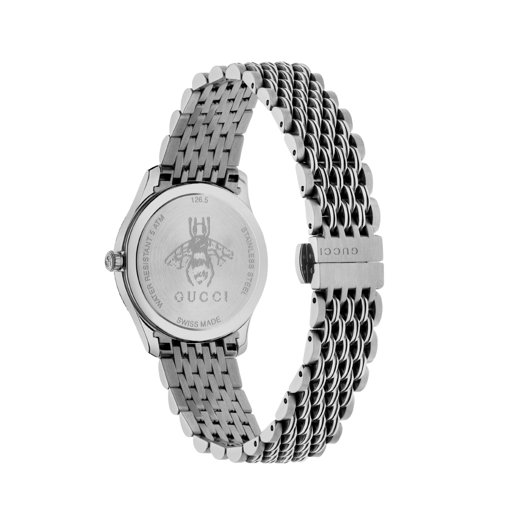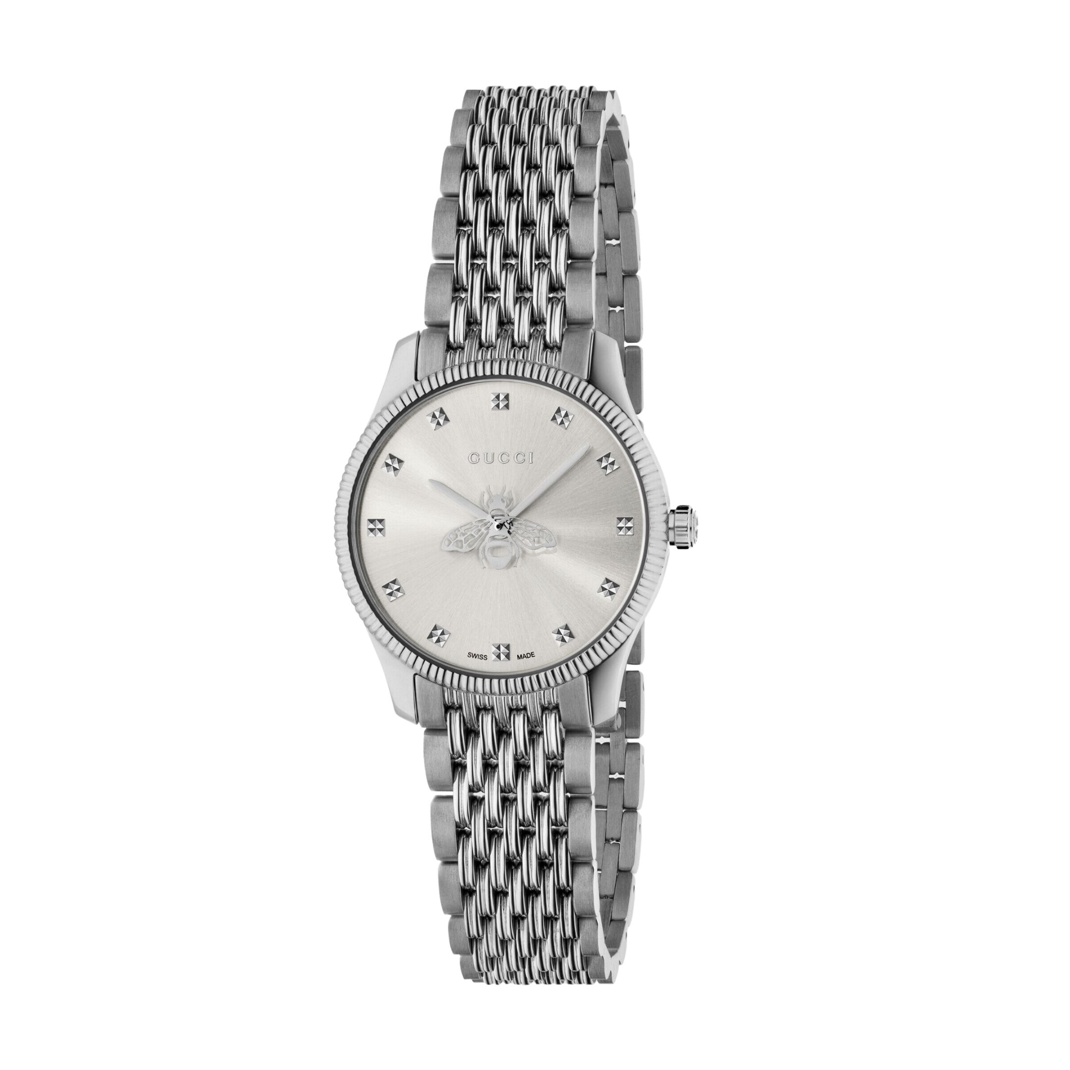 Parte della collezione G-Timeless, questo orologio in acciaio si caratterizza per il design classico, controbilanciato da un quadrante spazzolato. Il motivo ape definisce la lancetta dei secondi.