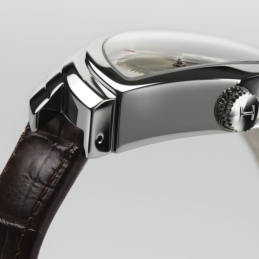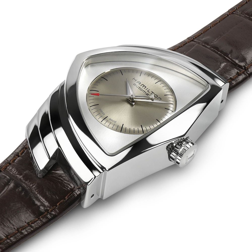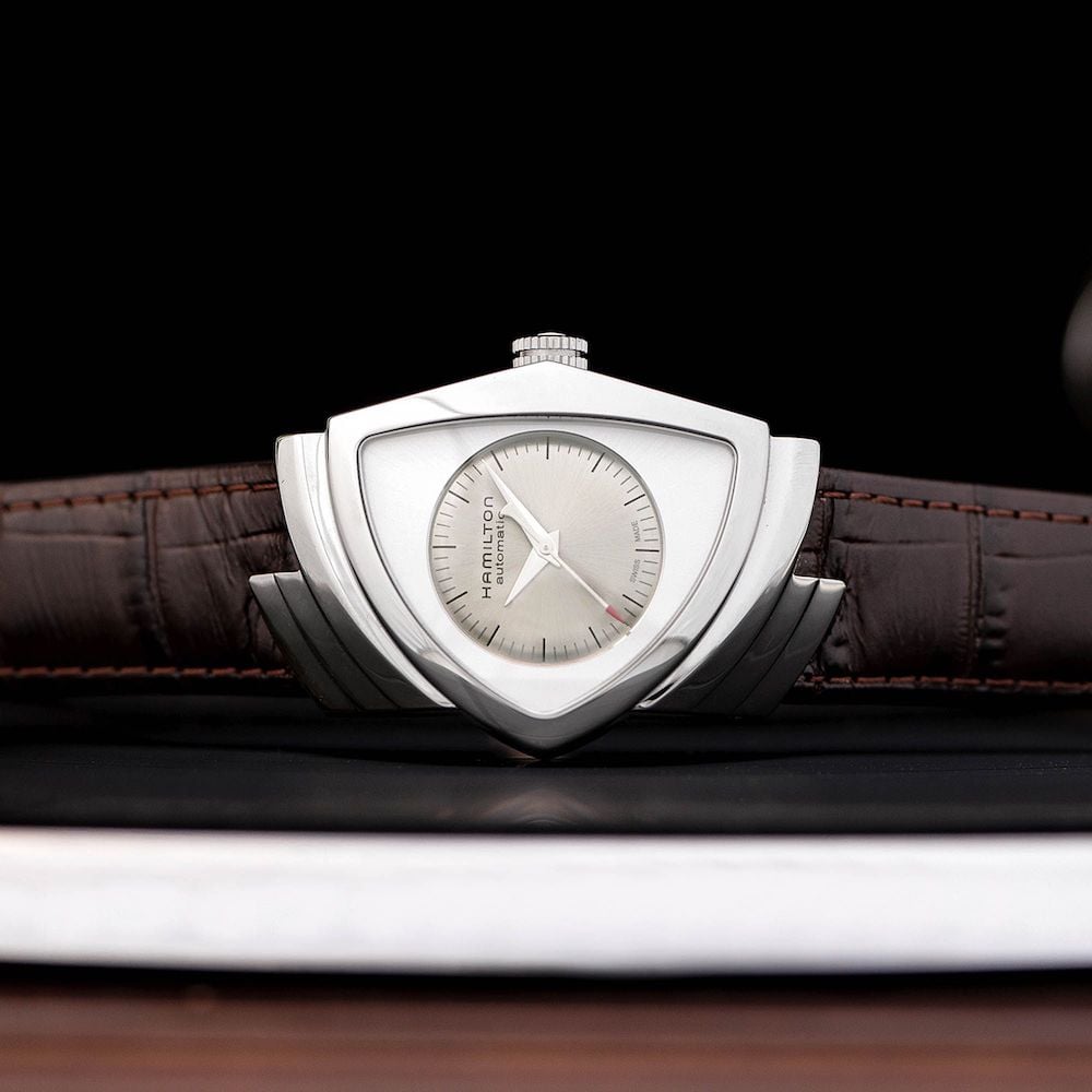 La cassa asimmetrica dell’iconico Ventura porta la firma inconfondibile del design Hamilton del 1957. Molto imitato ma mai eguagliato, il Ventura resta un simbolo intramontabile nella gloriosa storia della Maison. Il quadrante dalla linea sobria cela un movimento automatico di qualità prodotto in Svizzera.