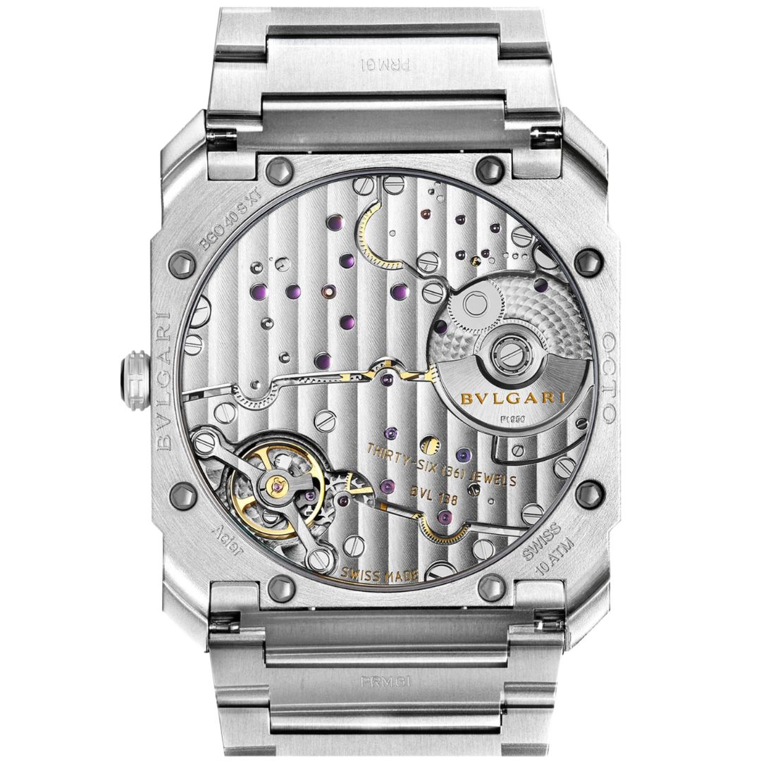 Orologio Octo Finissimo Automatique con movimento meccanico di manifattura a carica automatica, microrotore in platino e piccoli secondi. Calibro BVL 138, cassa ultrapiatta di 40 mm in acciaio inossidabile lucido-satinato (spessore 6,40 mm), fondello a vista, corona a vite in acciaio inossidabile lucido con inserto in ceramica, quadrante opaco nero e bracciale integrato in acciaio inossidabile lucido-satinato con fibbia déployante. Impermeabile fino a 100 metri.
