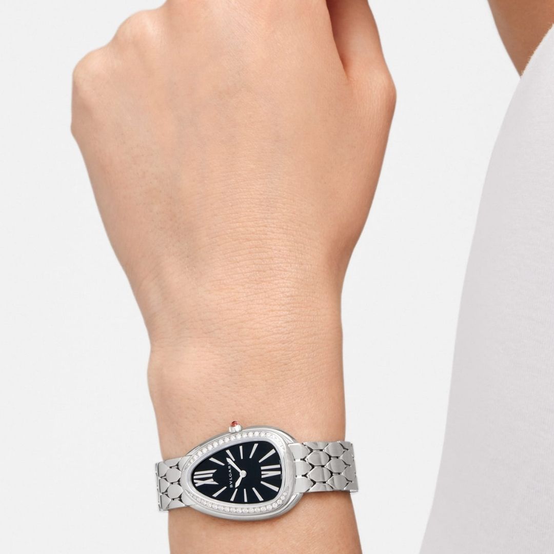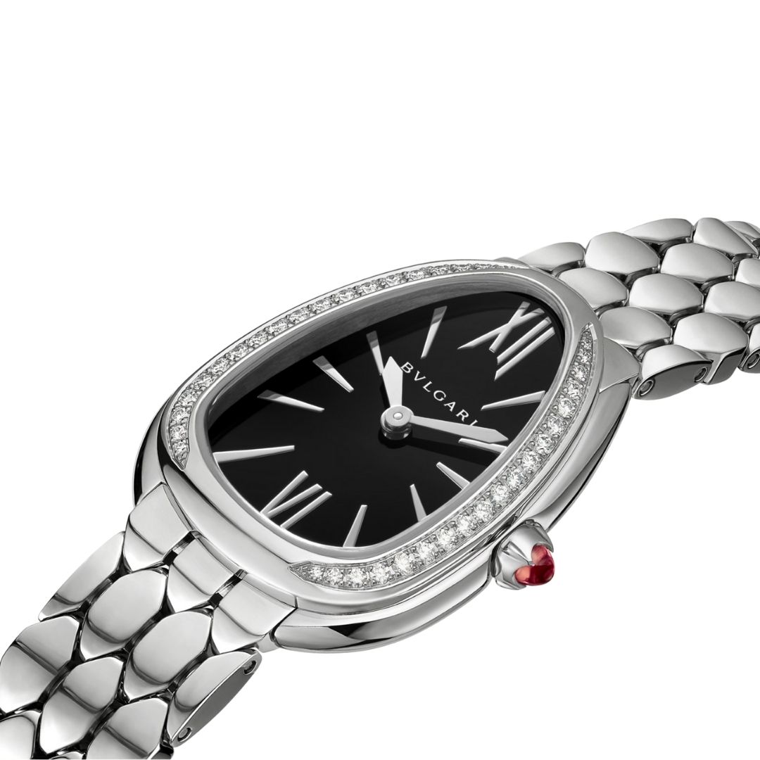 Con il raffinato splendore dei suoi materiali, l’orologio Serpenti Seduttori in acciaio inossidabile rende il tempo ancor più prezioso. Rivisitando l’icona di seduzione Bulgari per eccellenza attraverso un nuovo straordinario design, l’orologio unisce all’emblematica cassa a forma di testa di serpente un quadrante laccato nero contornato da diamanti. Adornato da preziose squame esagonali, il flessuoso bracciale dell’orologio cattura il glamour della gioielleria con un’estetica d’eccezione.
