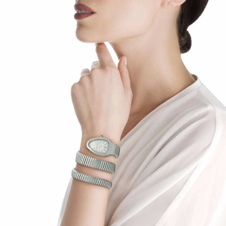 SKU: 101911OROLOGIO BVLGARI SERPENTI TUBOGAS con cassa e bracciale a doppia spirale in acciaio inossidabile e quadrante argento opalino.