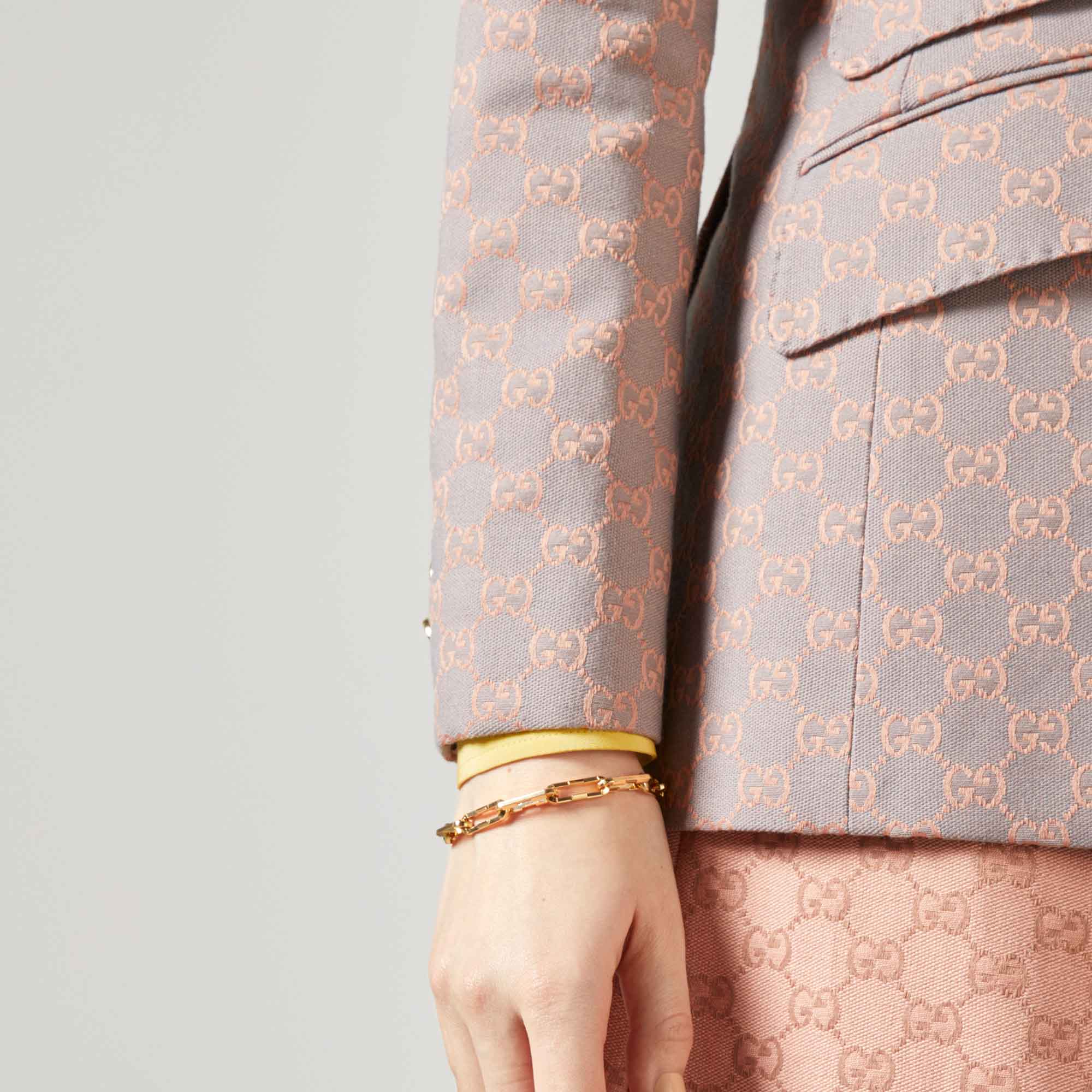 La collezione Gucci Link to Love offre molteplici possibilità di styling. Diamanti taglio baguette e trilliant caratterizzano gli accessori preziosi in oro rosa o bianco. Questo bracciale è realizzato in oro giallo 18 carati.