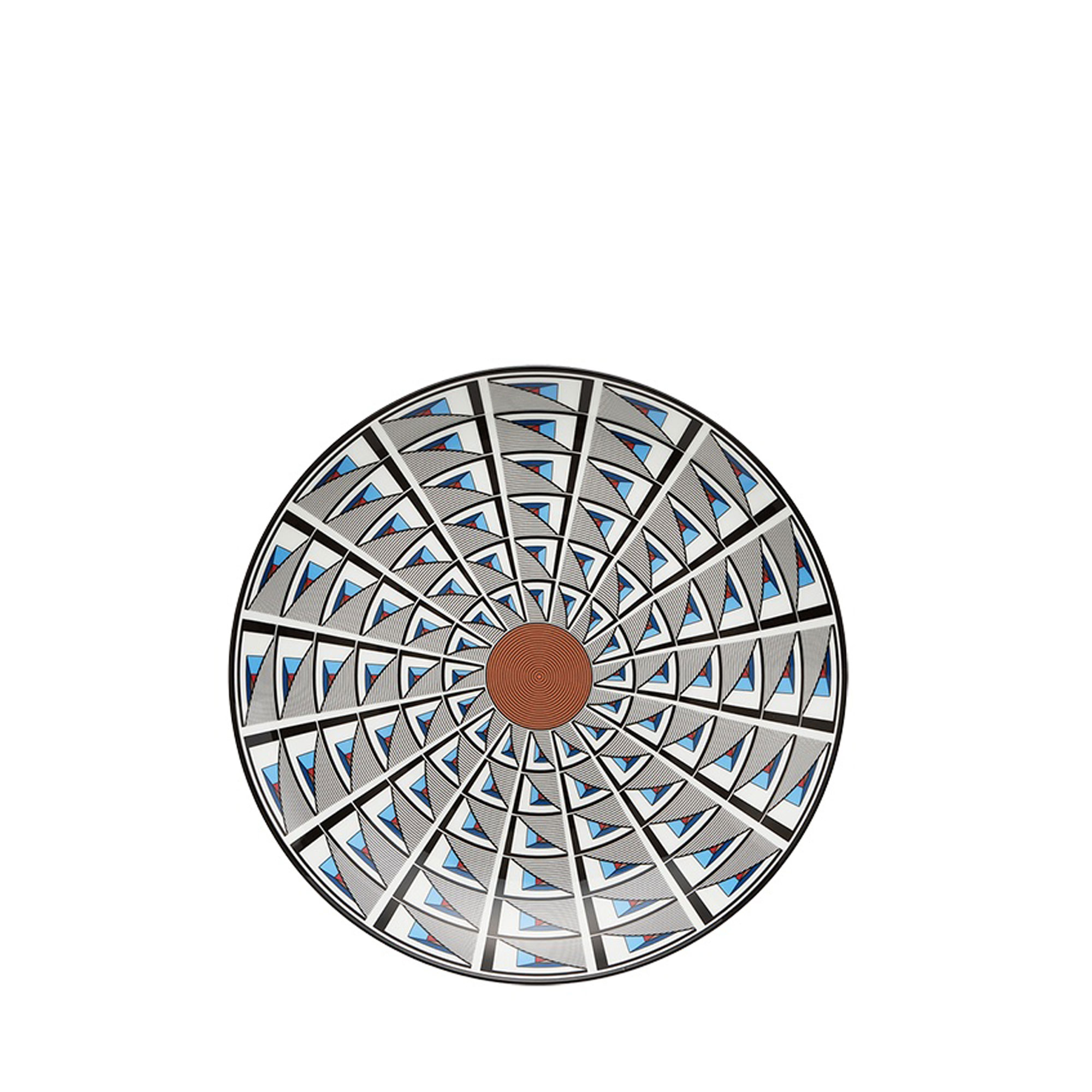 Interamente decorata a mano la collezione Aurea si caratterizza per il colore indaco interrotto da accenti di arancio e tratti bianco e neri.