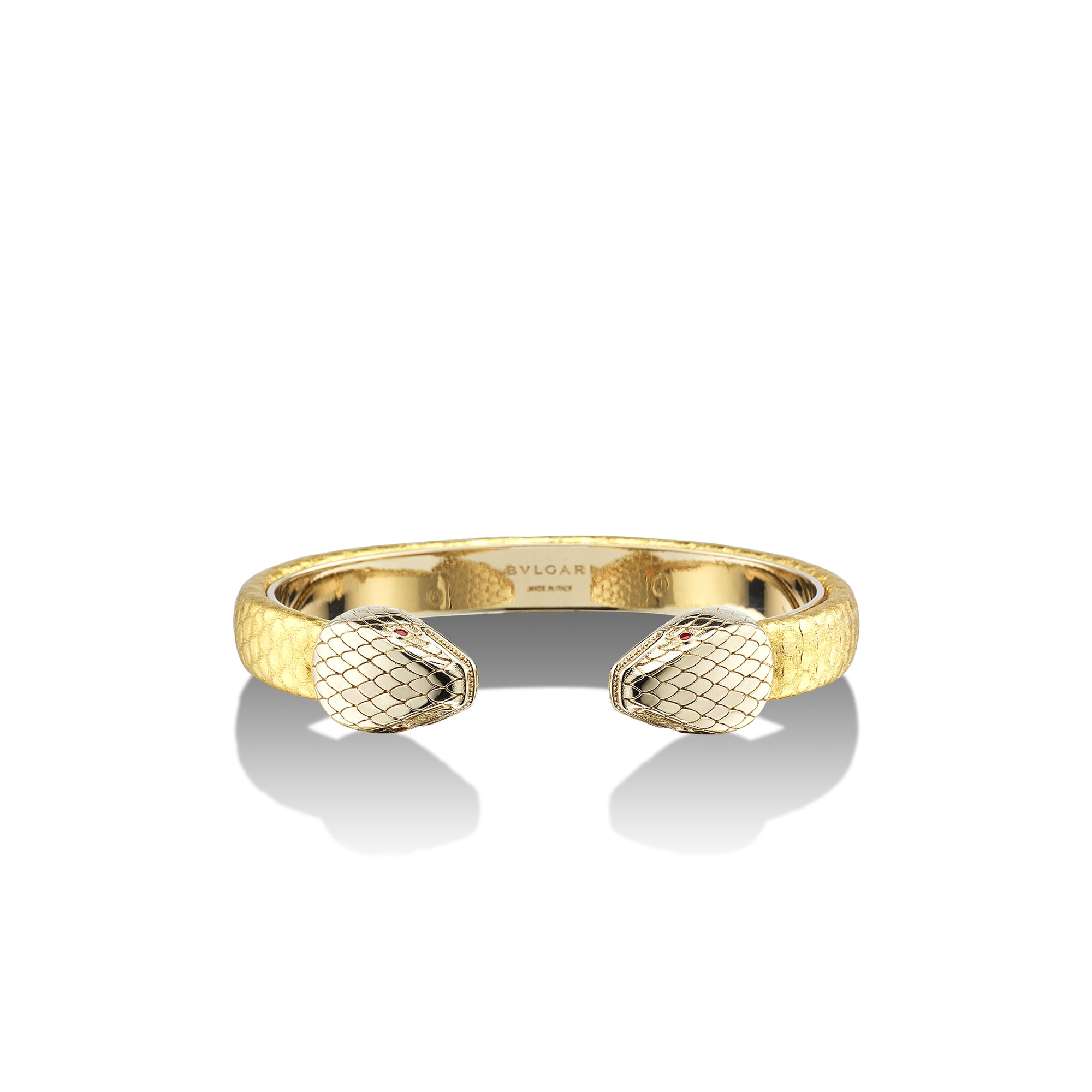 Bracciale rigido “Serpenti Forever” in karung “Molten” oro. Perfetto sia per il giorno che per la sera, il modello è arricchito da una nuova versione dell’iconico motivo Serpenti contraire in ottone placcato oro chiaro, ispirata a un classico dell’orologeria Bvlgari degli anni 60, con seducenti occhi in smalto rosso.