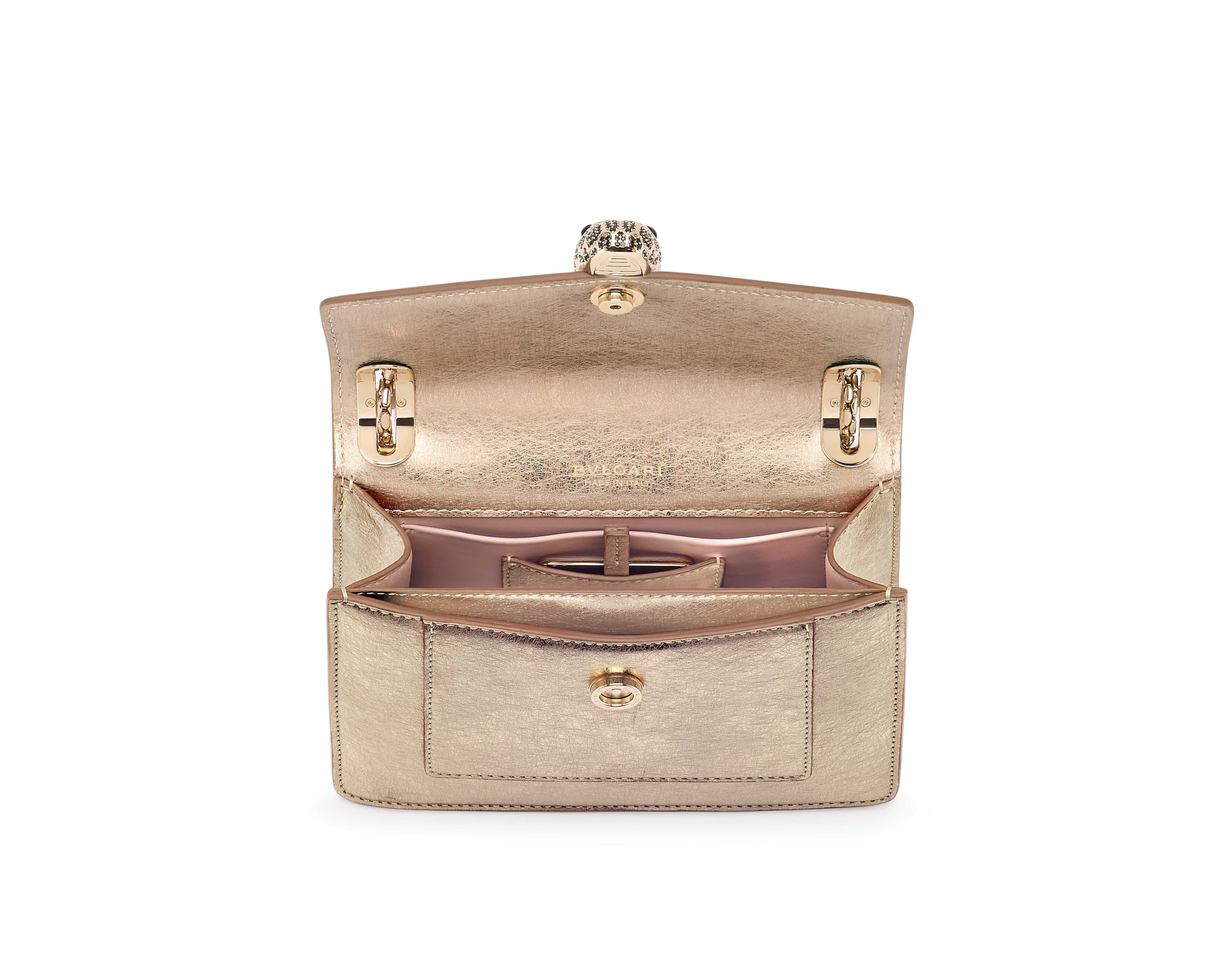 Piccola borsa a spalla Serpenti Forever Day-to-Night in vitello Striated oro chiaro con fodera in nappa rosa cristallo. Accattivante chiusura magnetica Serpenti in ottone placcato oro chiaro con squame con pavé di zirconia nera e occhi in onice nera.