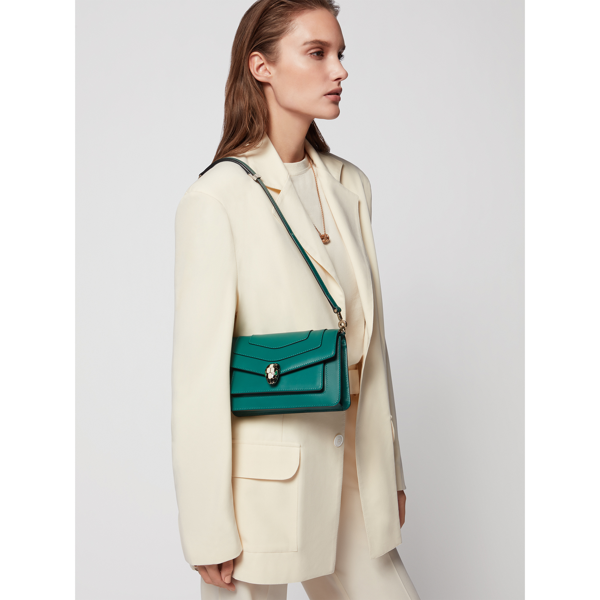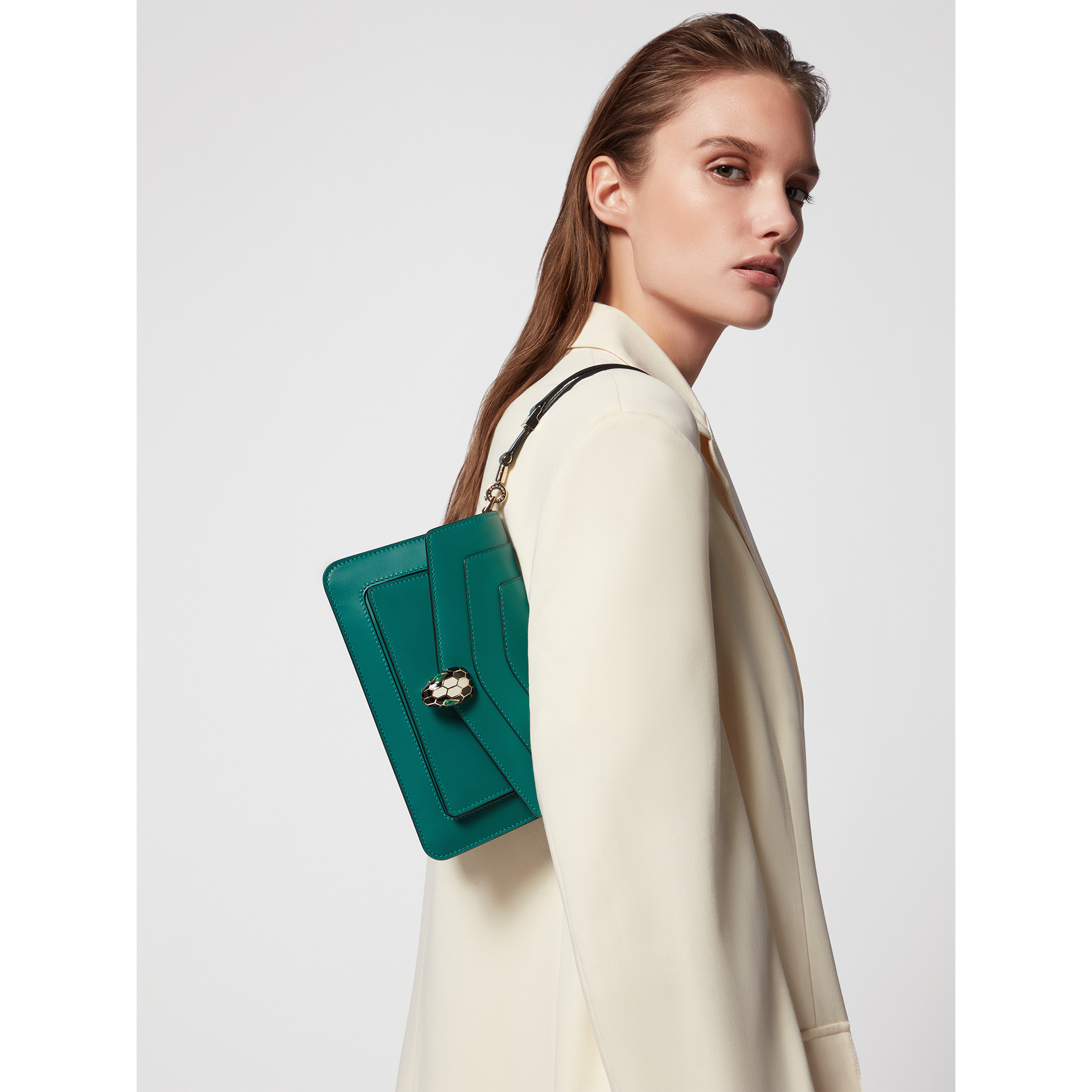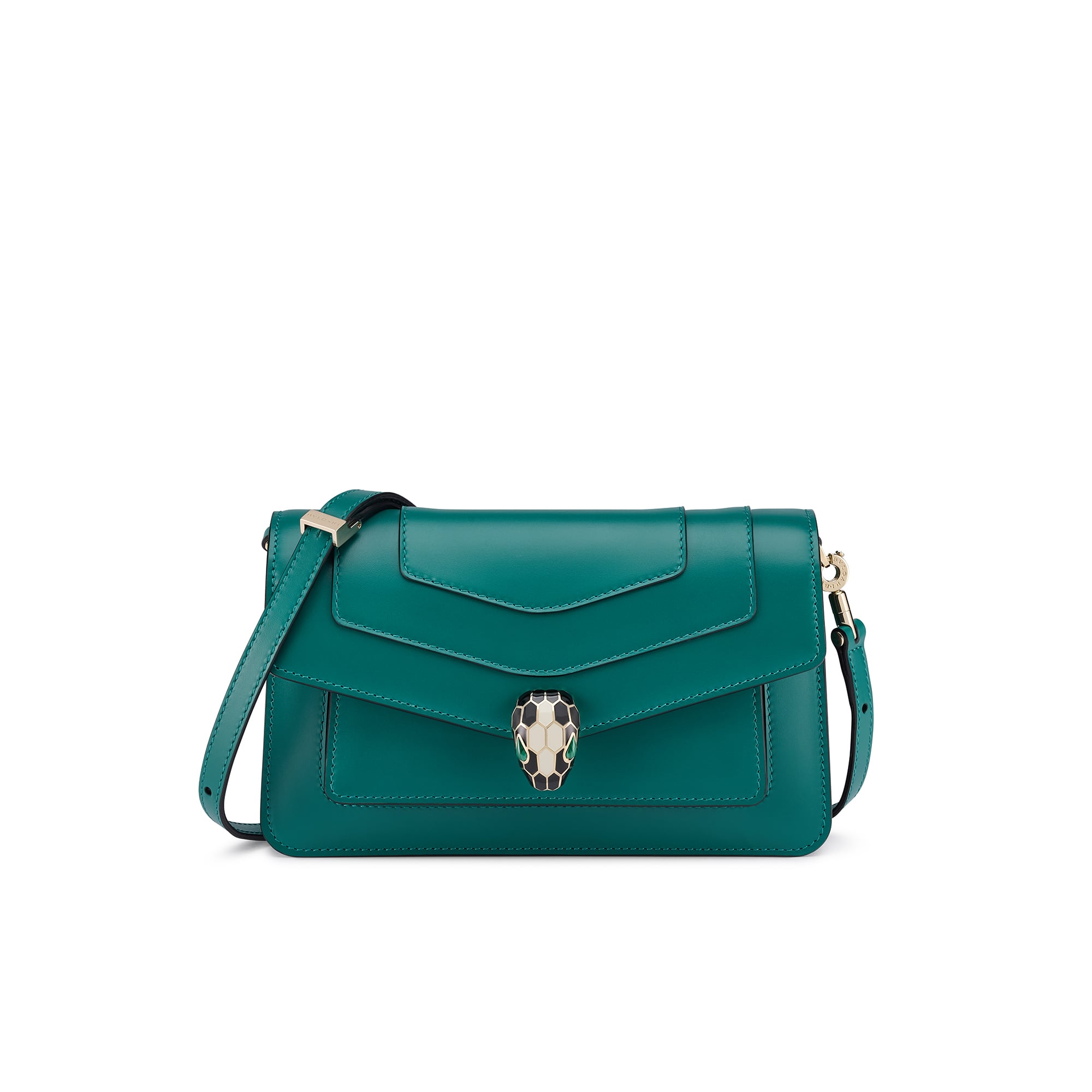 Realizzata in vitello verde smeraldo, la piccola borsa a spalla Serpenti Forever East-West è una raffinata e moderna rivisitazione di un’icona senza tempo. Dotata di una pratica tracolla in pelle, questa versatile borsa da giorno è adornata dall’iconica chiusura magnetica Serpenti, con ammalianti squame ispirate al design dei gioielli Serpenti degli anni 60. Composto da uno scomparto singolo, il modello è completato da tasca frontale, tasca posteriore applicata, tasca interna, tre scomparti per carte, specchietto personalizzabile e logo BULGARI in metallo sul retro. Una creazione interamente realizzata in Italia. 22 x 13 x 5,5 cm