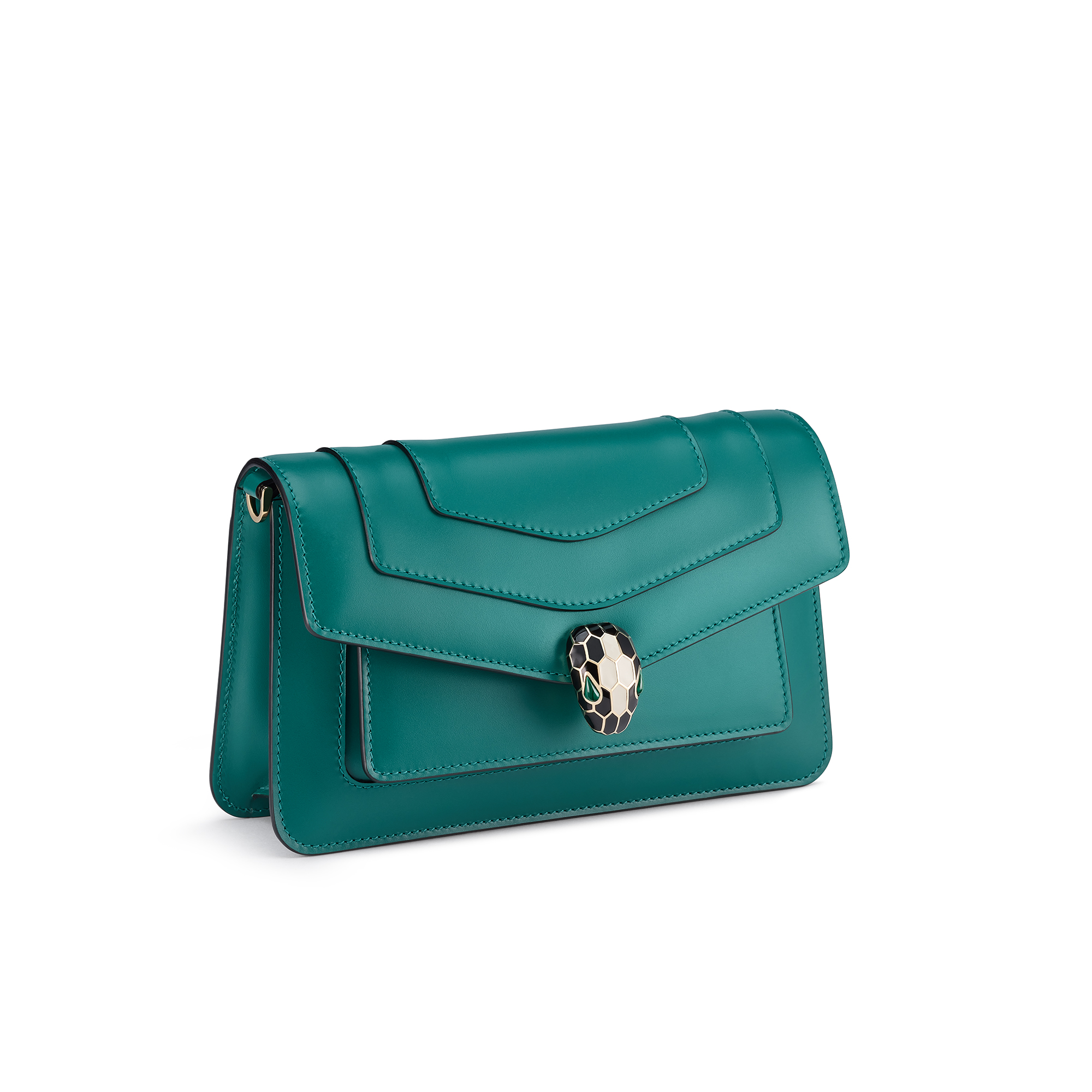 Piccola borsa a spalla Serpenti Forever East-West in vitello verde smeraldo con fodera in gros-grain viola ametista. Accattivante chiusura magnetica Serpenti in ottone placcato oro chiaro con squame in smalto nero e bianco agata e occhi in malachite verde.