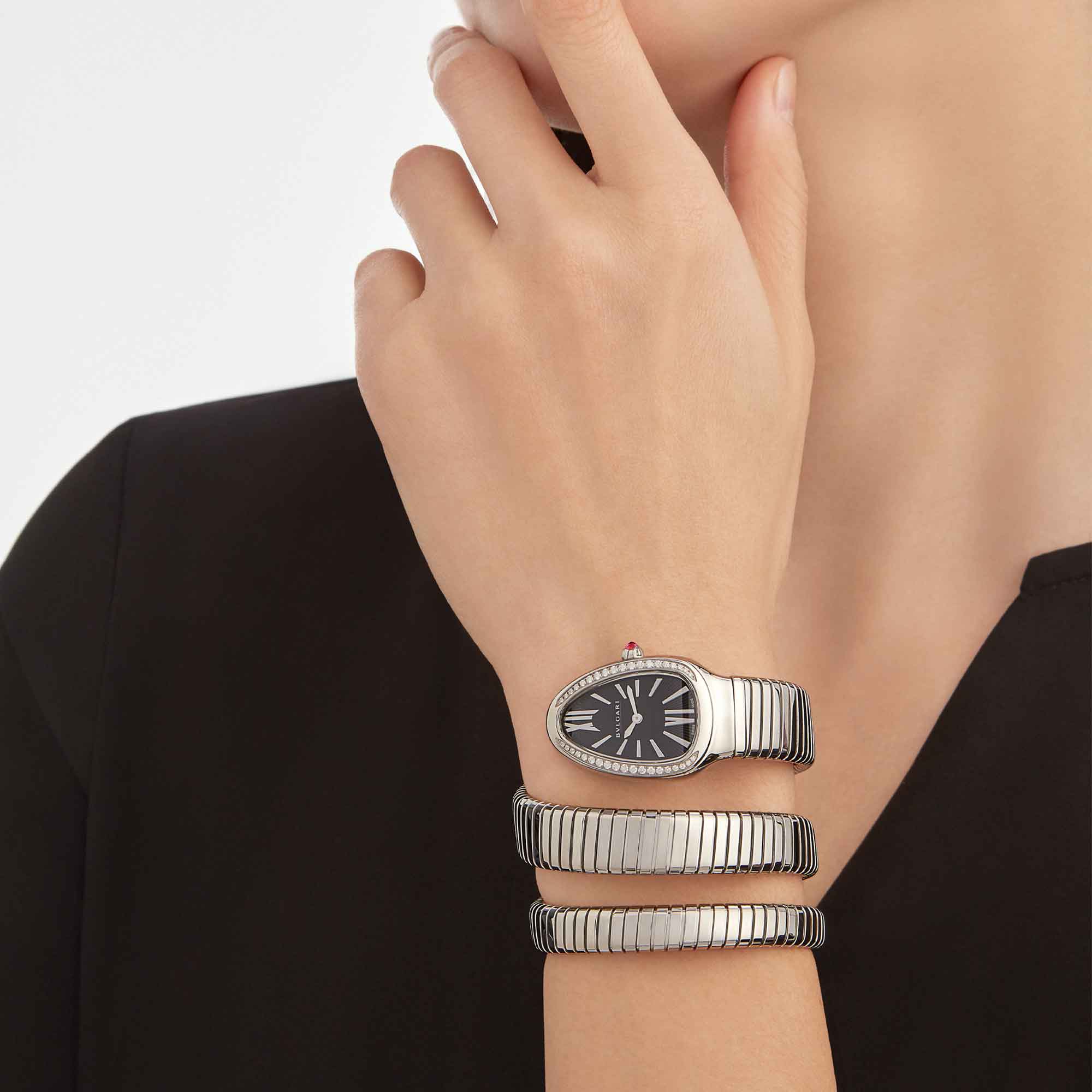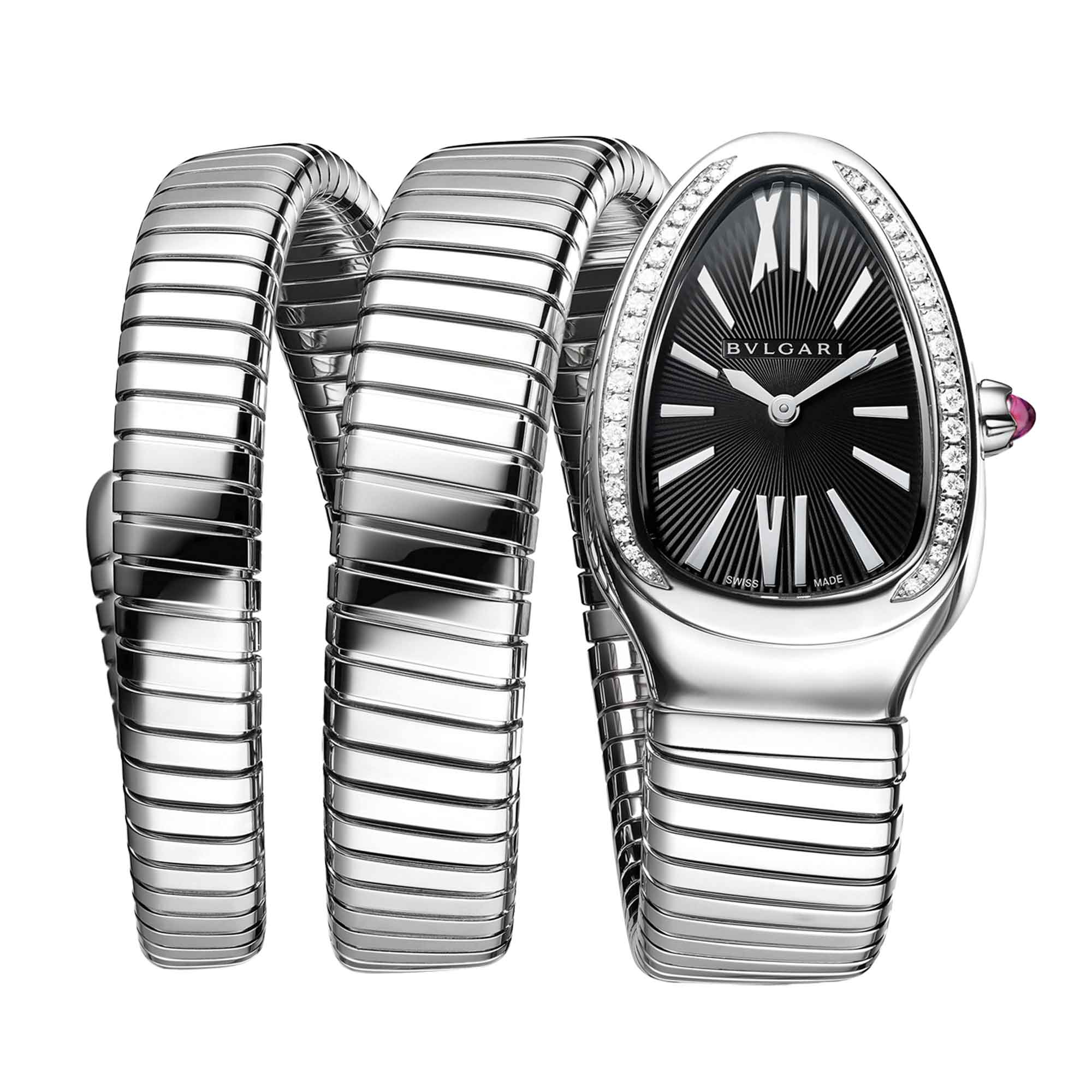 Orologio Serpenti Tubogas con movimento al quarzo, cassa curva di 35 mm in acciaio inossidabile e lunetta con 38 diamanti tondi taglio brillante (circa 0,29 ct), corona in acciaio inossidabile con rubellite taglio cabochon (0,108 ct), quadrante nero con finiture guilloché soleil e bracciale a doppia spirale in acciaio inossidabile. Impermeabile fino a 30 metri.